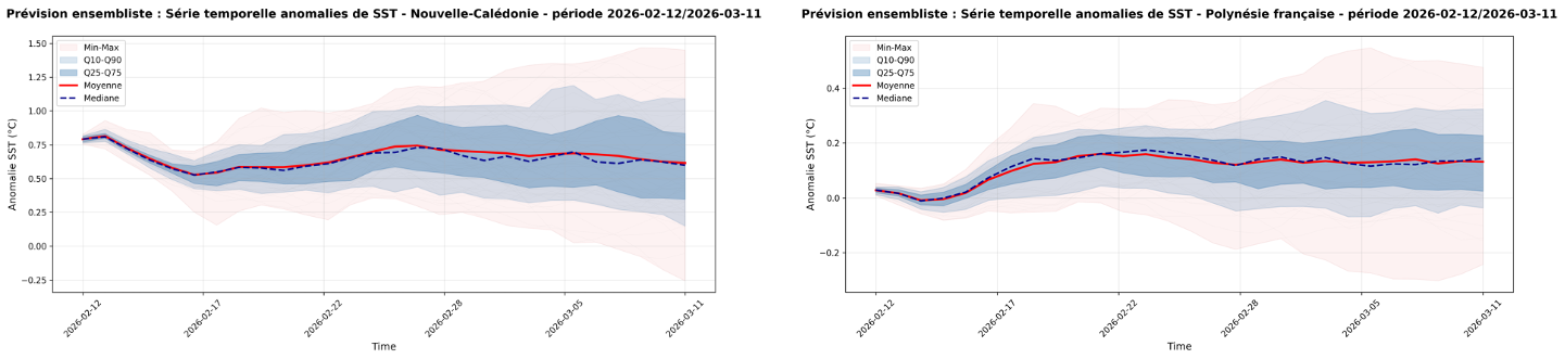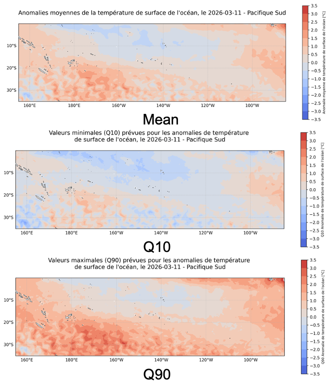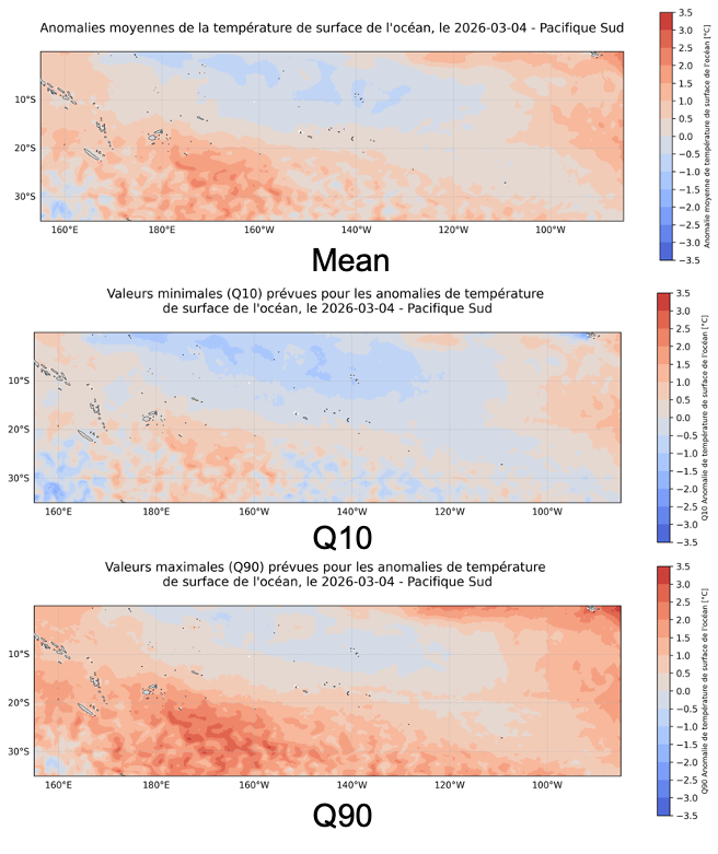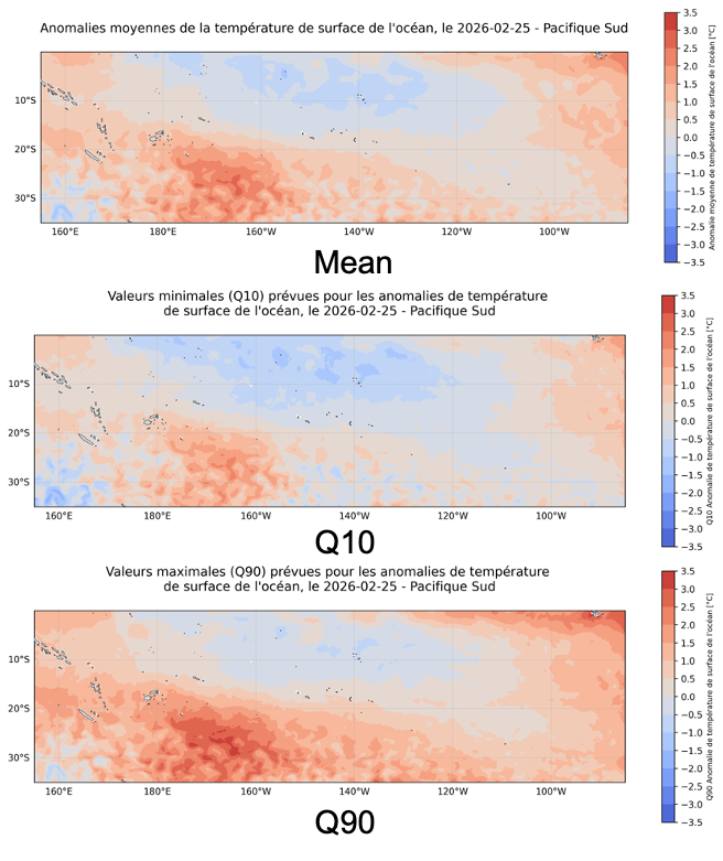 Les cartes ci-dessous indiquent les fourchettes basses (Quantile Q10 de l’ensemble des valeurs prévues) et hautes (Quantile Q90) des anomalies de températures de surface de l’océan, susceptibles de concerner la Nouvelle-Calédonie et la Polynésie Française.