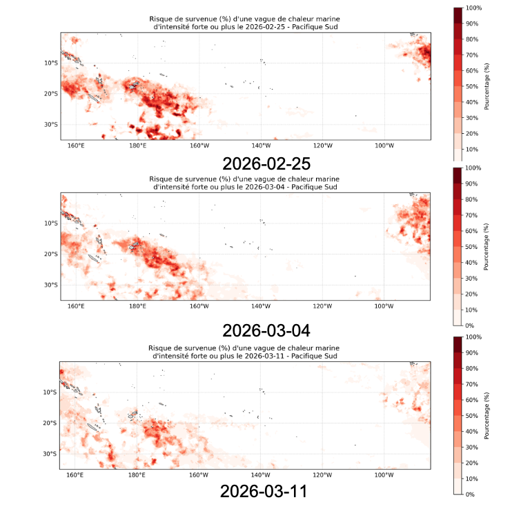 NC : Risques significatifs de MHW fortes pour ces 3 échéances. Les risques les plus élevés se trouvent au Nord Ouest. Comparés au run précédent, les risques au Sud Est de la NC ont diminué voire disparu pour les échéances du 02/25 et de 03/04.