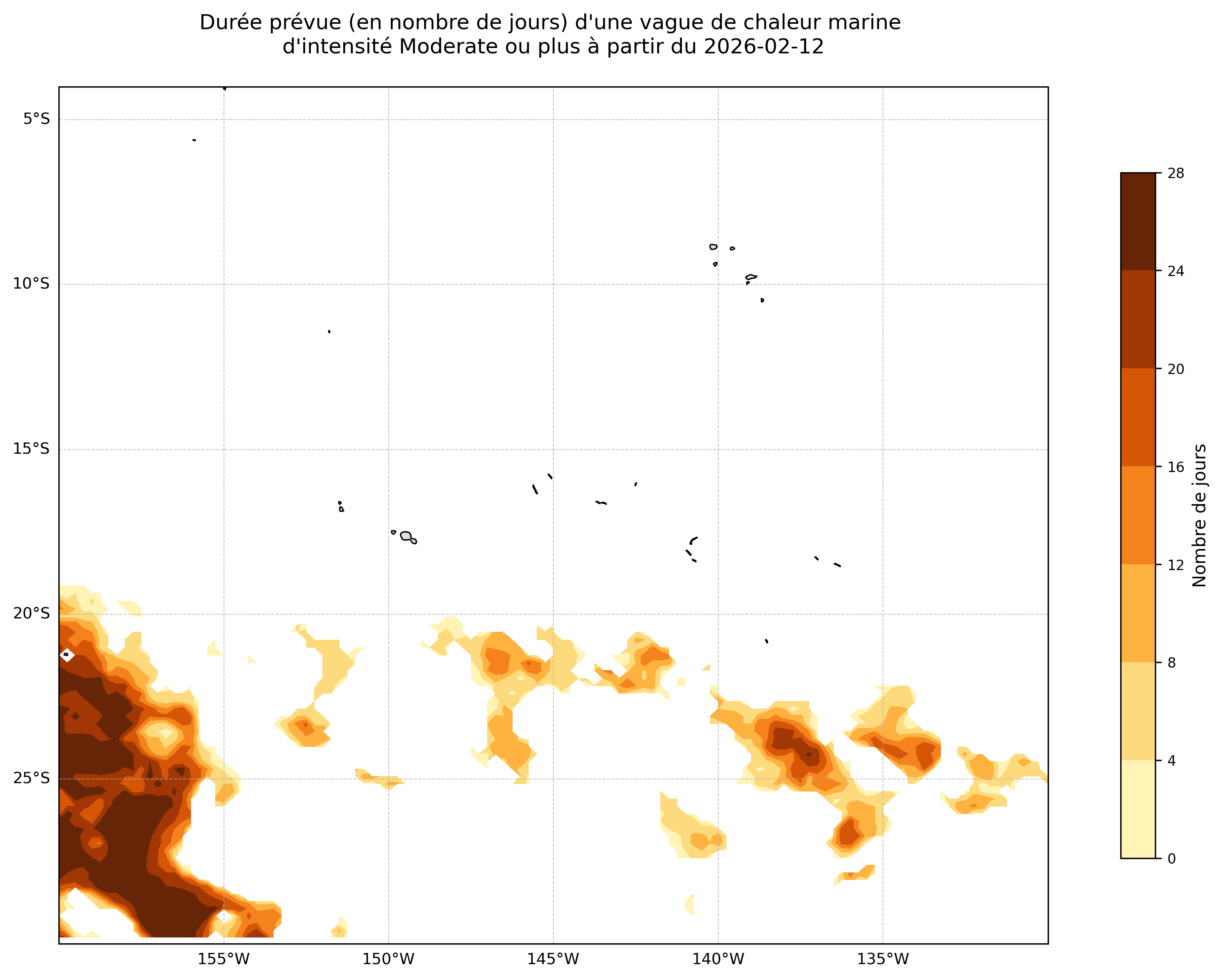 Sur les cartes ci-dessus, les plages de couleurs indiquent la durée potentielle en jours qu’une vague de chaleur marine d’intensité modérée, sévère, extrême ou plus surviennent en chaque point du domaine.