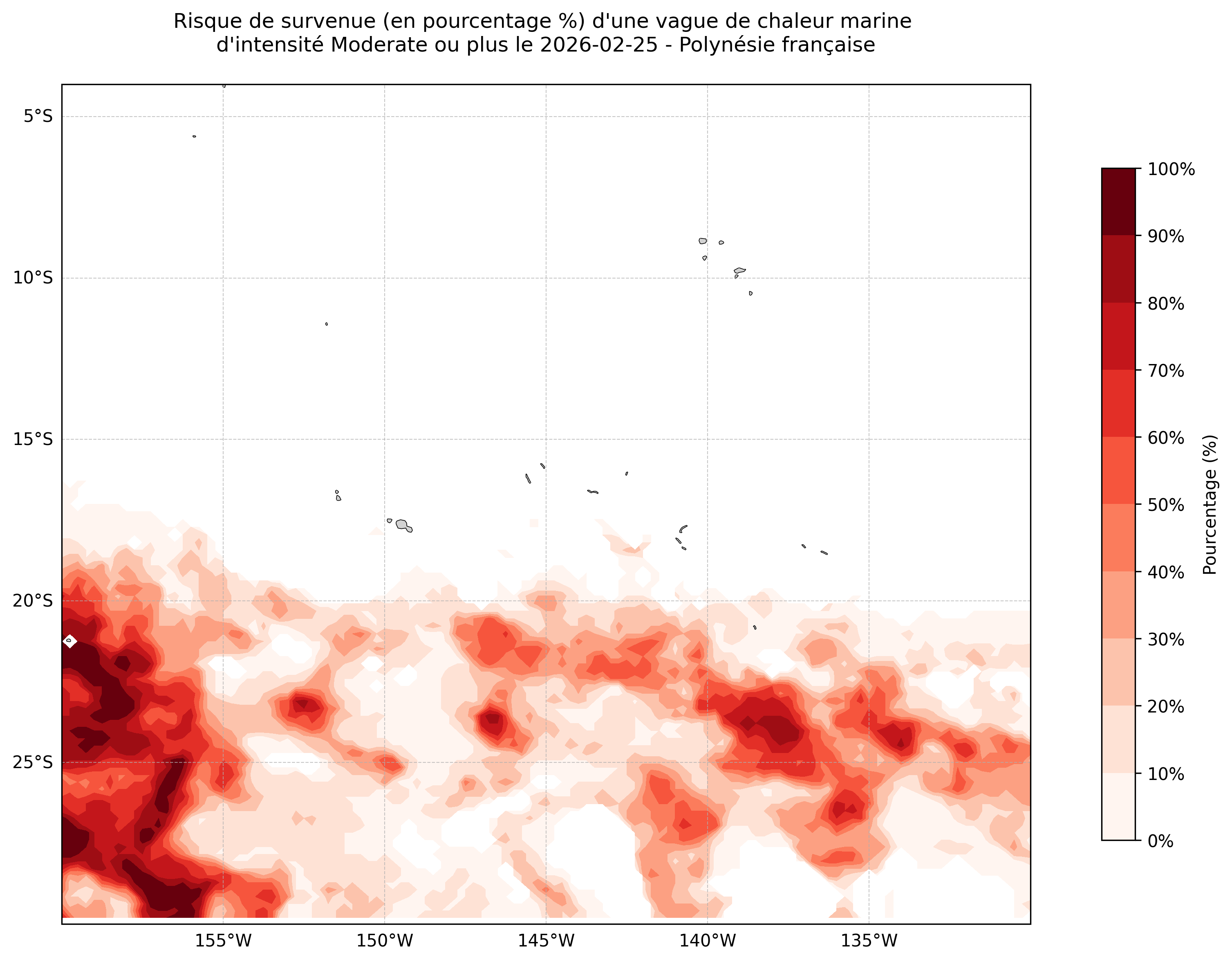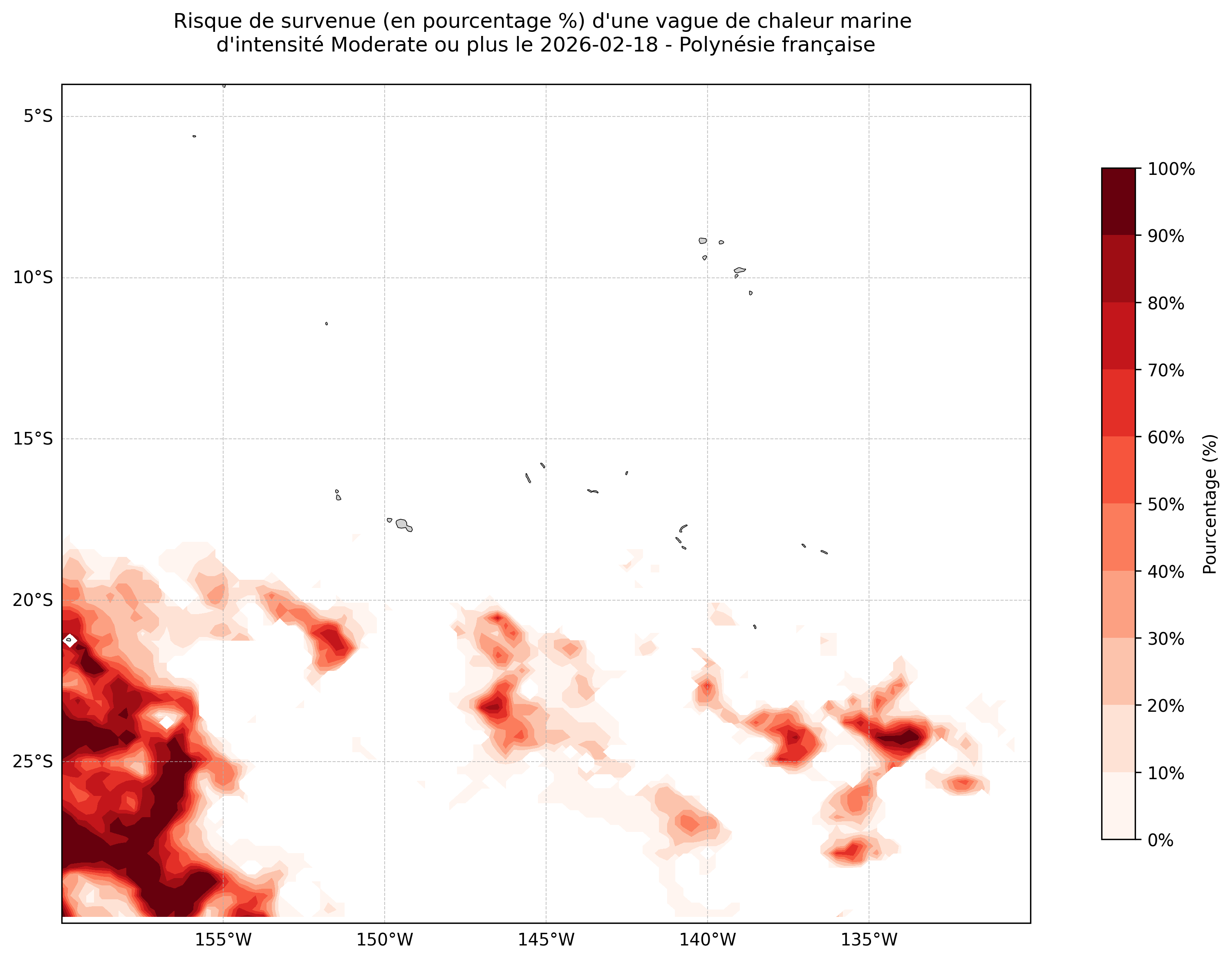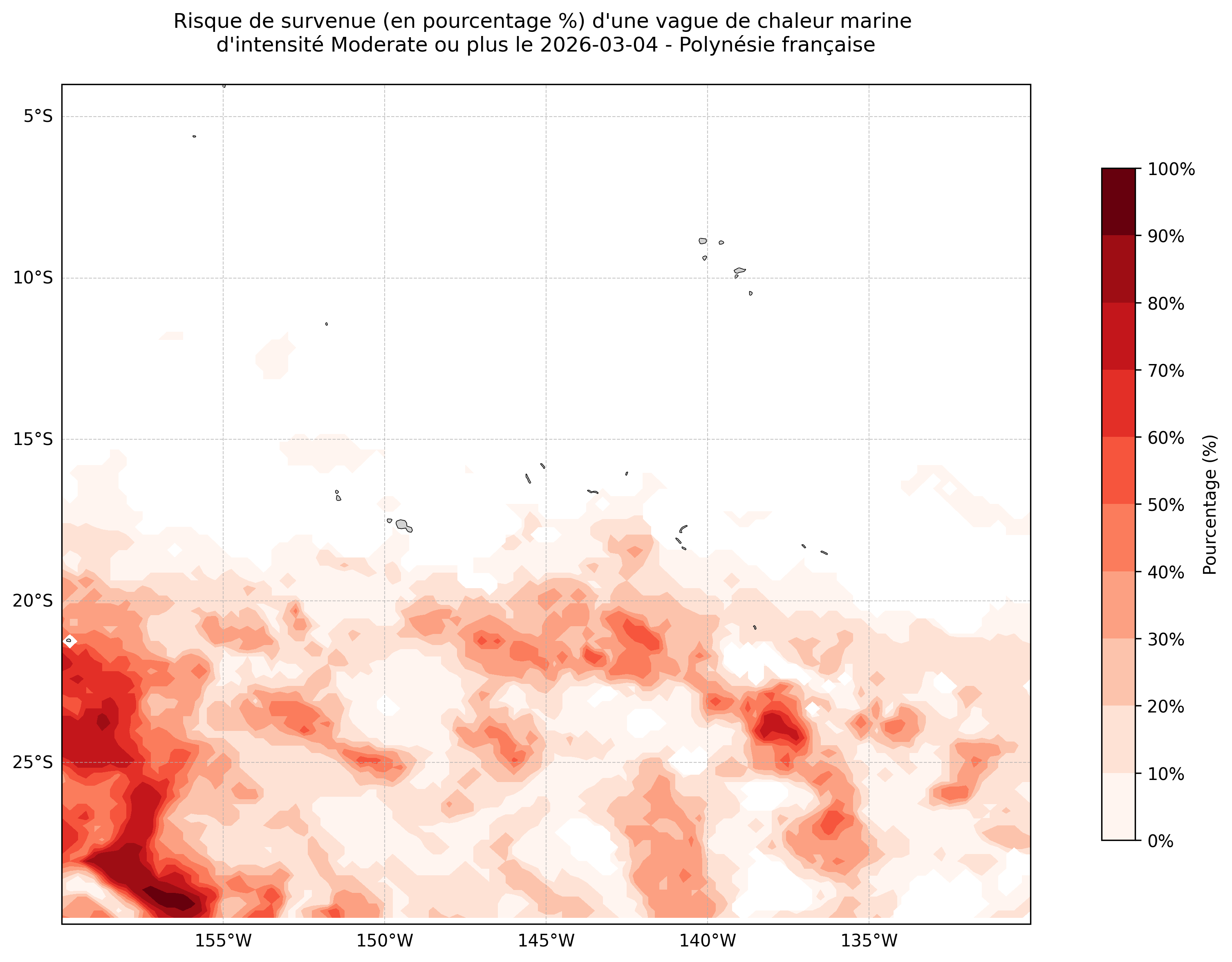 Sur les cartes ci-dessus, les plages de couleurs indiquent la probabilité qu’une vague de chaleur marine d’intensité modérée ou plus survienne en chaque point du domaine.
