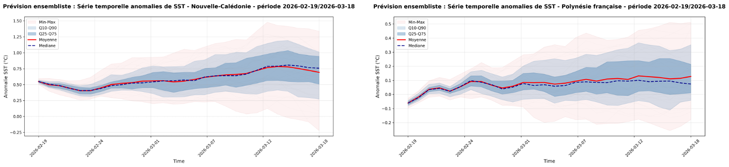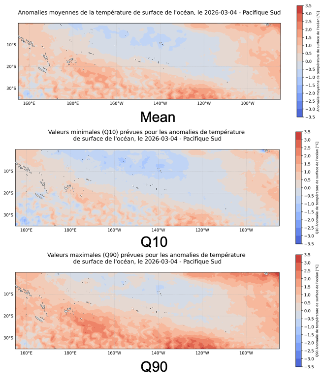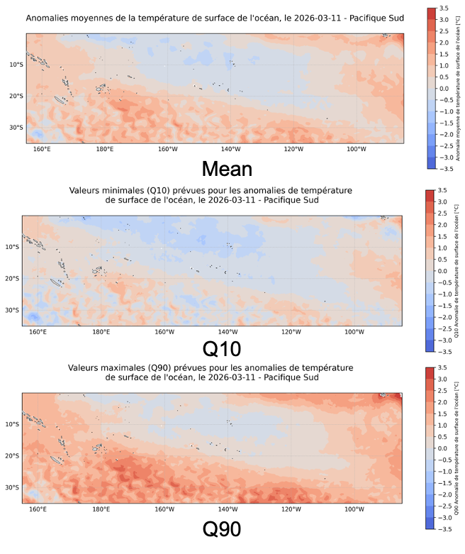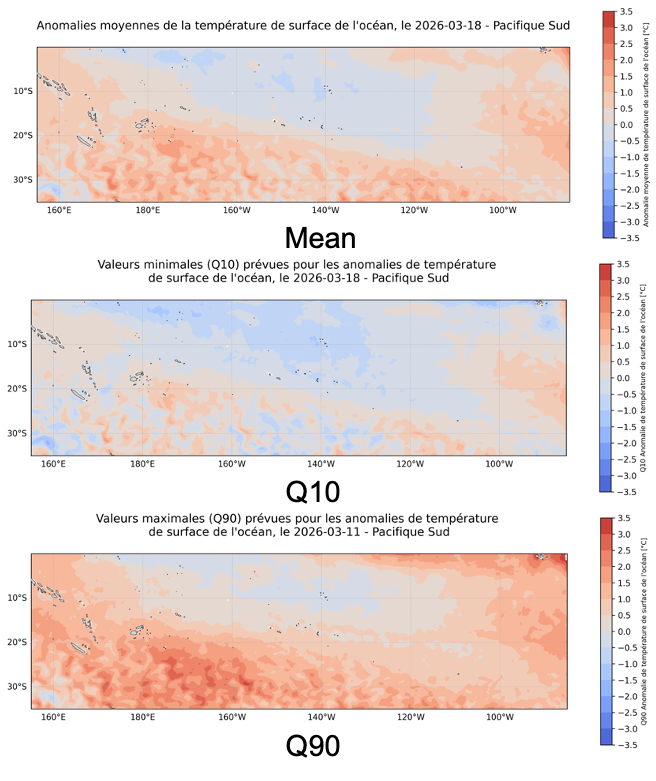 Les cartes ci-dessous indiquent les fourchettes basses (Quantile Q10 de l’ensemble des valeurs prévues) et hautes (Quantile Q90) des anomalies de températures de surface de l’océan, susceptibles de concerner la Nouvelle-Calédonie et la Polynésie Française.