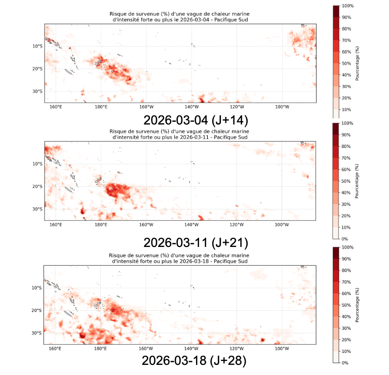 NC : J+14 – risques (<40%) de MHW au Nord Ouest Risques plus importants (atteignant par endroits les 80%) à l’Est, entre 175°E et 165°W. Pour J+21 et J+28, des patchs épars de rsique MHW fortes ou plus apparaissent autour de la NC, avec notamment des risques significatifs au Sud et Sud Est de la NC pour J+28, ou les valeurs sont entre 50% et 90% localement.