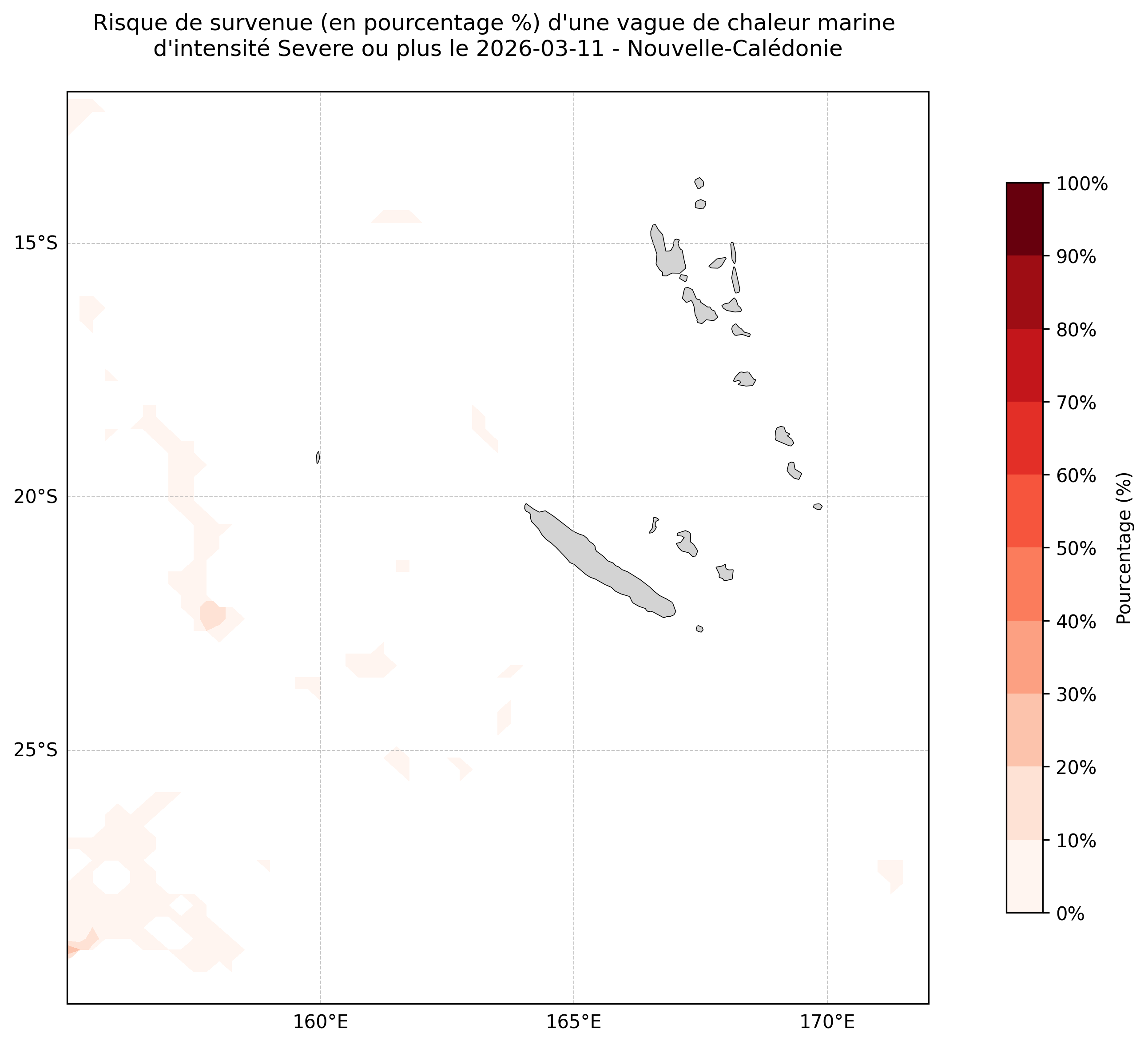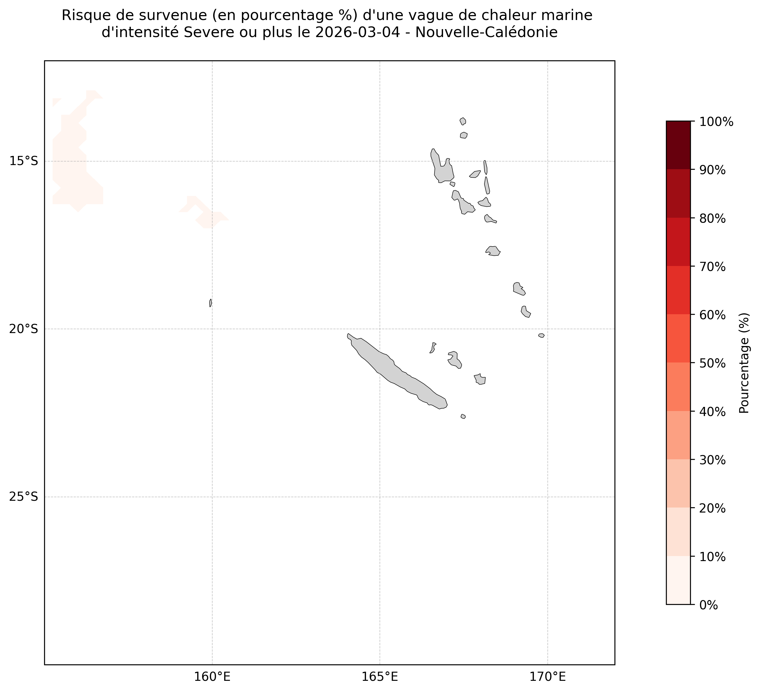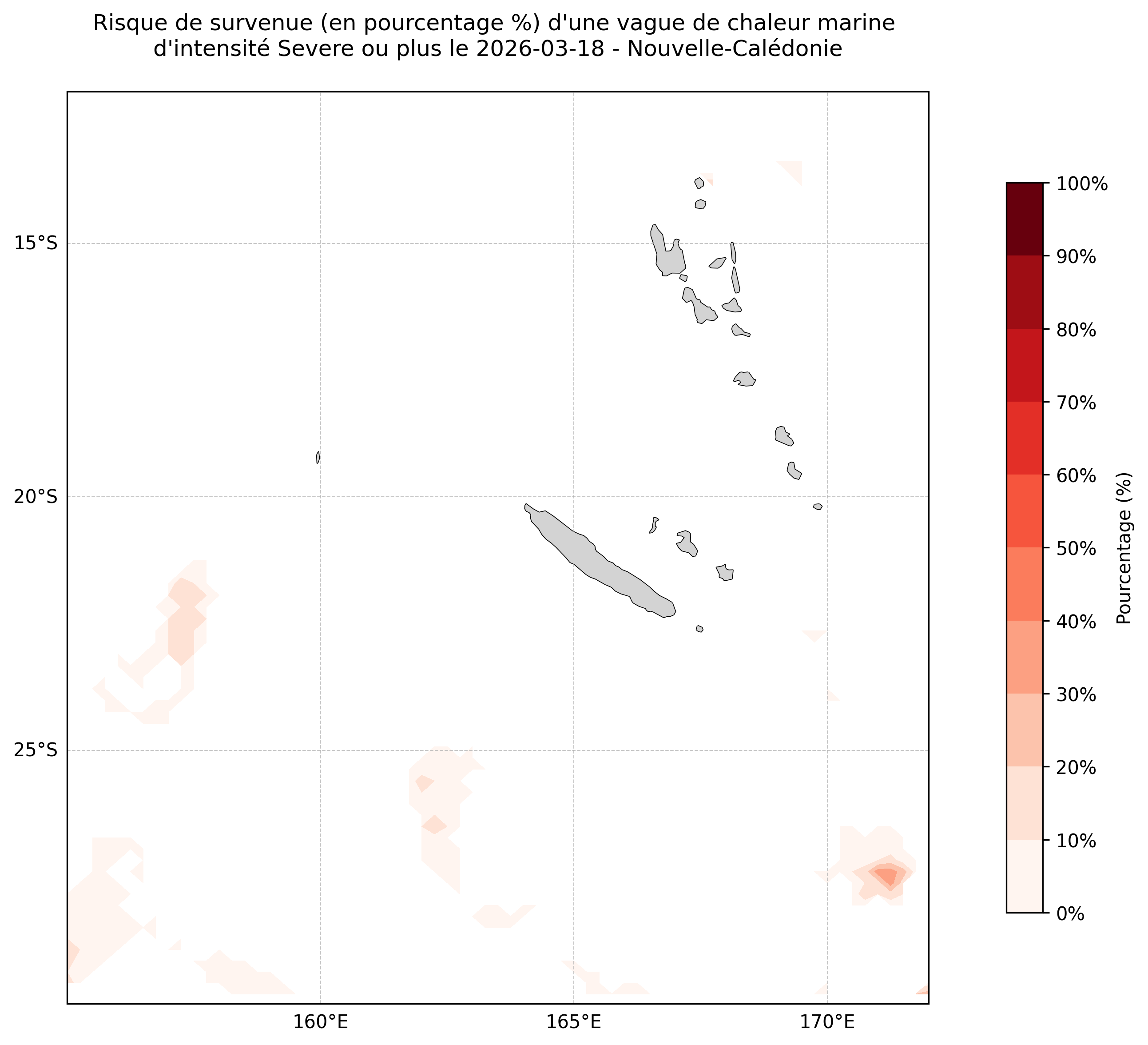 Sur les cartes ci-dessus, les plages de couleurs indiquent la probabilité qu’une vague de chaleur marine d’intensité sévère ou plus survienne en chaque point du domaine.
