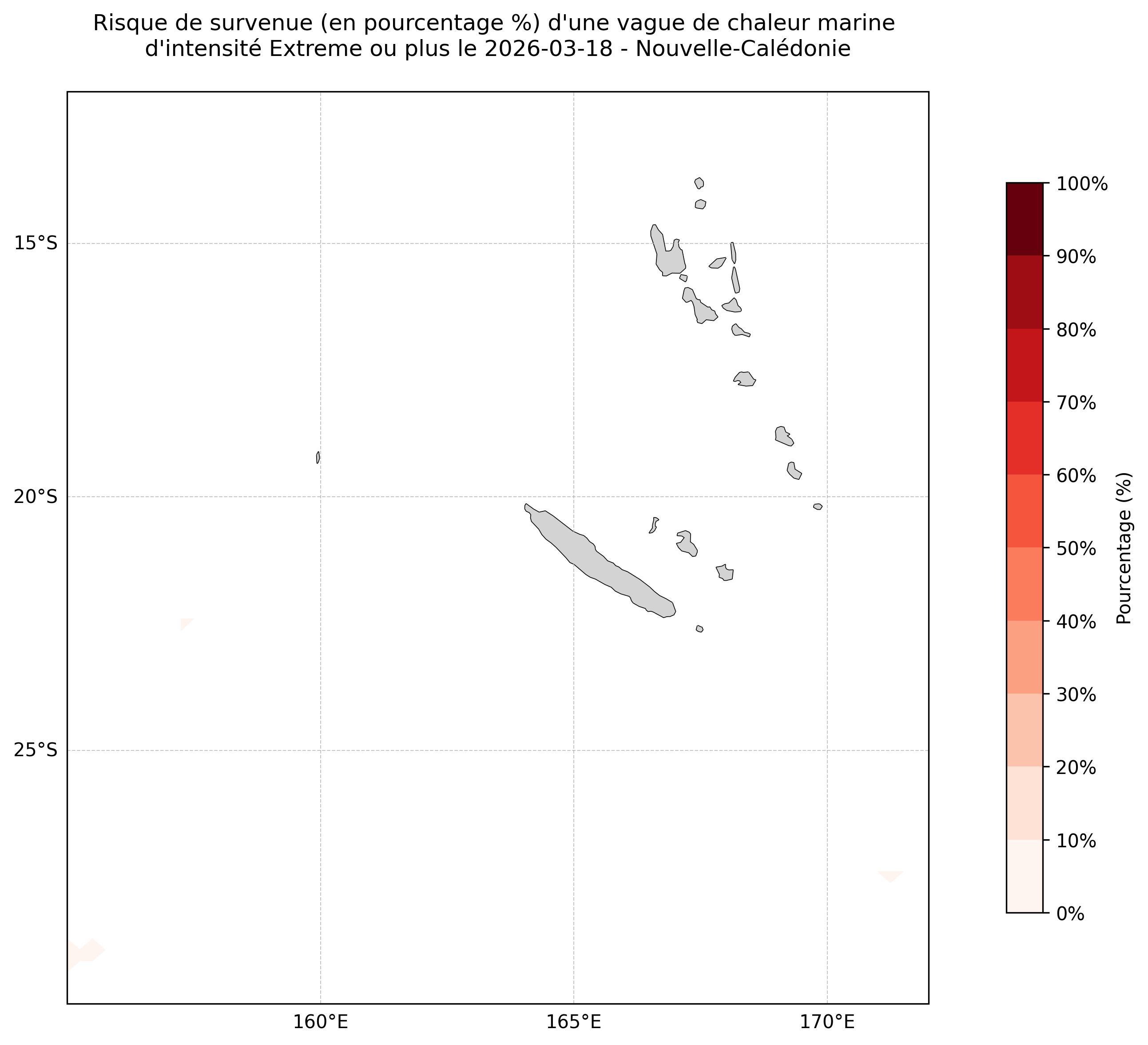 Sur les cartes ci-dessus, les plages de couleurs indiquent la probabilité qu’une vague de chaleur marine d’intensité extrême ou plus survienne en chaque point du domaine.