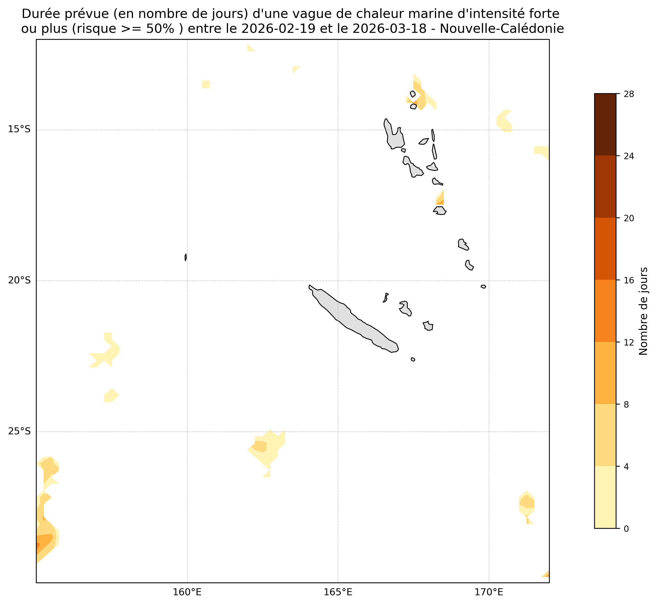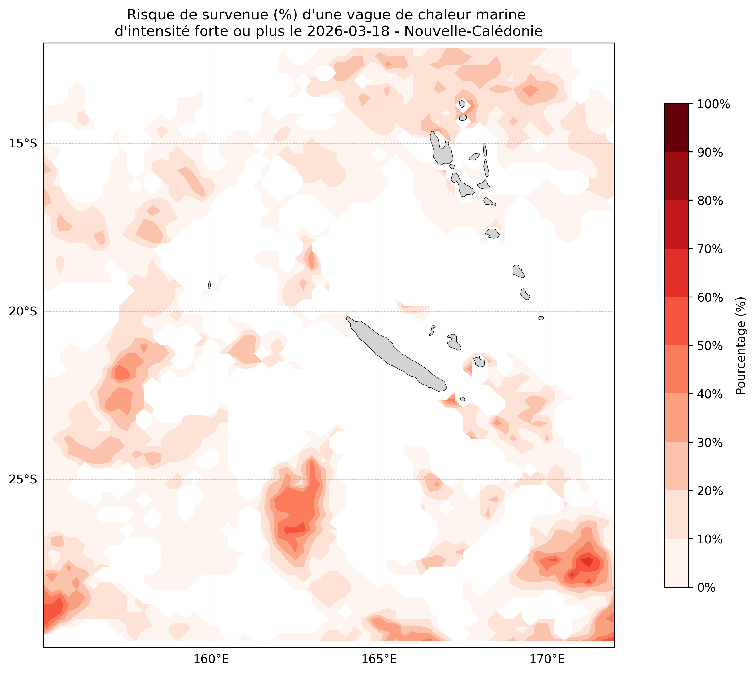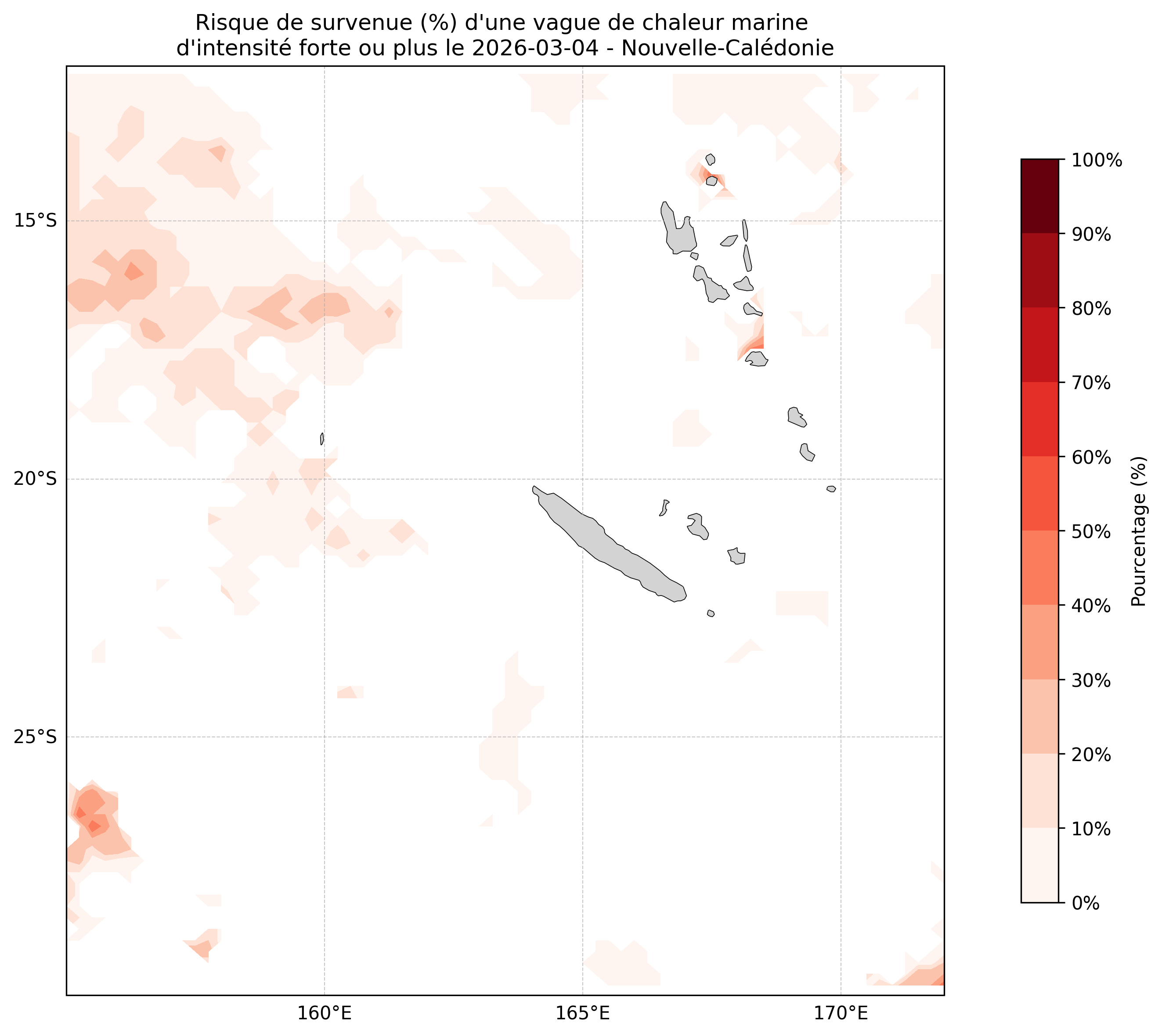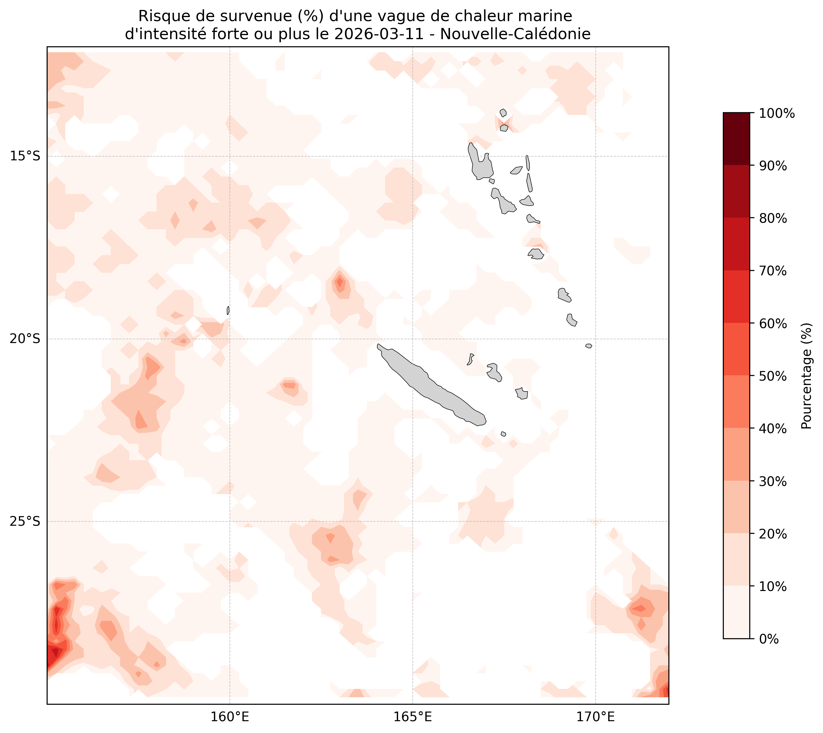 Sur les cartes ci-dessus, les plages de couleurs indiquent la probabilité qu’une vague de chaleur marine d’intensité forte ou plus survienne en chaque point du domaine.