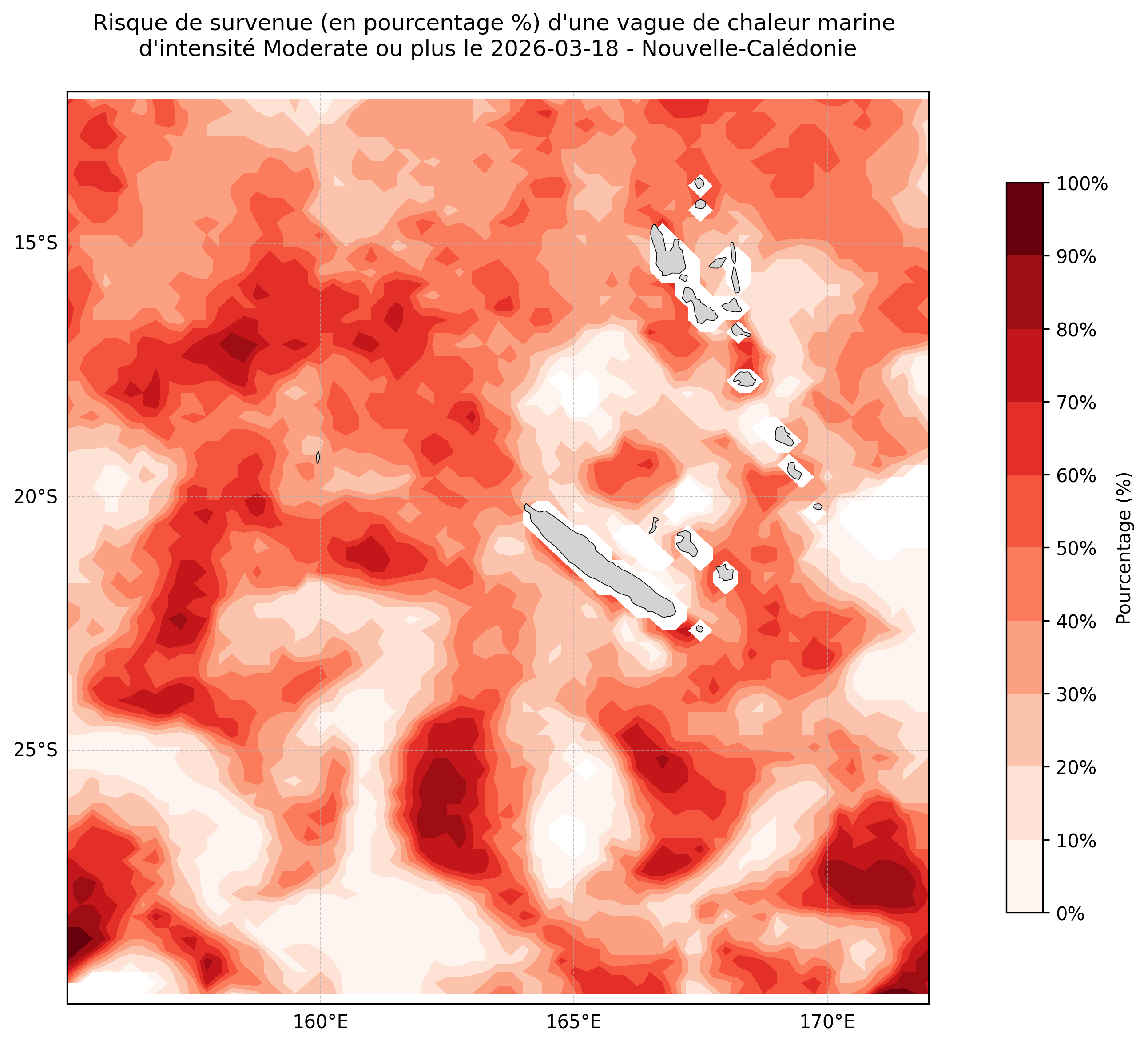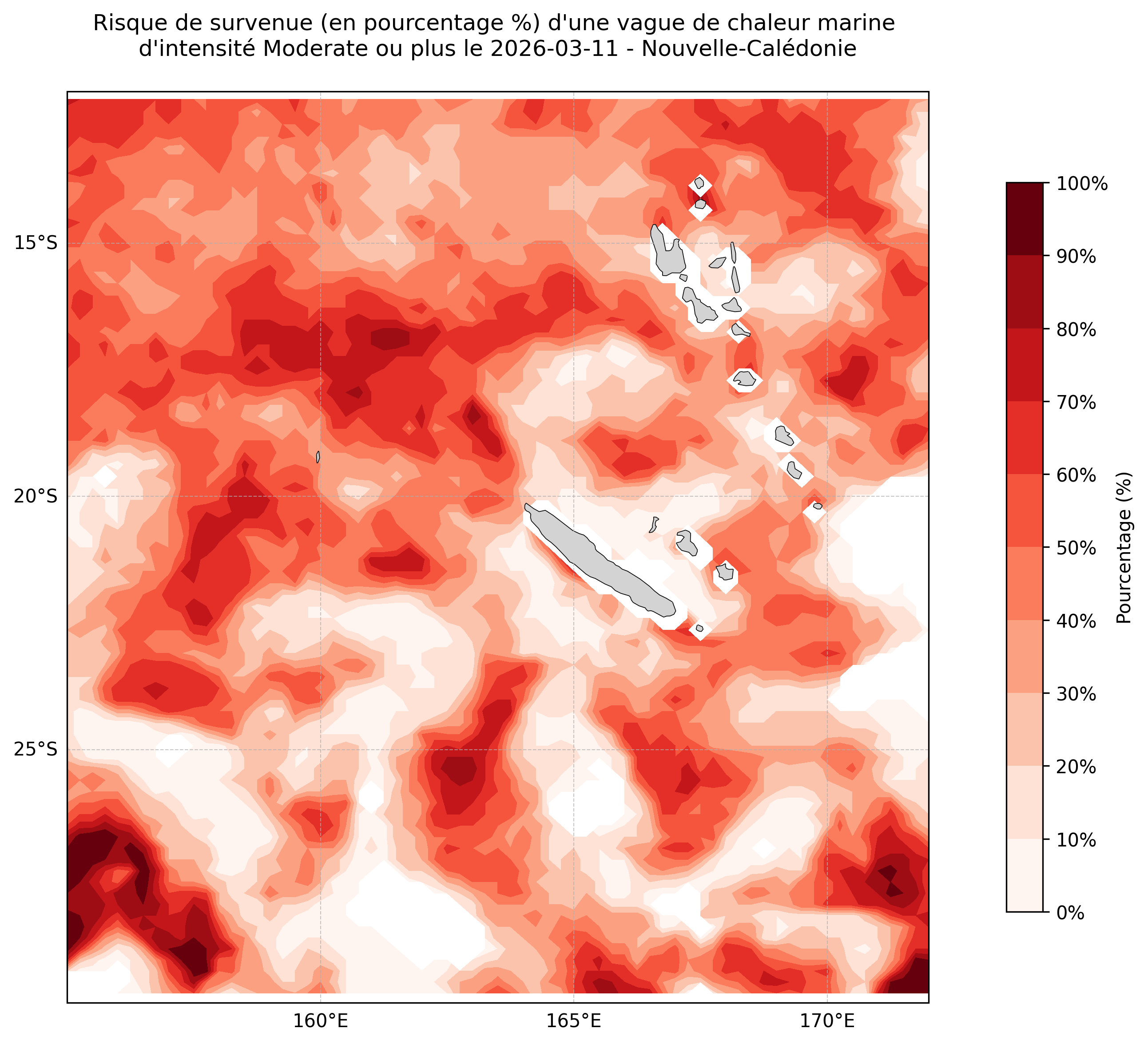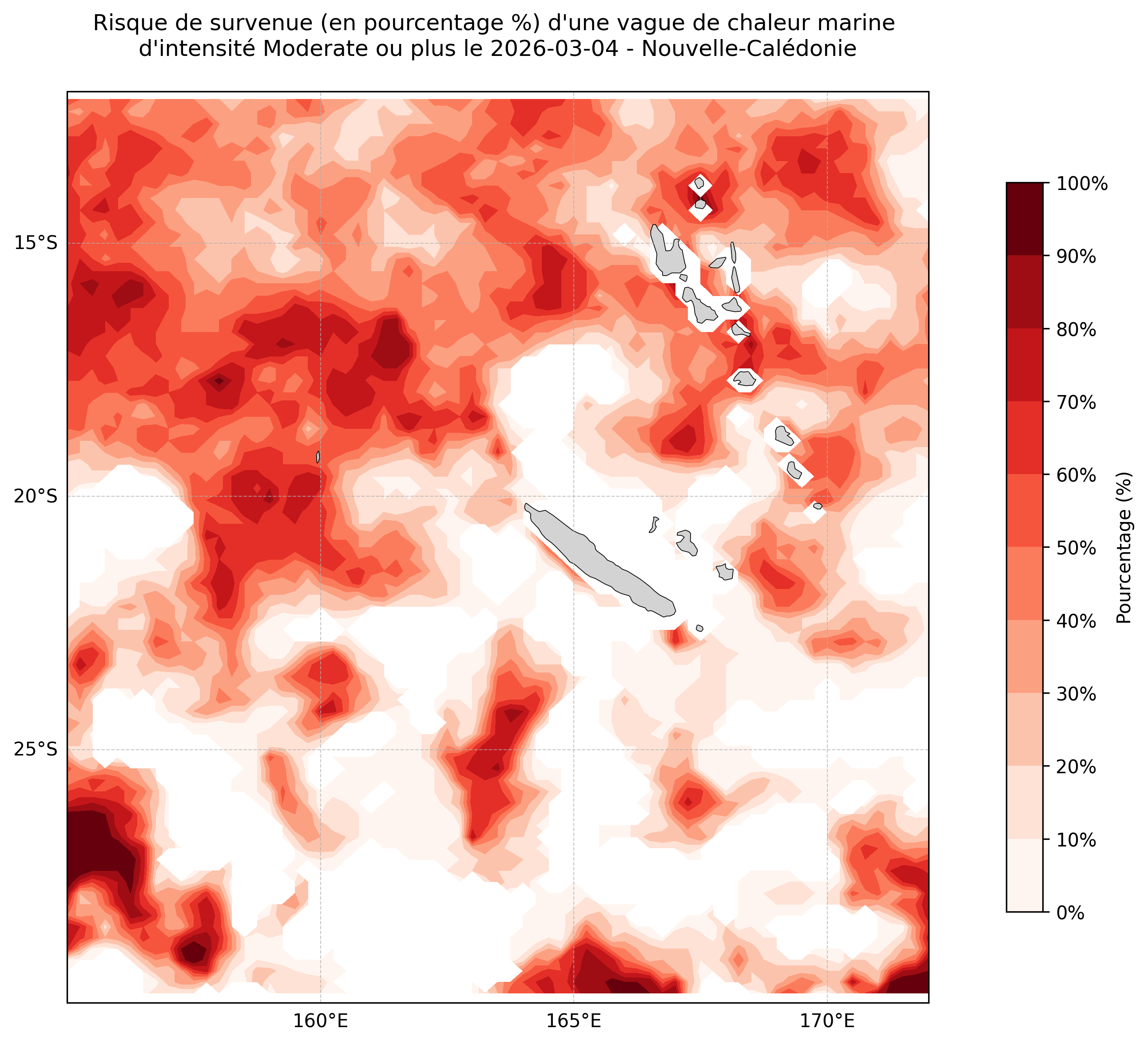 Sur les cartes ci-dessus, les plages de couleurs indiquent la probabilité qu’une vague de chaleur marine d’intensité modérée ou plus survienne en chaque point du domaine.