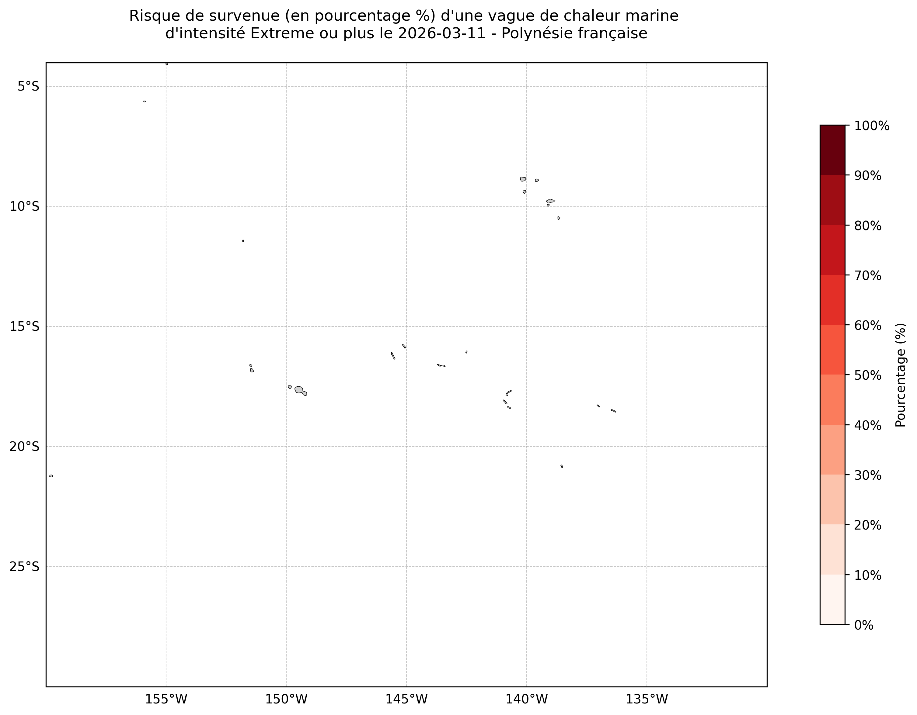 Sur les cartes ci-dessus, les plages de couleurs indiquent la probabilité qu’une vague de chaleur marine d’intensité extrême ou plus survienne en chaque point du domaine.