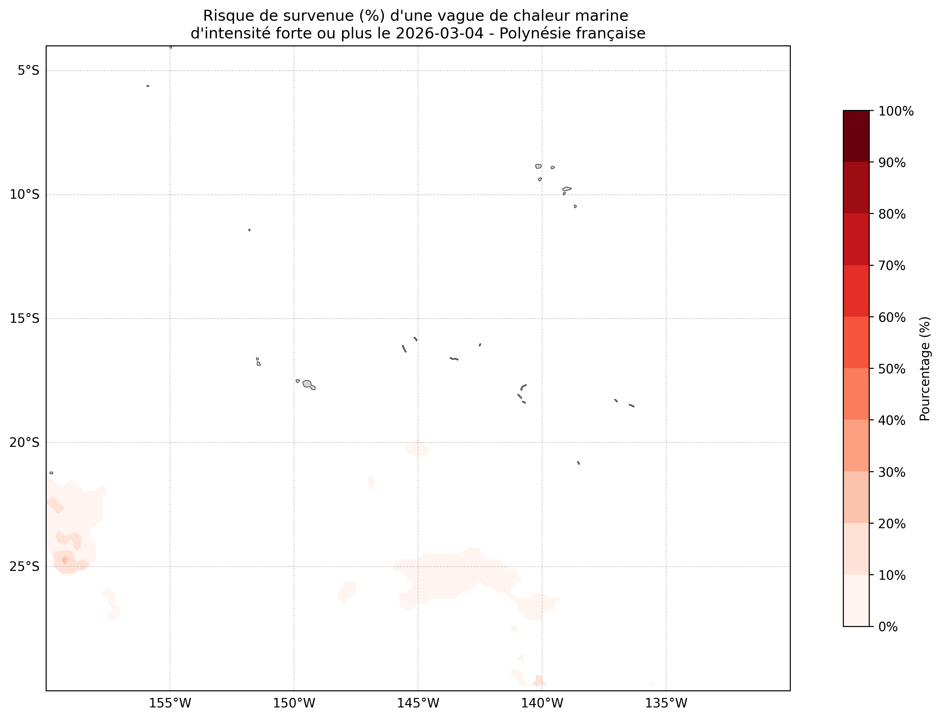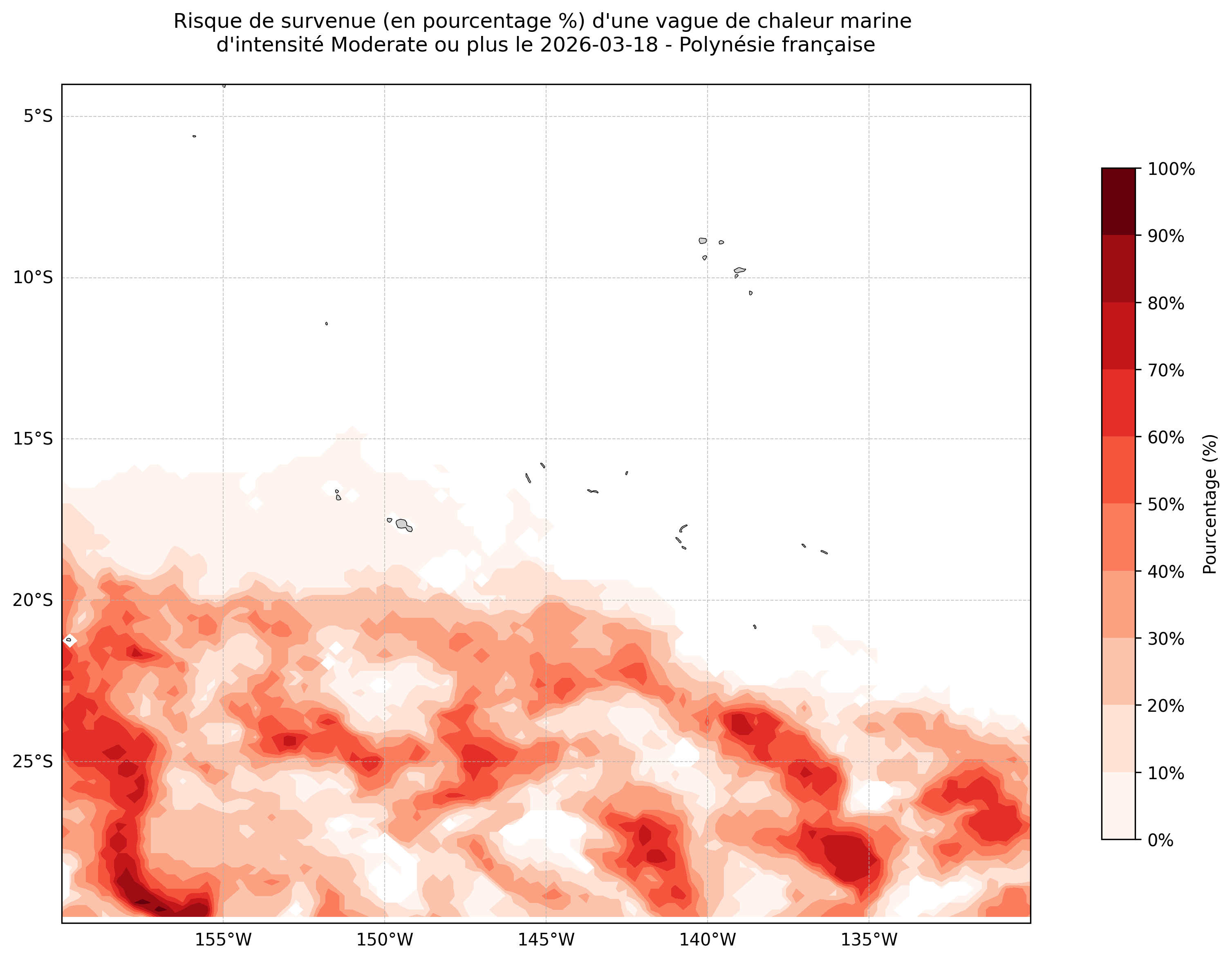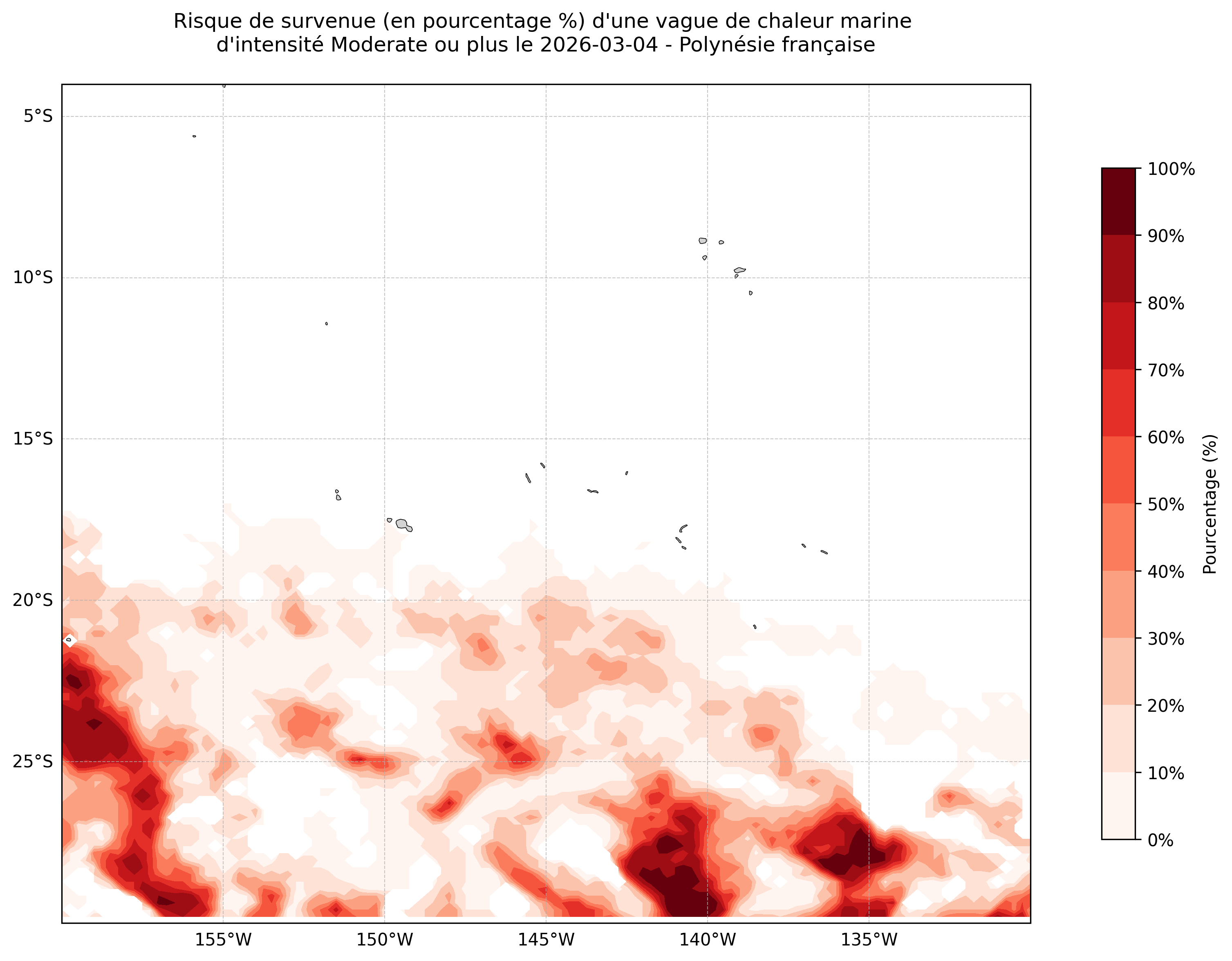 Sur les cartes ci-dessus, les plages de couleurs indiquent la probabilité qu’une vague de chaleur marine d’intensité modérée ou plus survienne en chaque point du domaine.