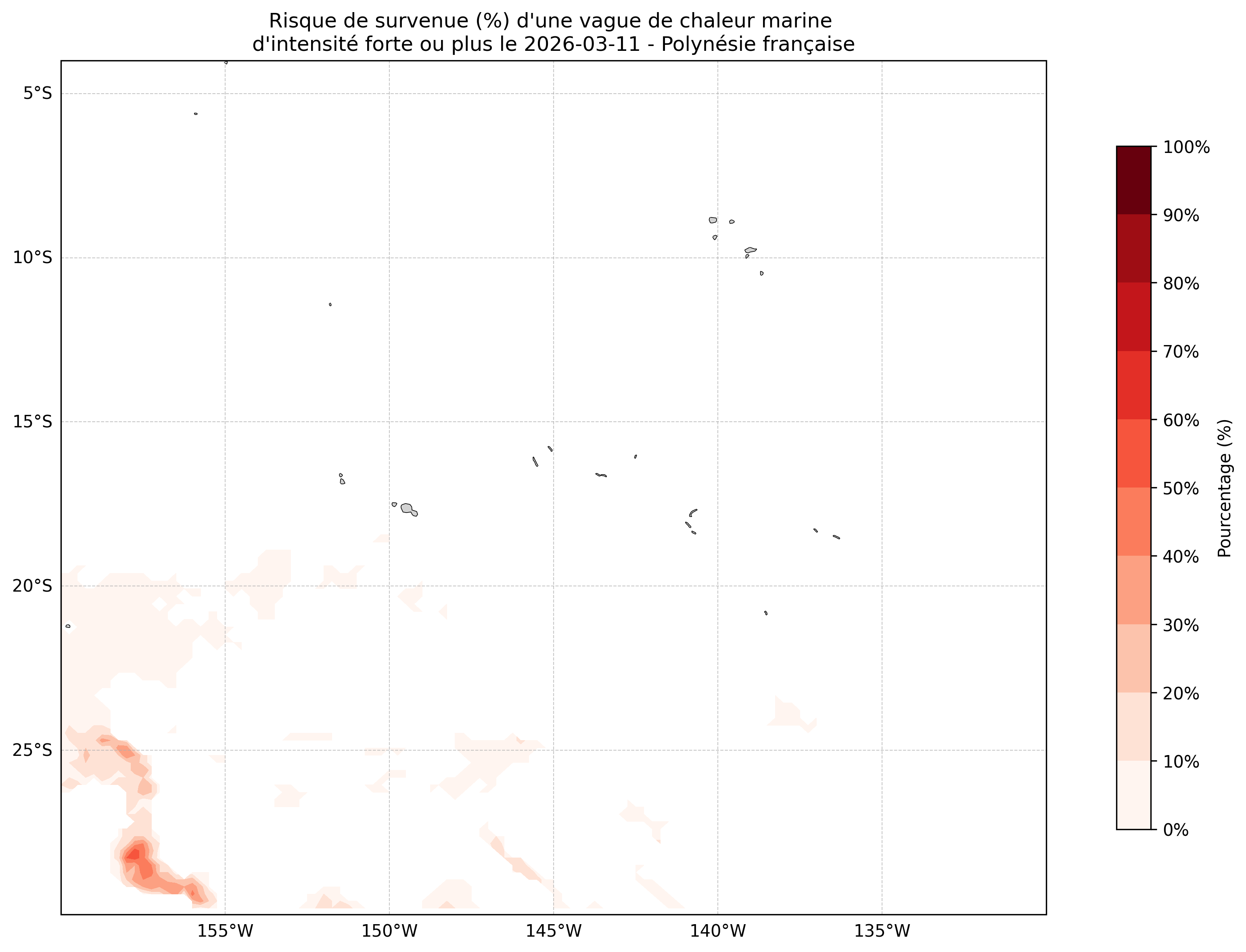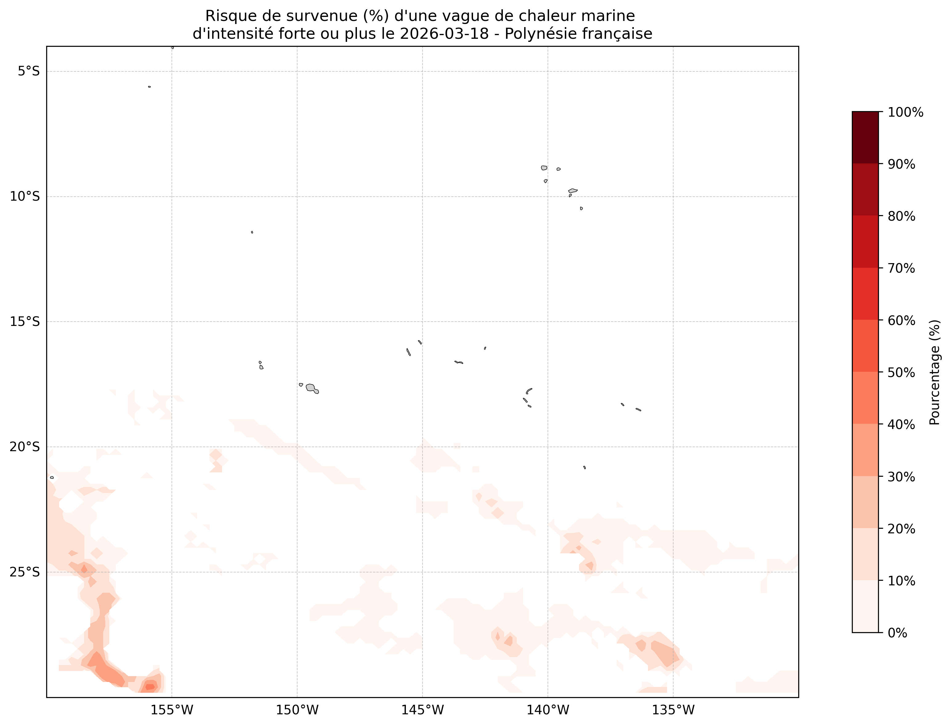 Sur les cartes ci-dessus, les plages de couleurs indiquent la probabilité qu’une vague de chaleur marine d’intensité forte ou plus survienne en chaque point du domaine.