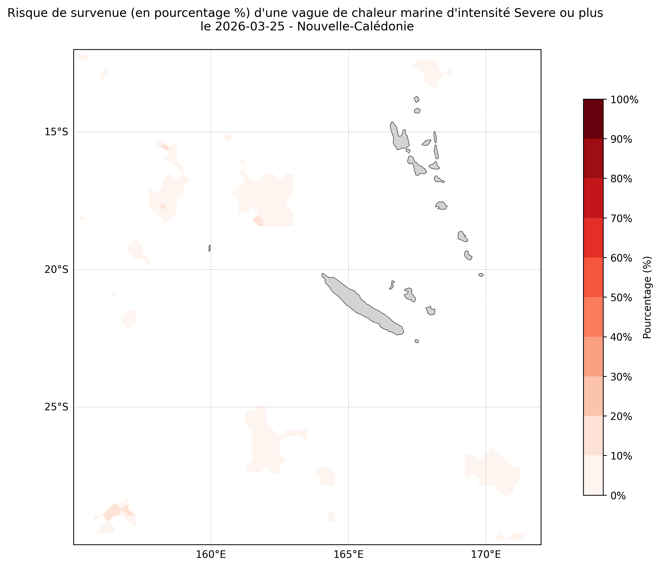 Sur les cartes ci-dessus, les plages de couleurs indiquent la probabilité qu’une vague de chaleur marine d’intensité sévère ou plus survienne en chaque point du domaine.