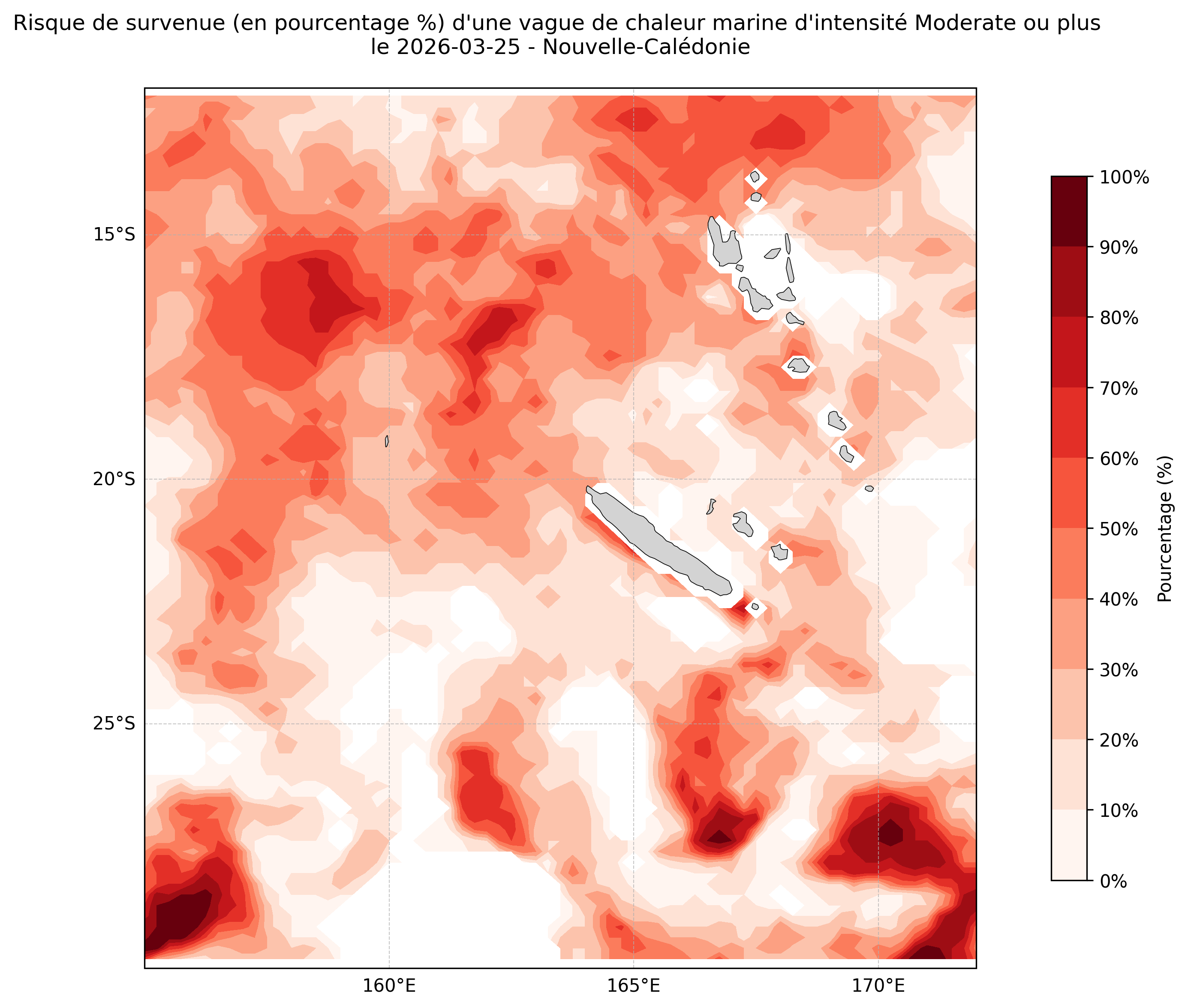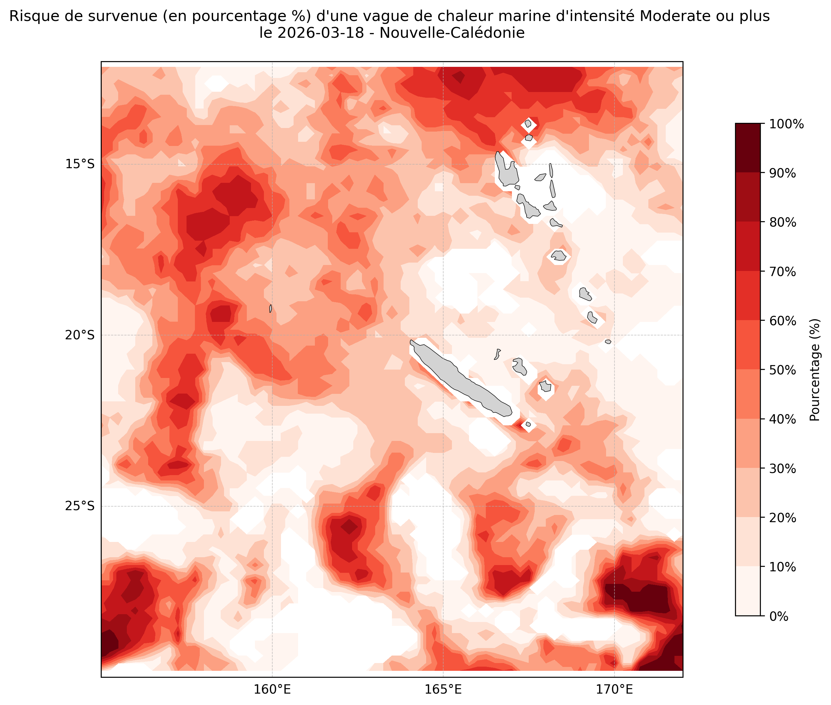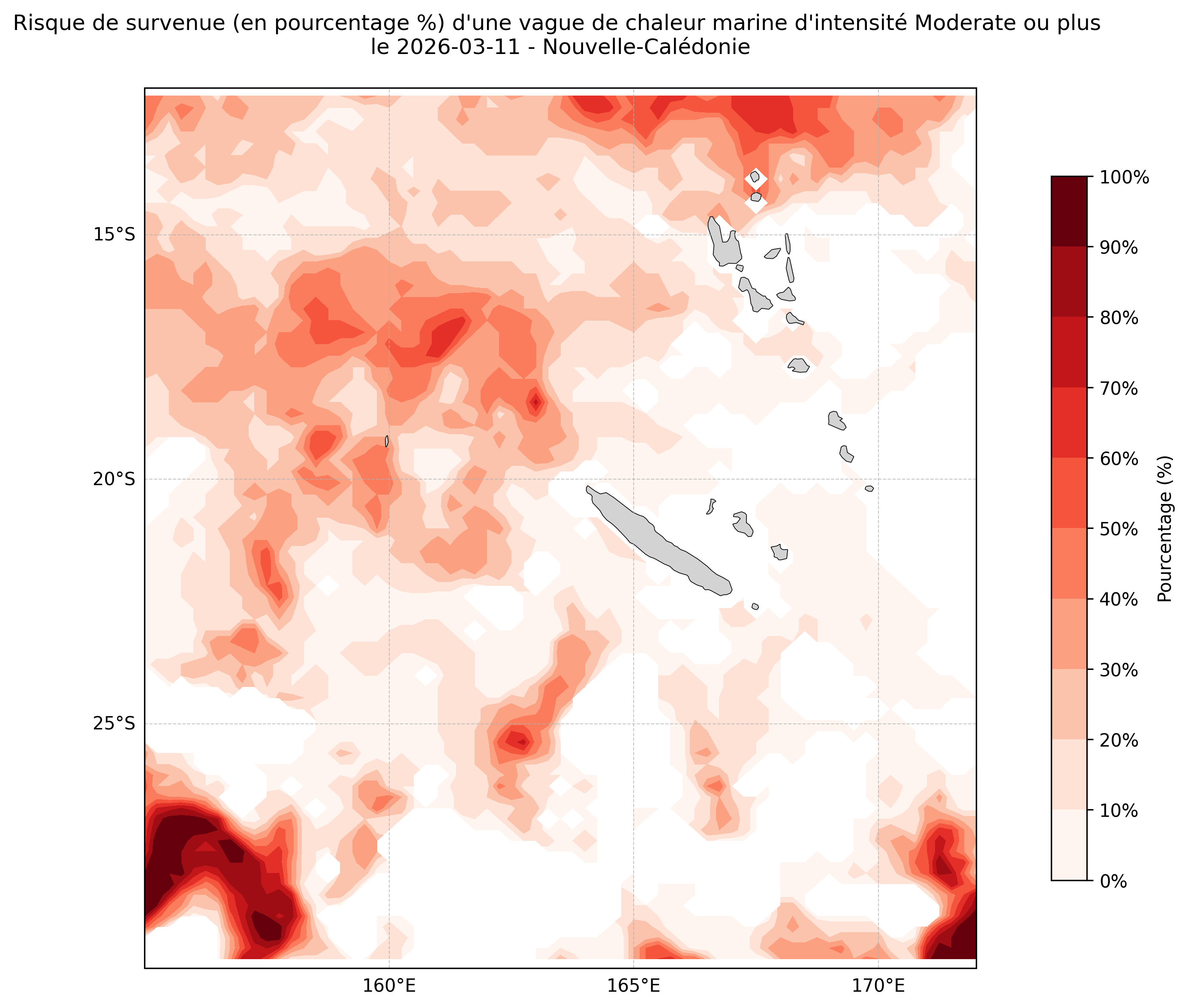 Sur les cartes ci-dessus, les plages de couleurs indiquent la probabilité qu’une vague de chaleur marine d’intensité modérée ou plus survienne en chaque point du domaine.