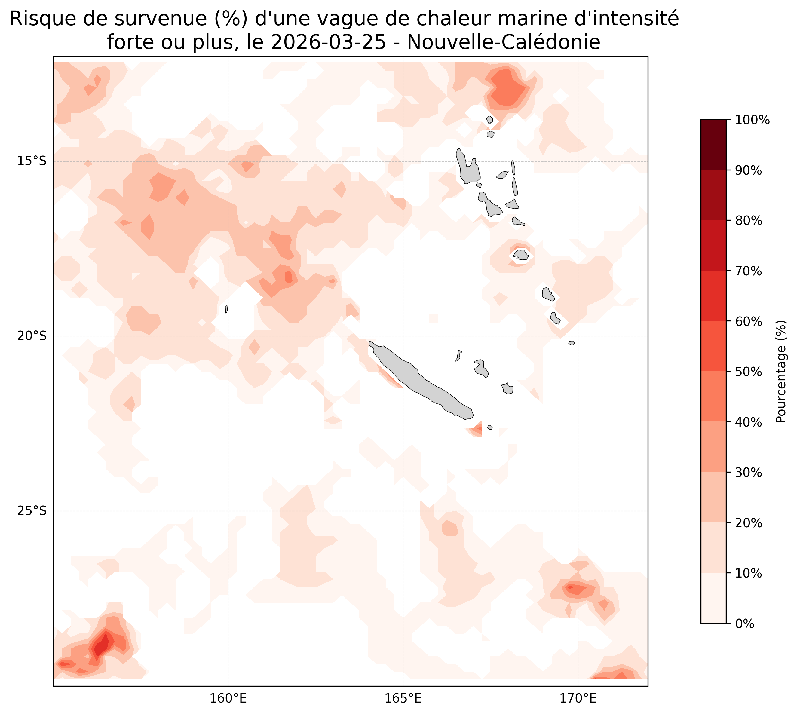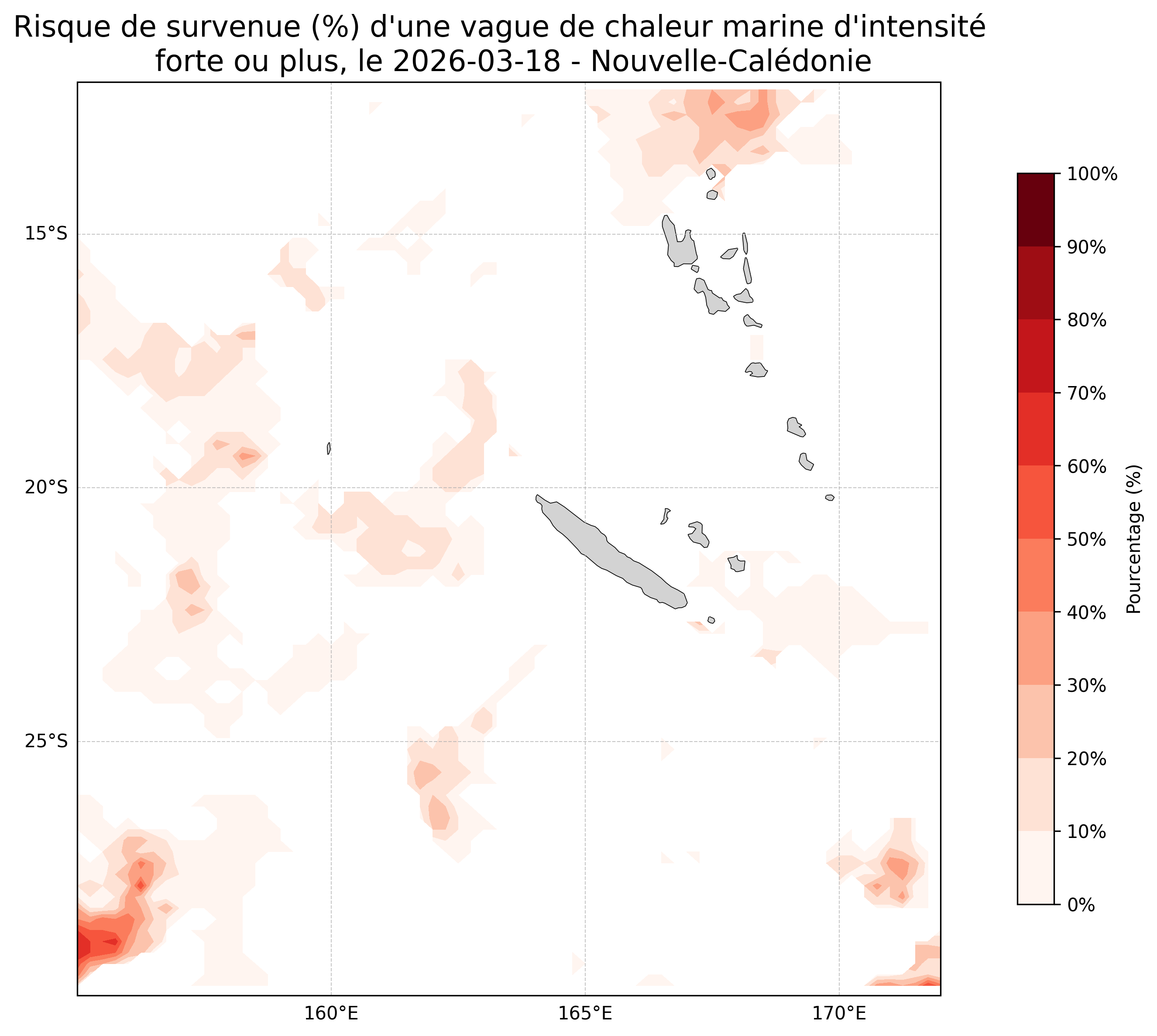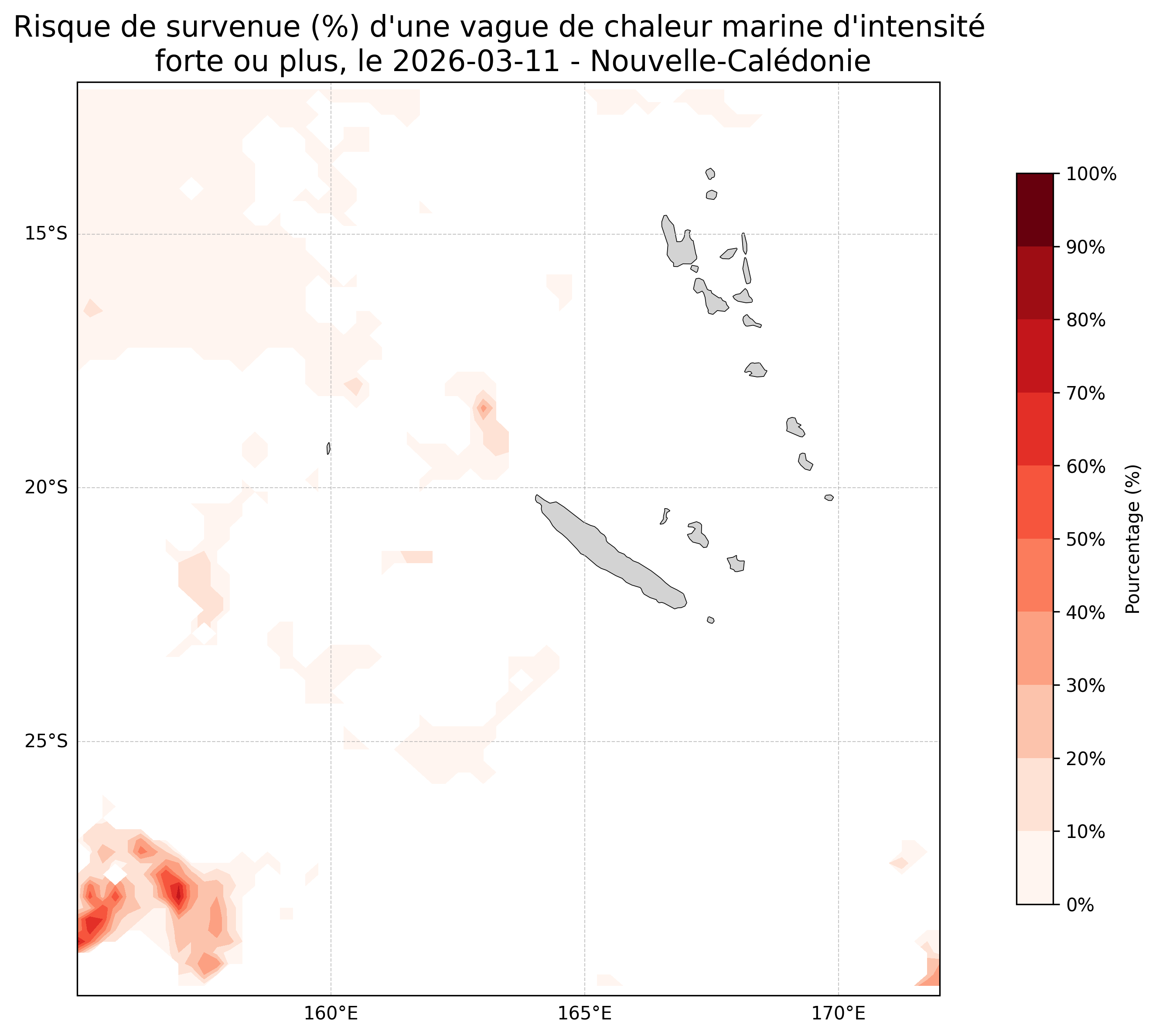 Sur les cartes ci-dessus, les plages de couleurs indiquent la probabilité qu’une vague de chaleur marine d’intensité forte ou plus survienne en chaque point du domaine.