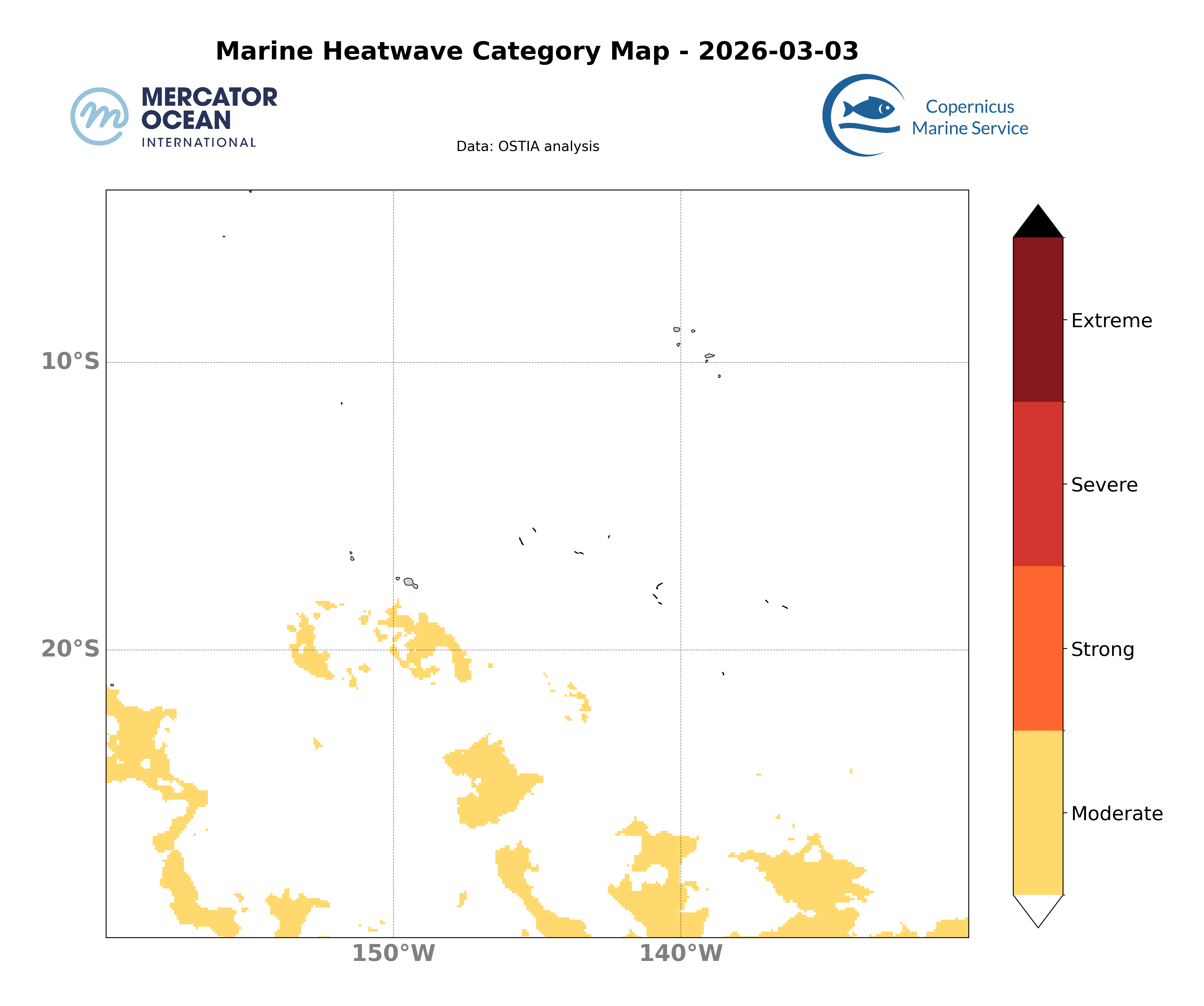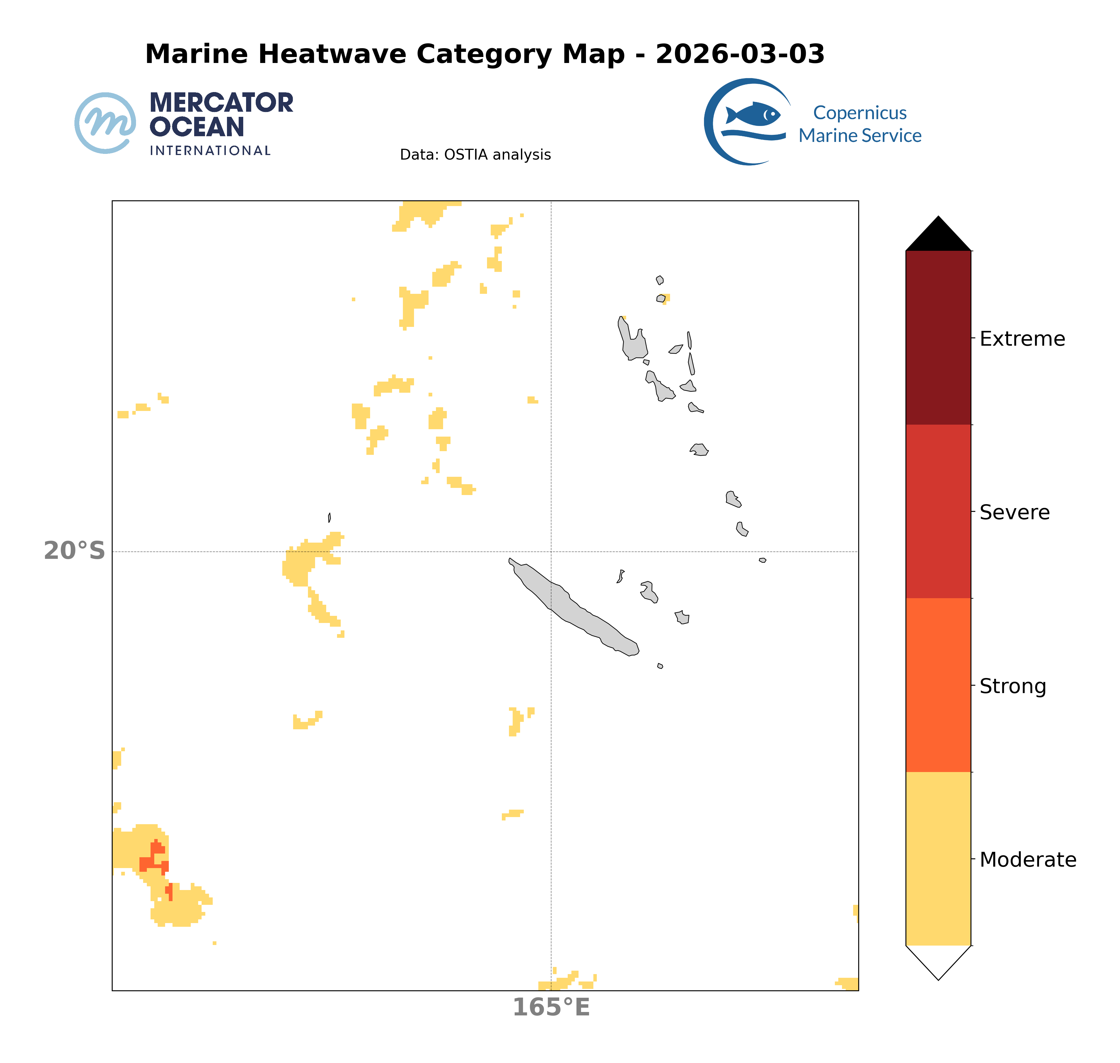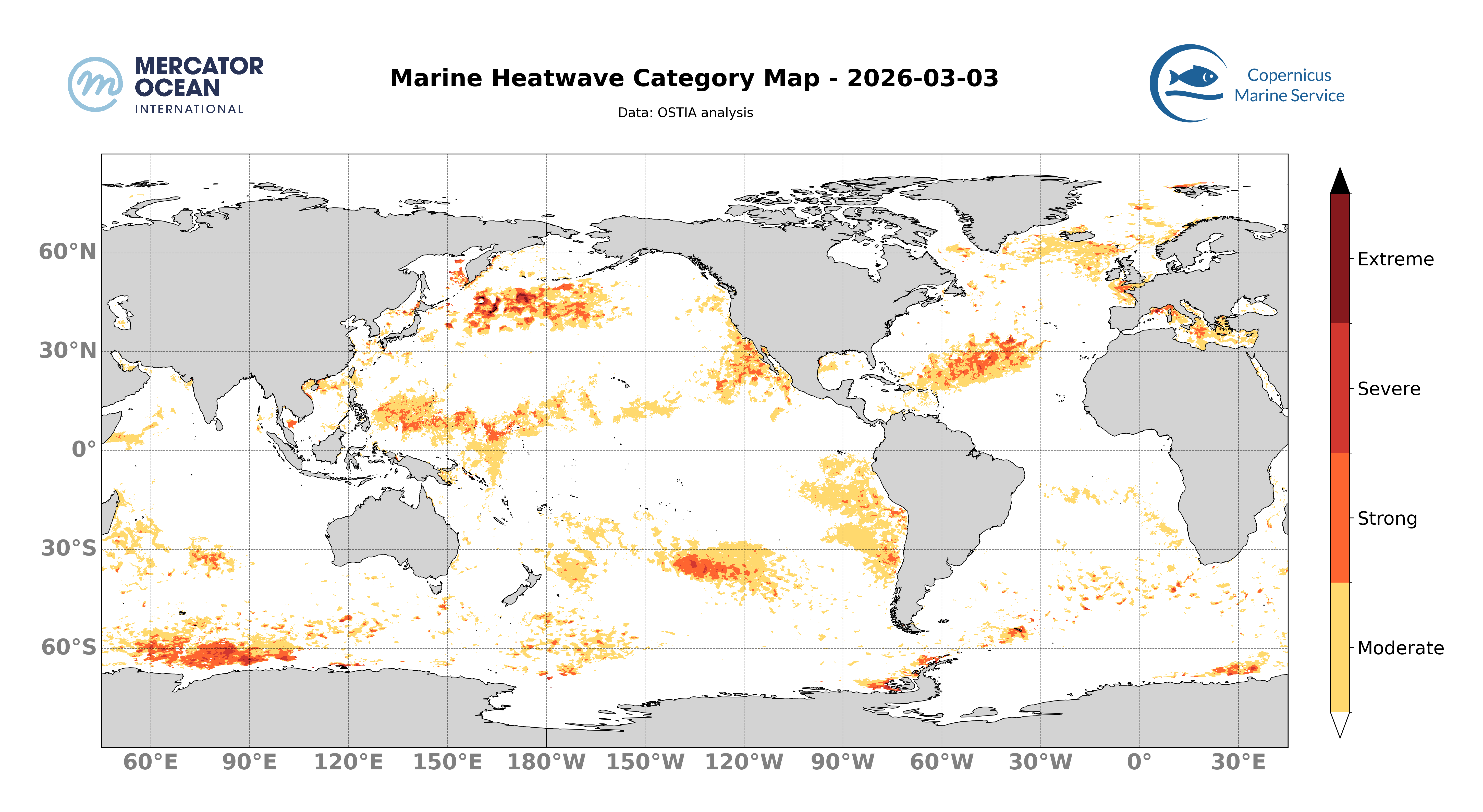Les cartes ci-dessus montrent les dernières analyses Mercator du système opérationnel (GLO12) concernant la présence spatiale d’un évènement de vague de chaleur ainsi que la catégorie associée à l’échelle d’un domaine.