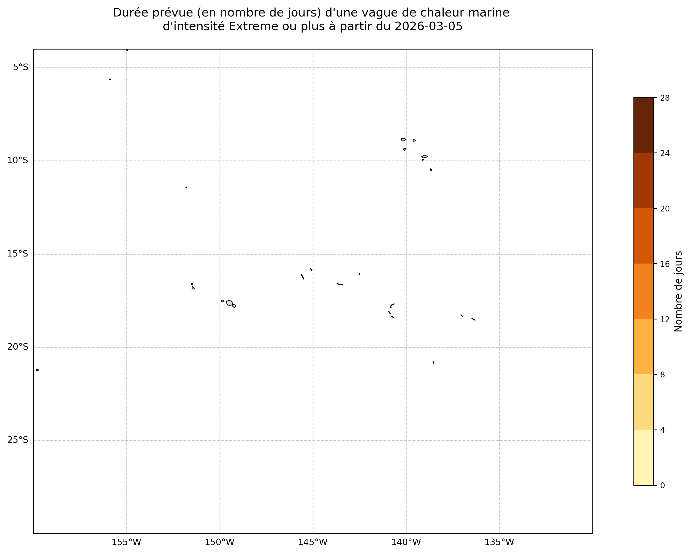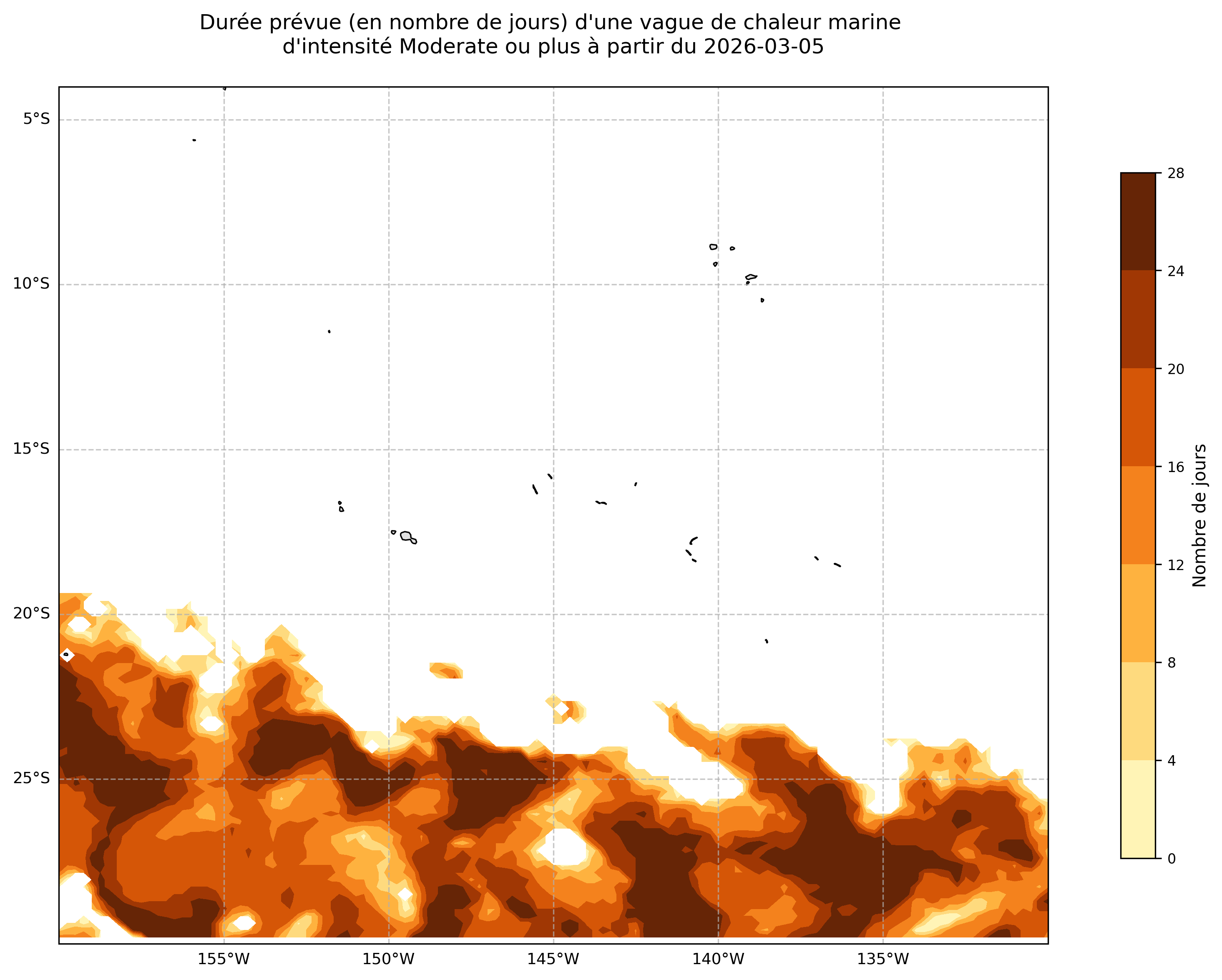Sur les cartes ci-dessus, les plages de couleurs indiquent la durée potentielle en jours qu’une vague de chaleur marine d’intensité modérée, forte,sévère, extrême ou plus surviennent en chaque point du domaine.