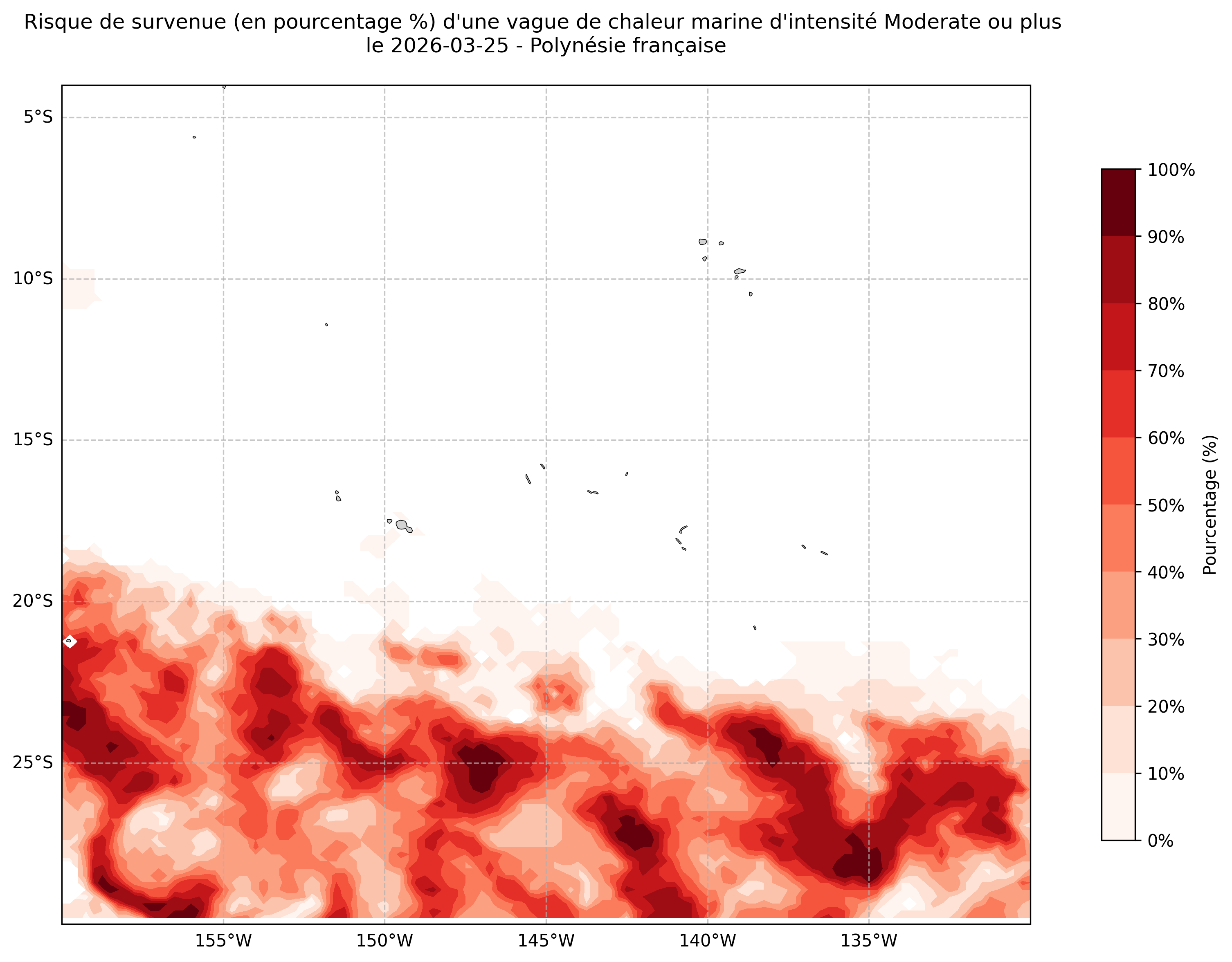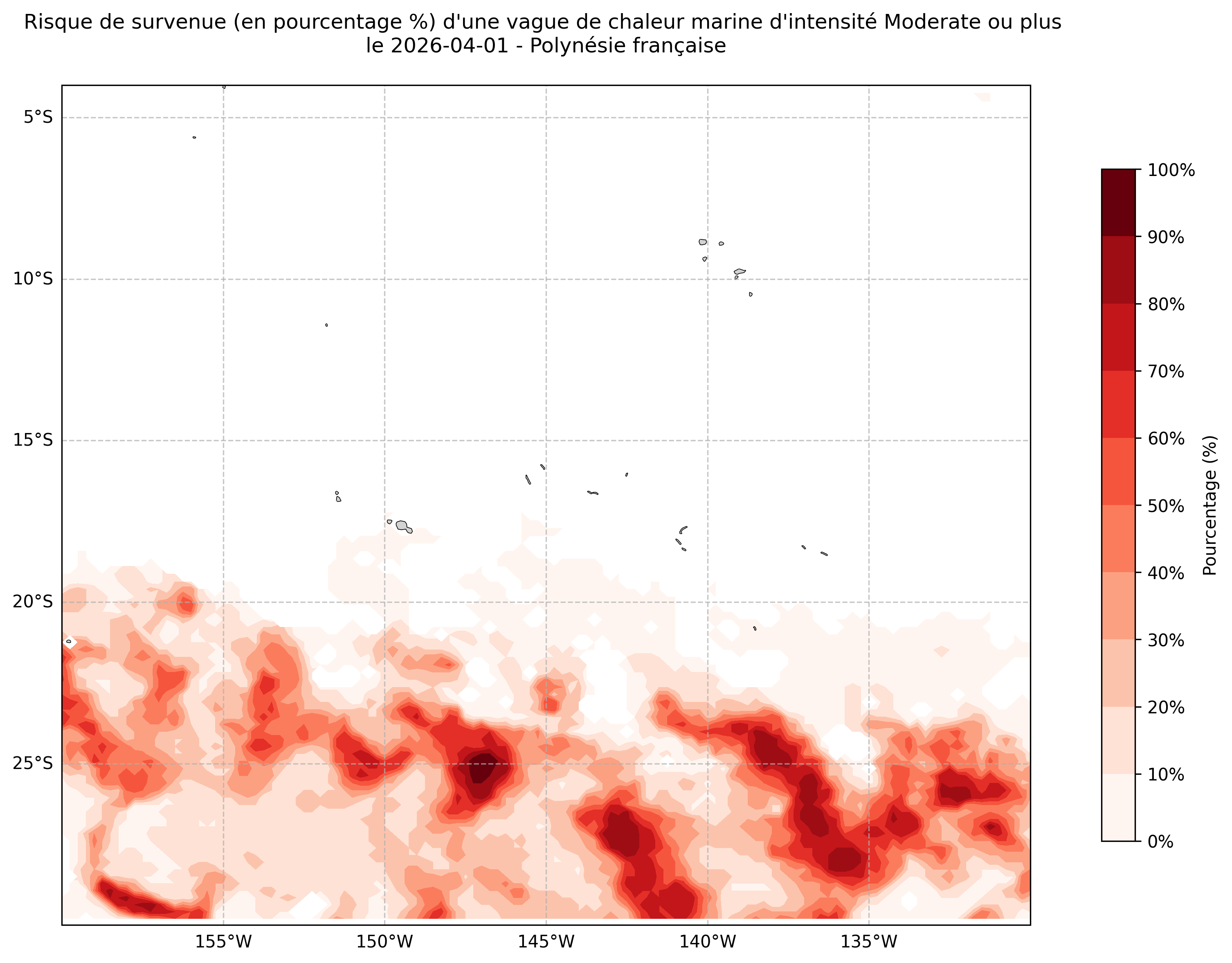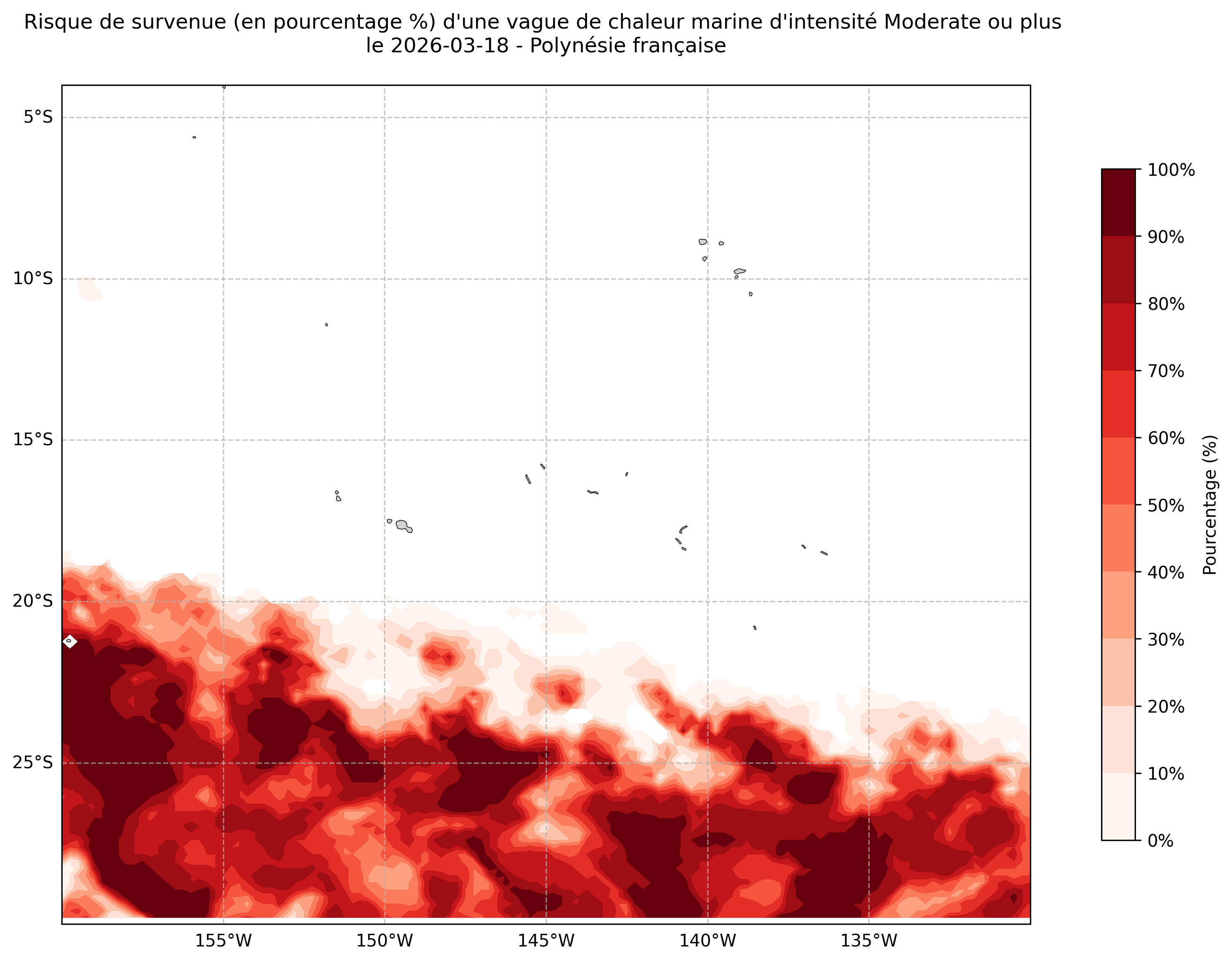 Sur les cartes ci-dessus, les plages de couleurs indiquent la probabilité qu’une vague de chaleur marine d’intensité modérée ou plus survienne en chaque point du domaine.