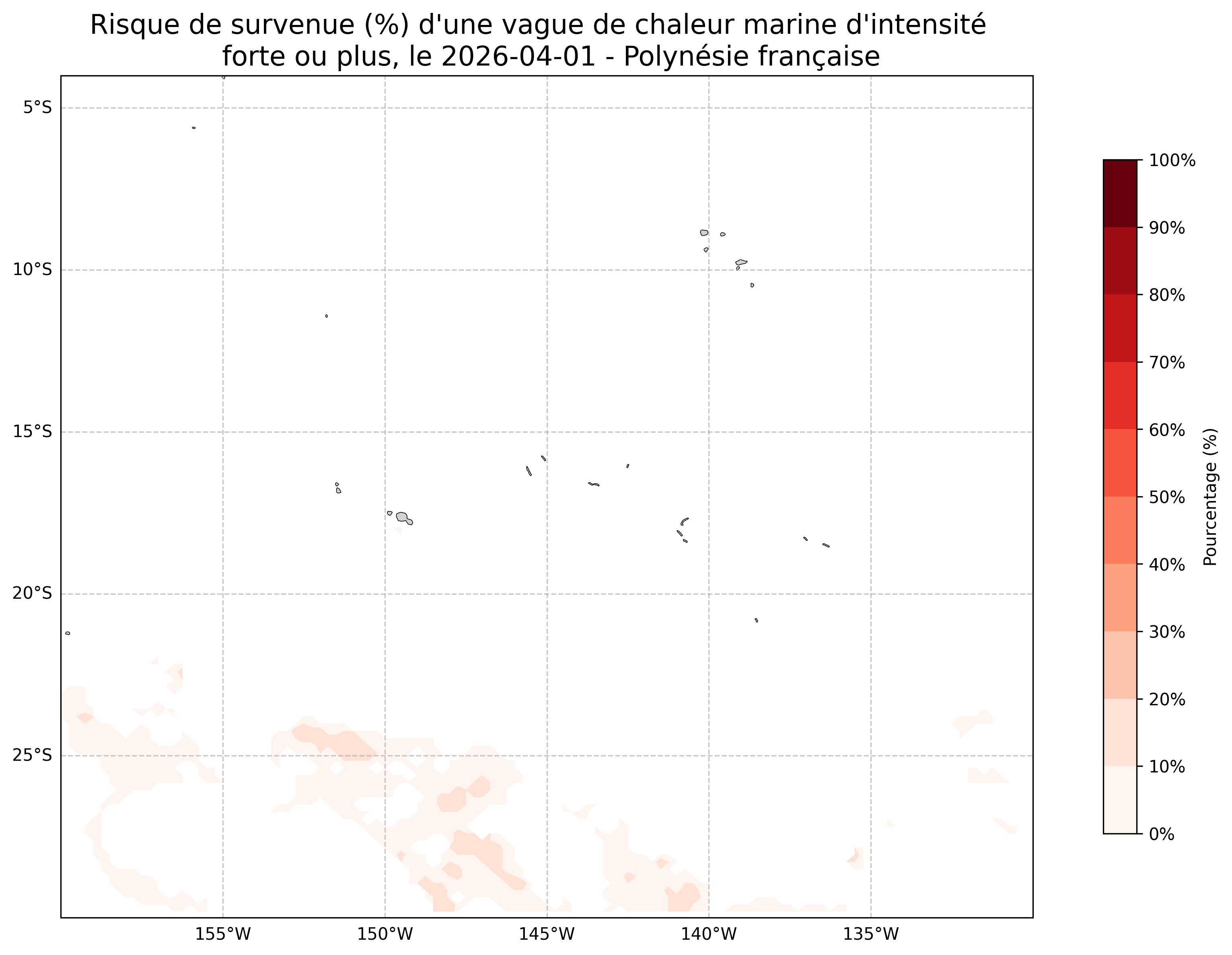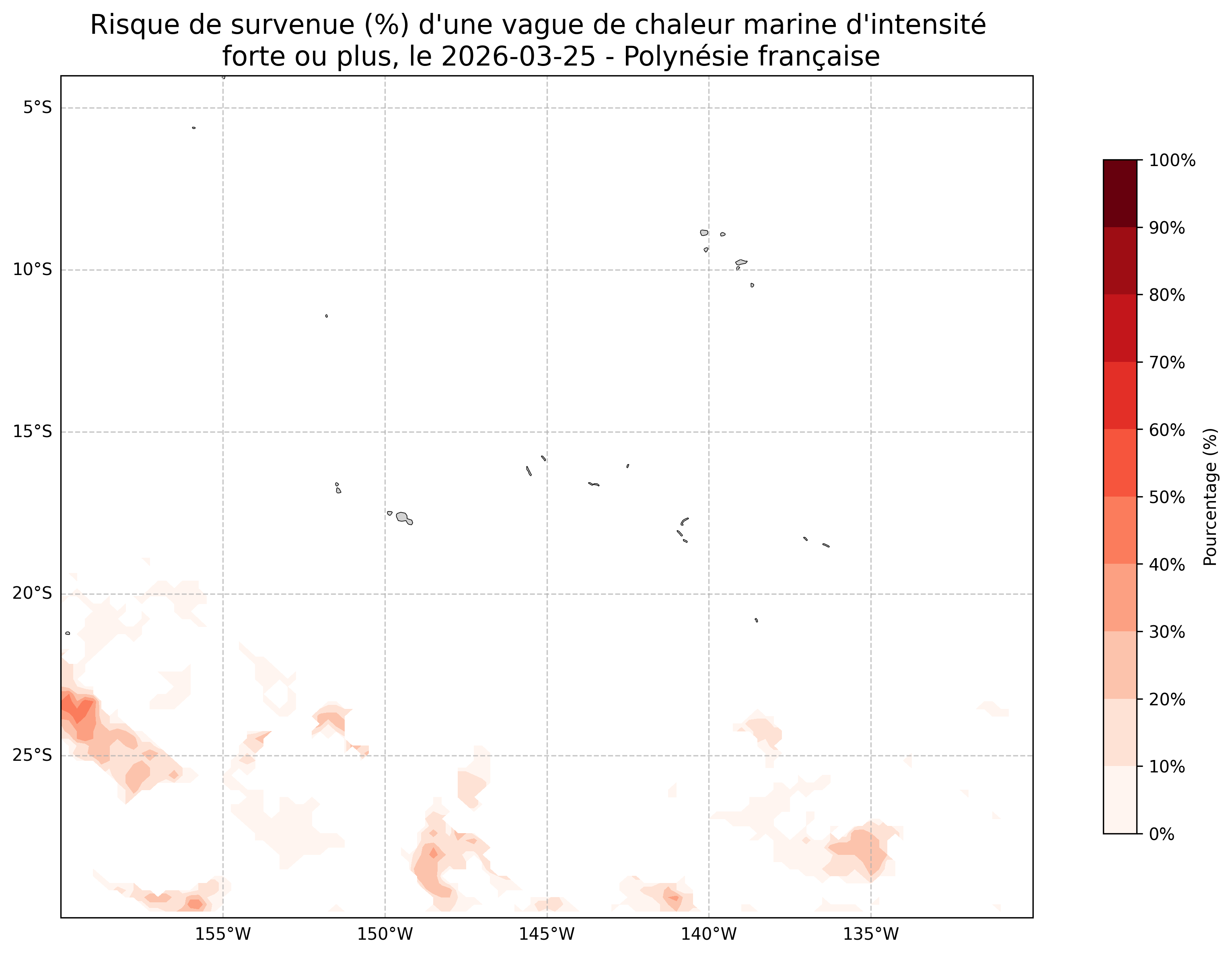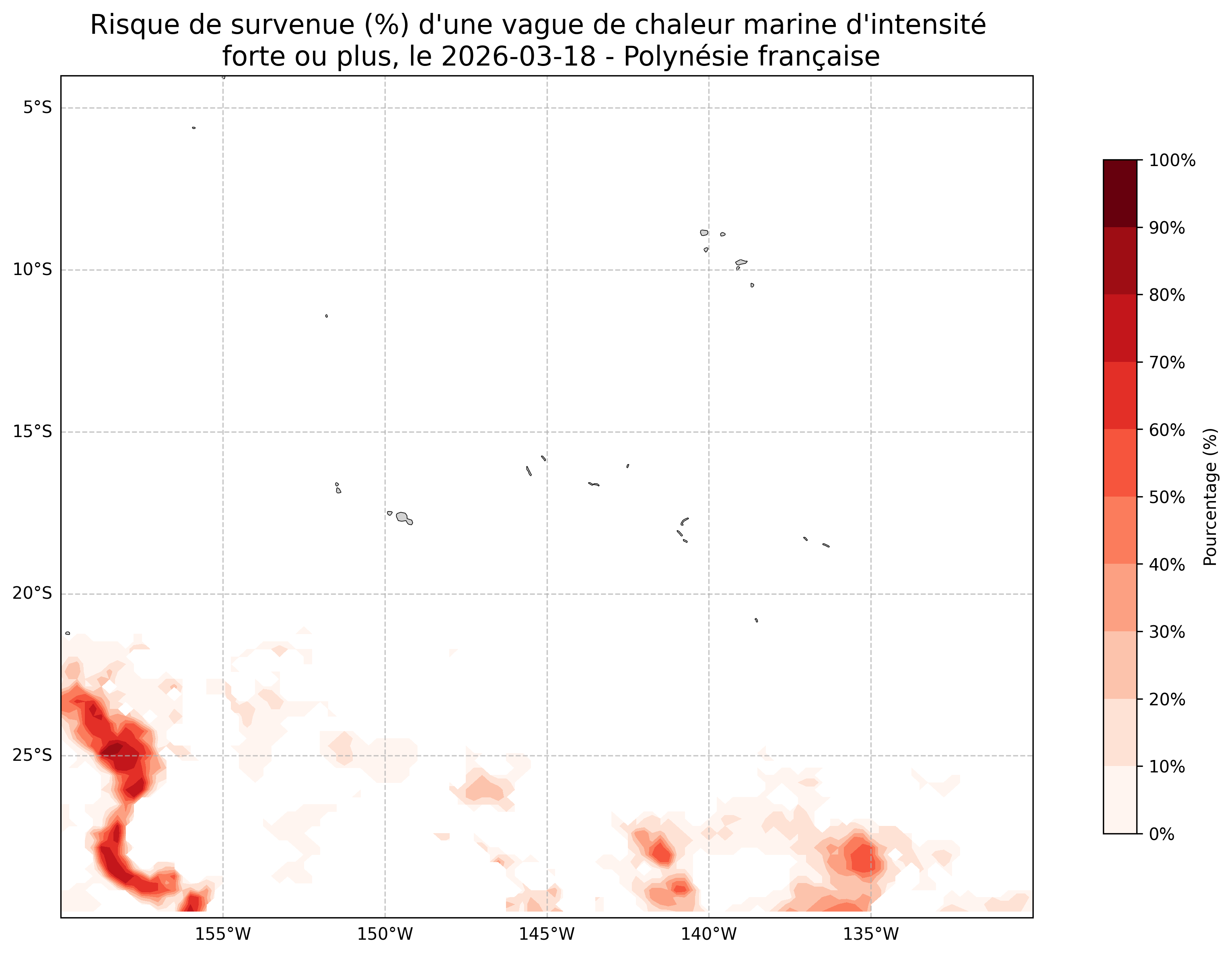 Sur les cartes ci-dessus, les plages de couleurs indiquent la probabilité qu’une vague de chaleur marine d’intensité forte ou plus survienne en chaque point du domaine.