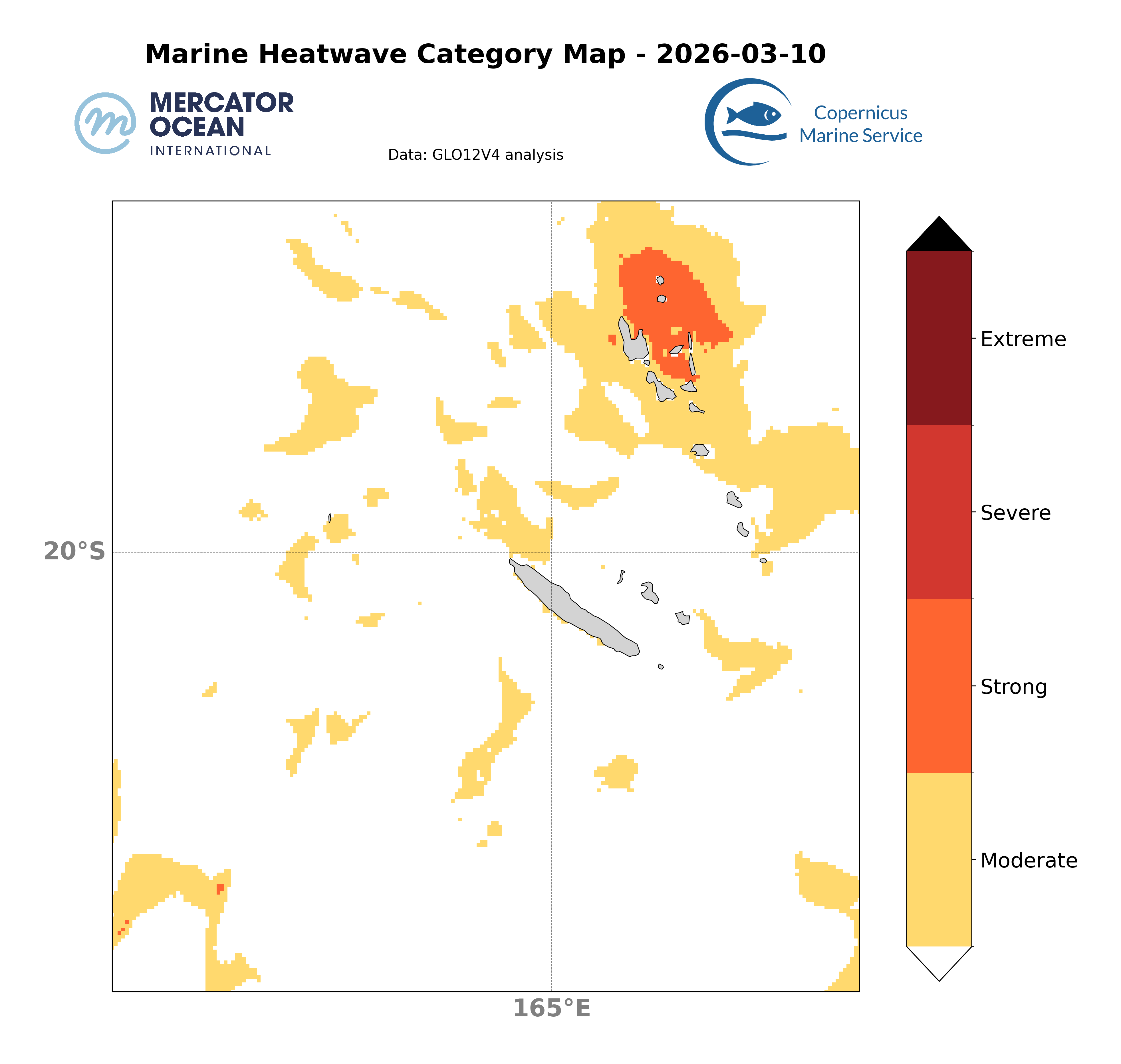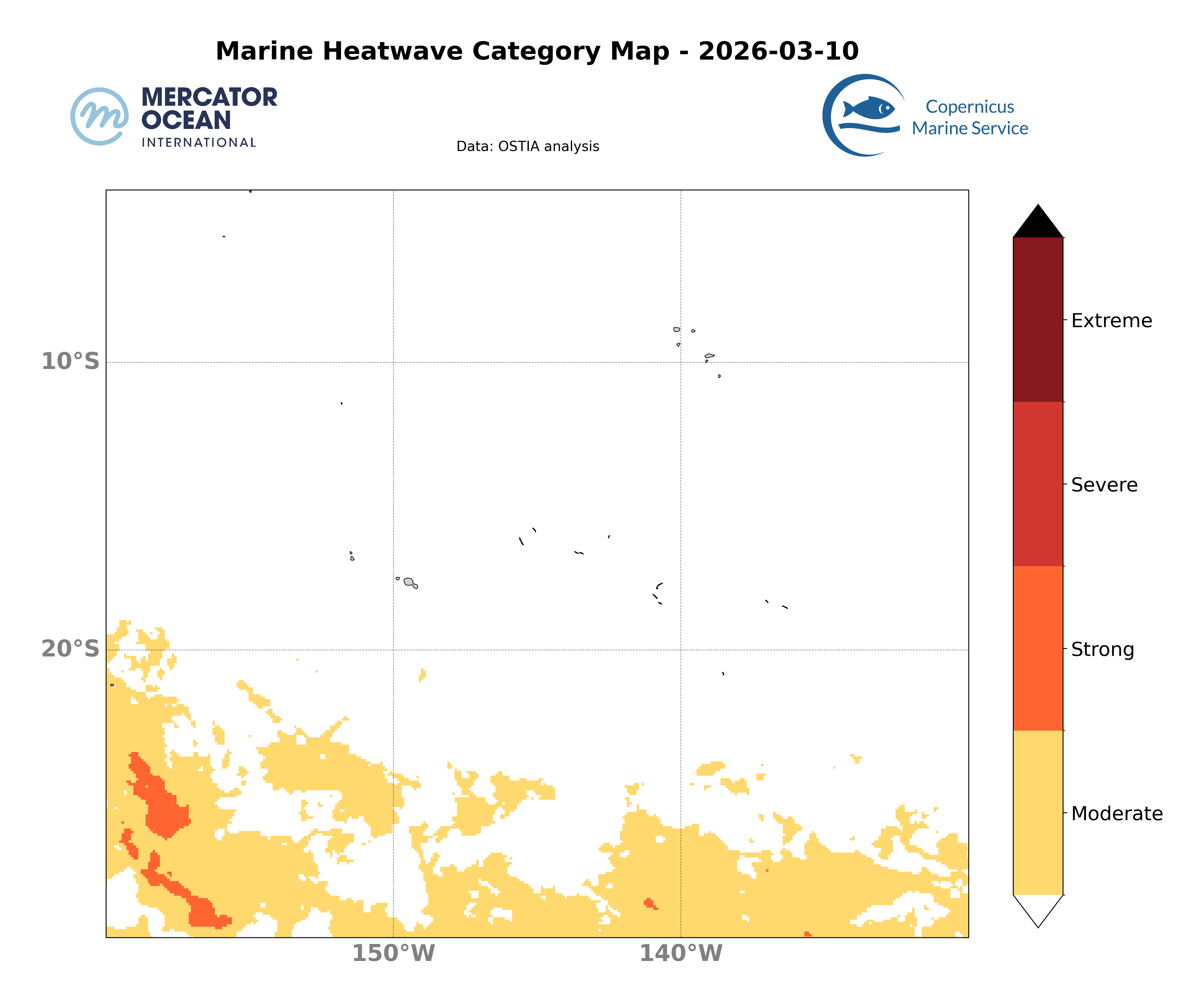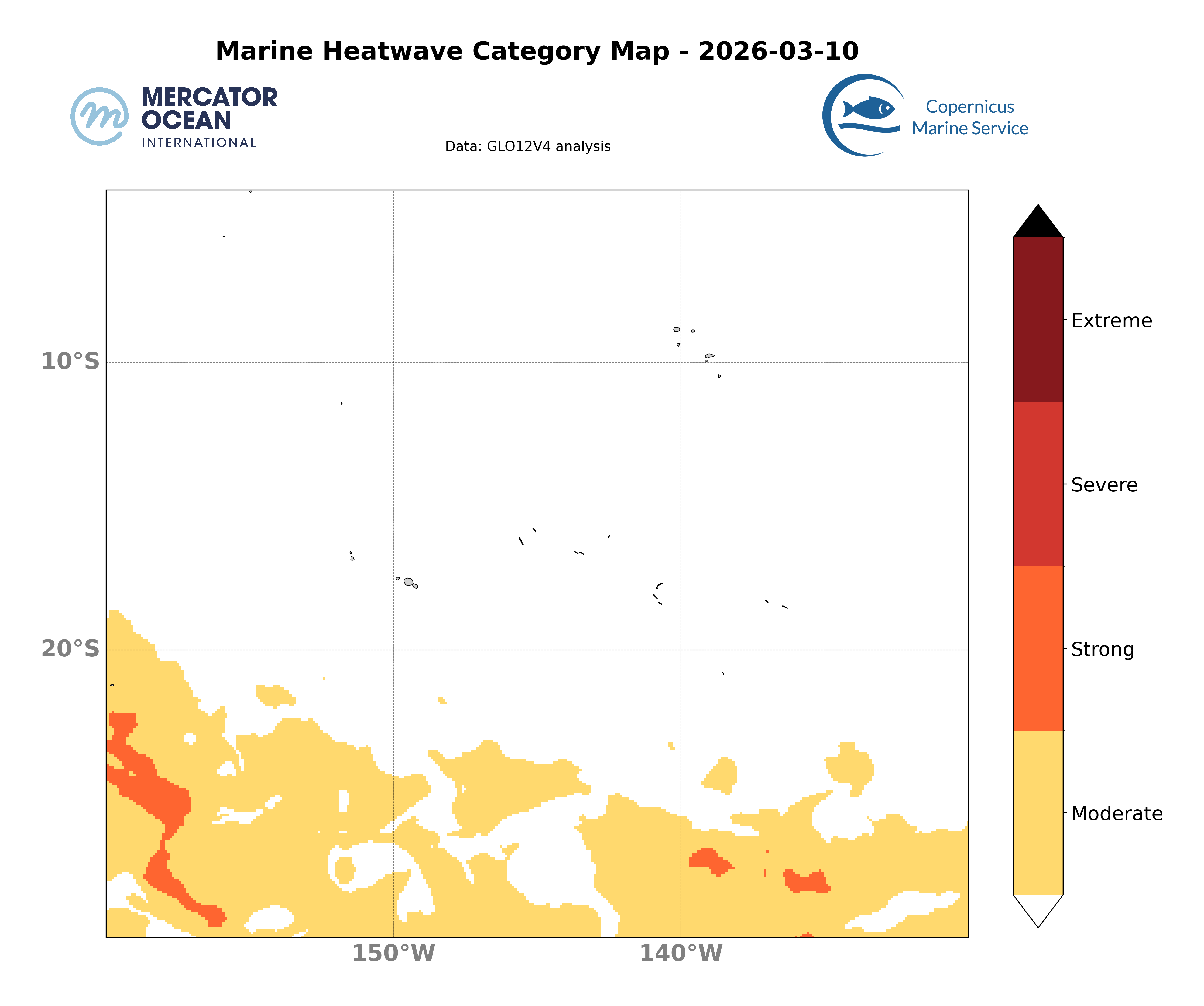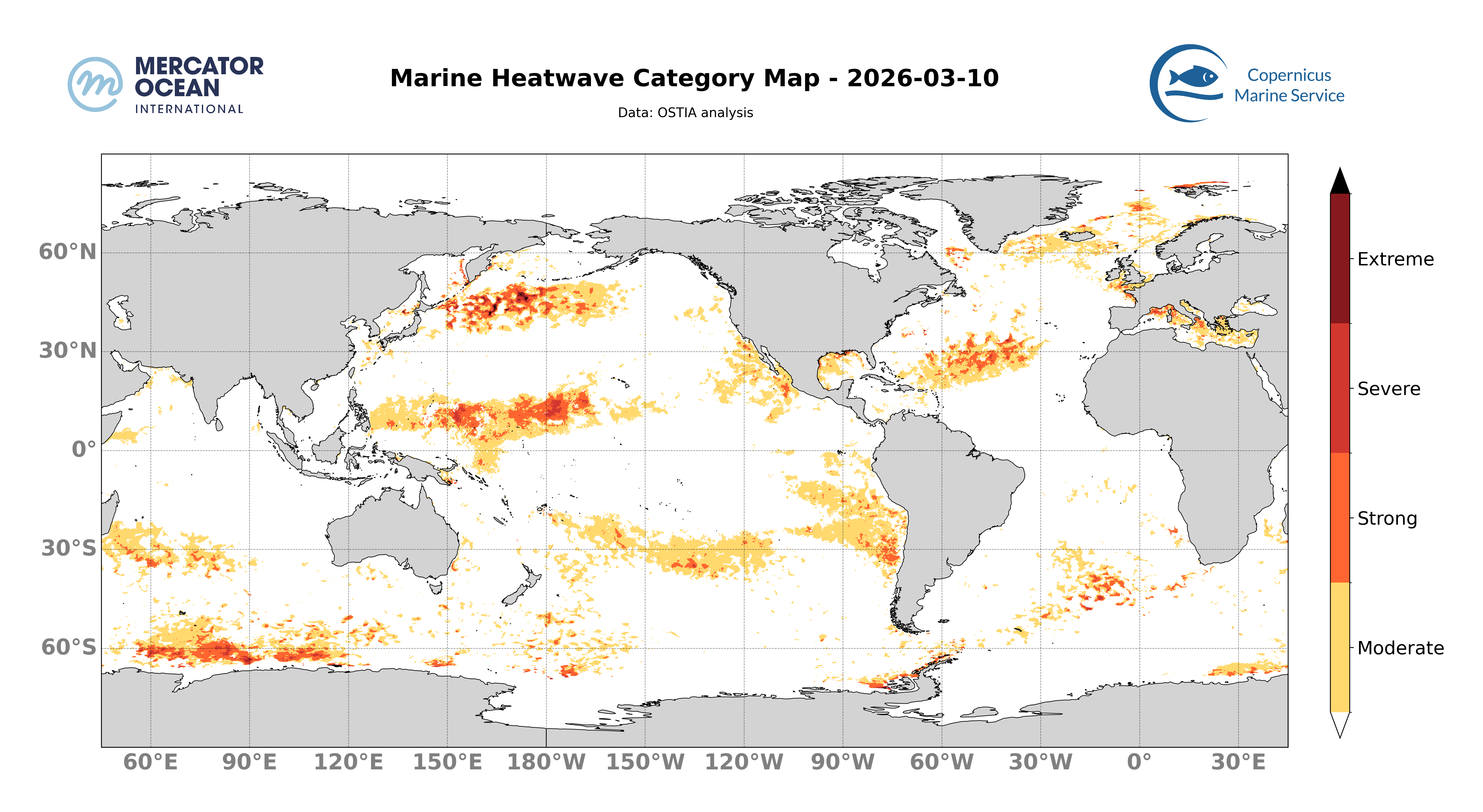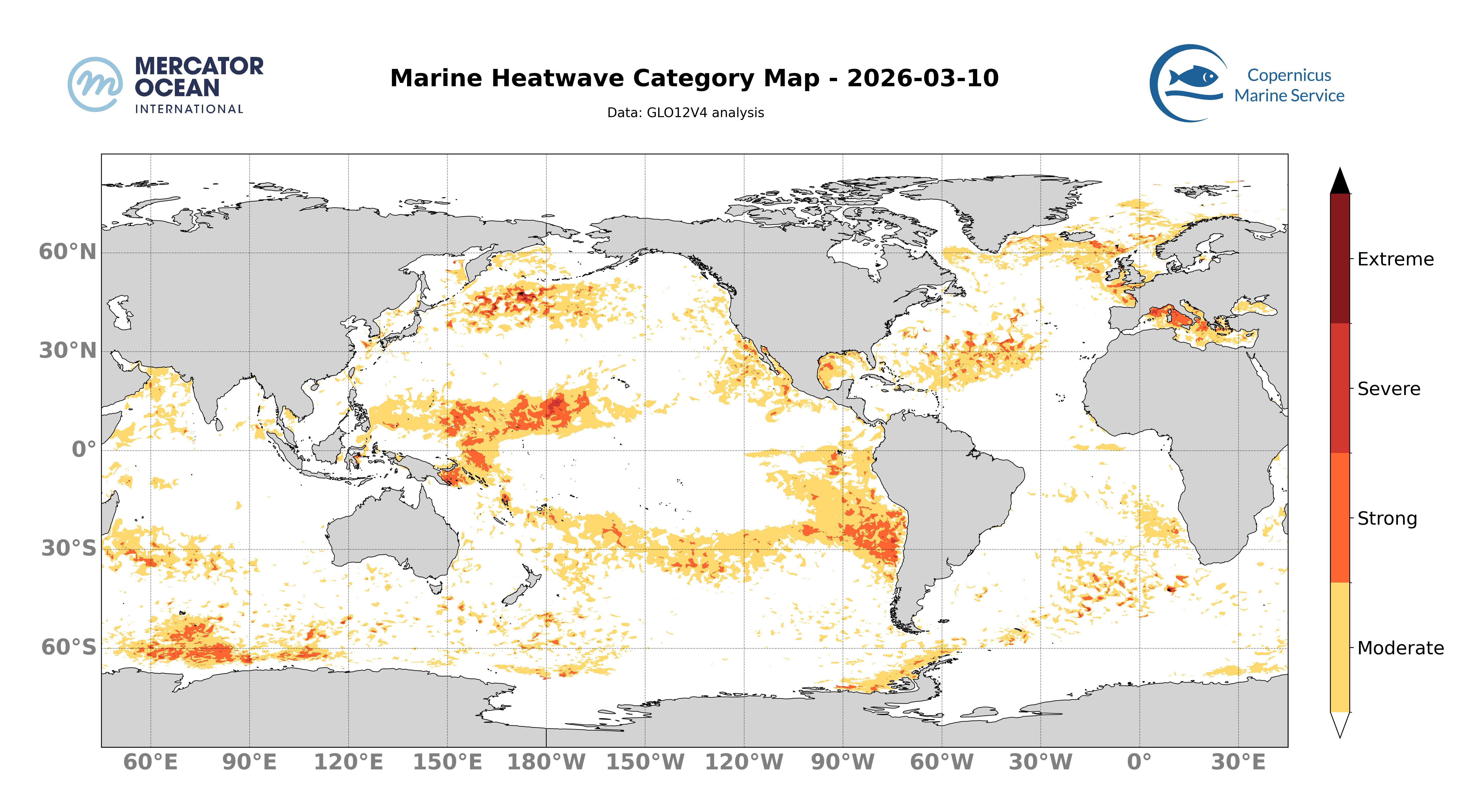 Les cartes ci-dessus montrent les dernières analyses Mercator du système opérationnel (GLO12) concernant la présence spatiale d’un évènement de vague de chaleur ainsi que la catégorie associée à l’échelle d’un domaine.