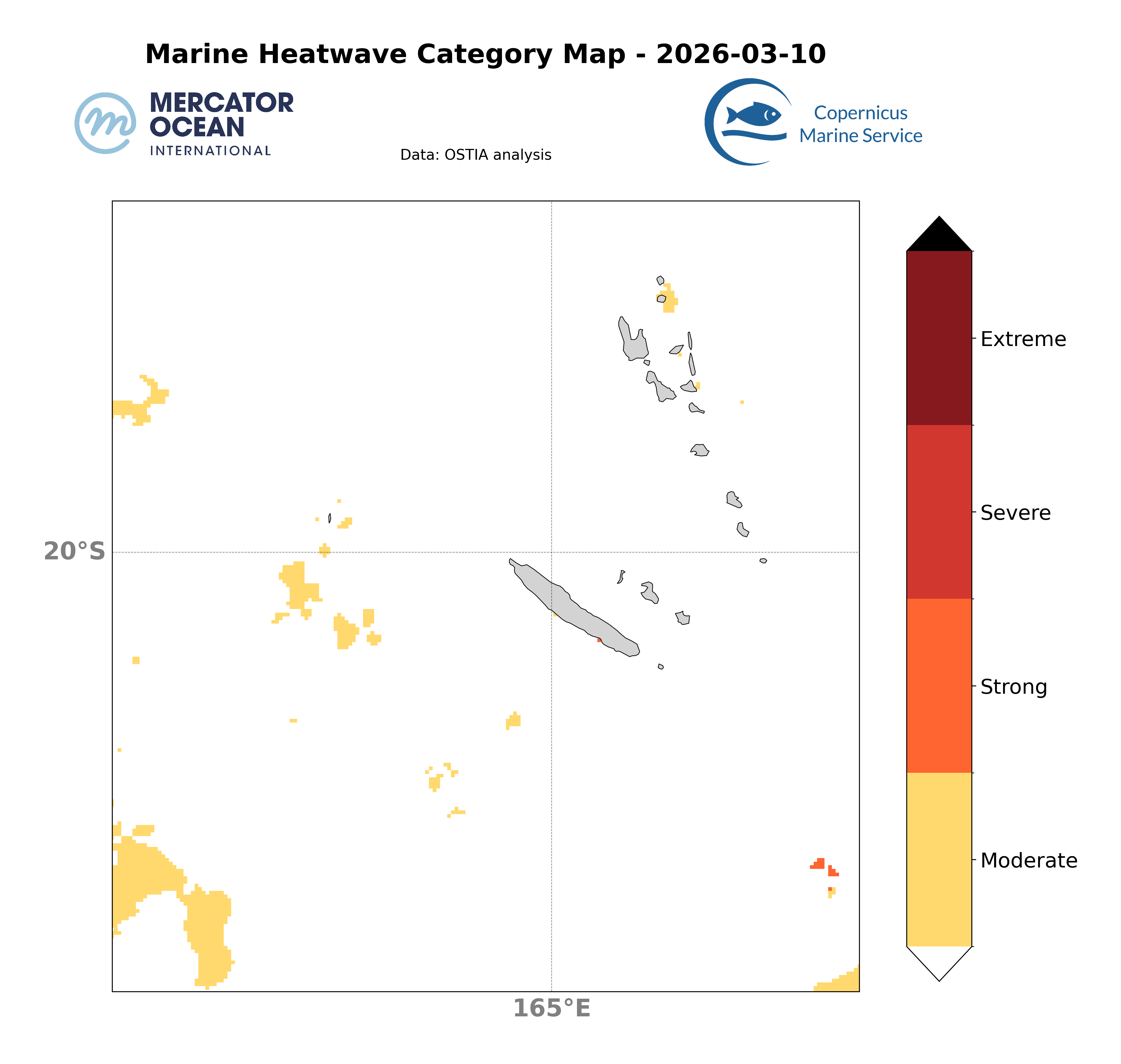 Les cartes ci-dessus montrent les dernières observations du satellite OSTIA concernant la présence spatiale d’un évènement de vague de chaleur ainsi que la catégorie associée à l’échelle d’un domaine.