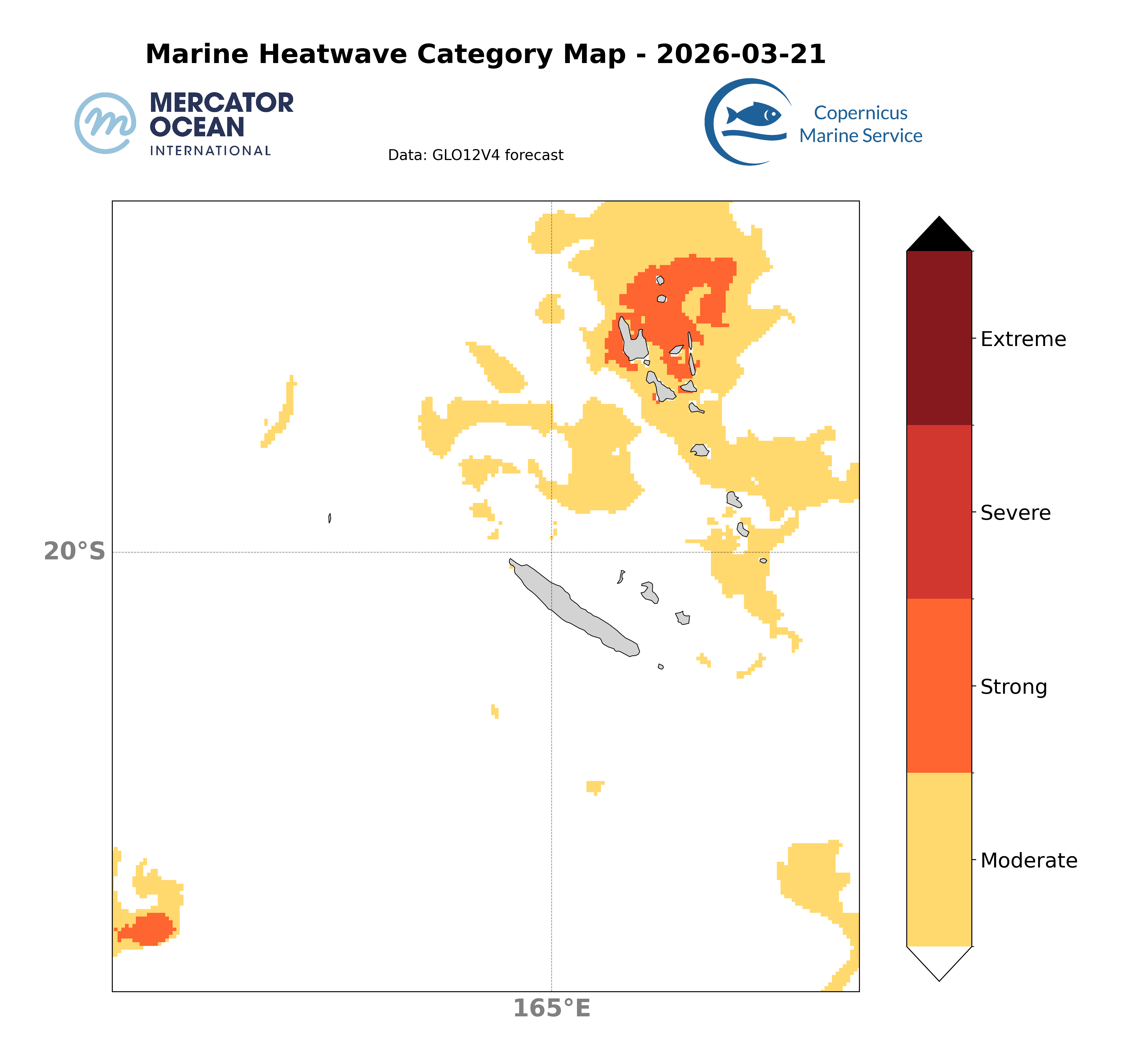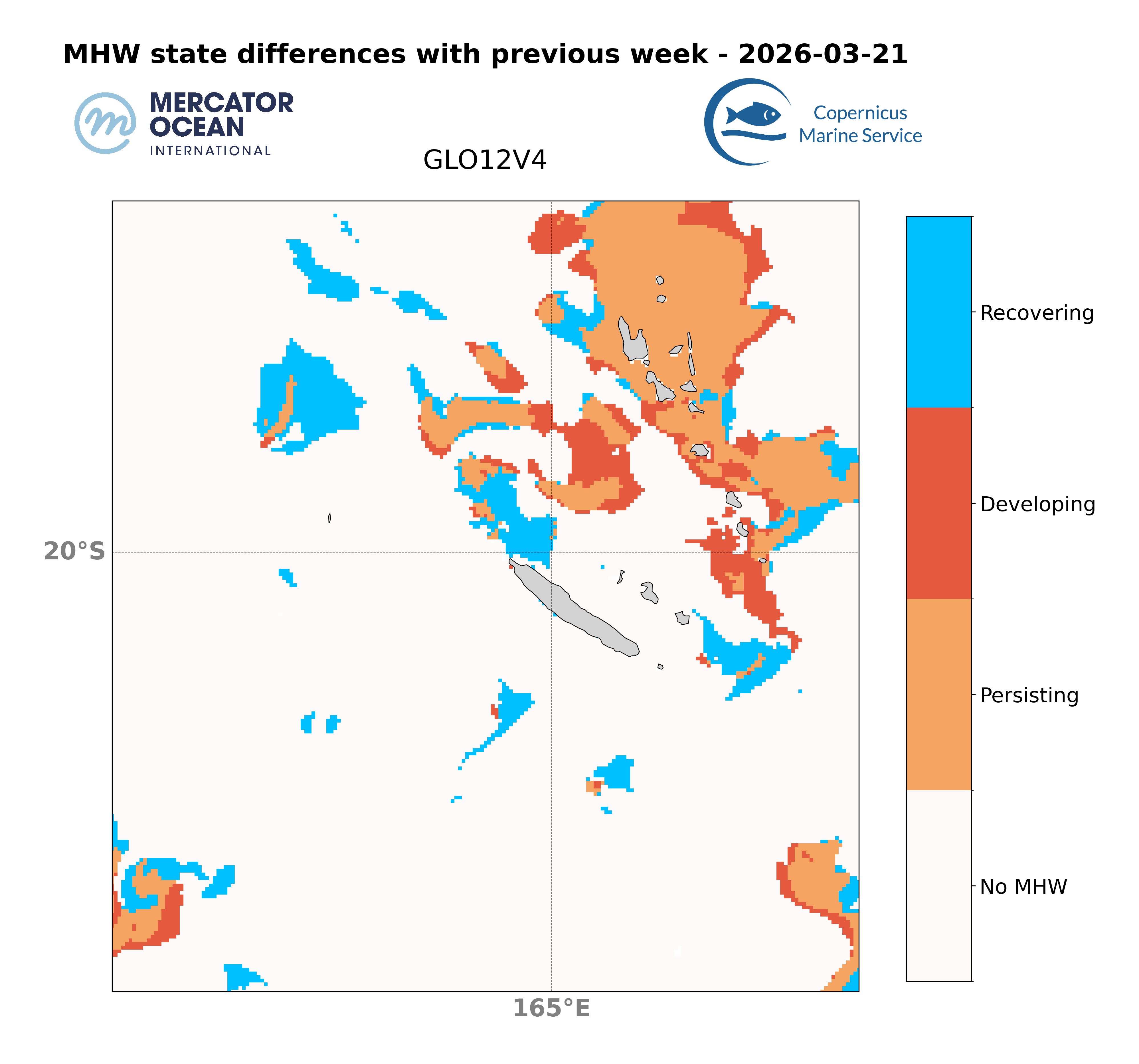 Sur les cartes ci-dessus, la carte de gauche informe sur la probabilité qu’une vague de chaleur marine survienne à échéance J+10 en chaque point du domaine et informe sur la catégorie attendue. La carte de droite permet d’évaluer l’évolution du phénomène par rapport à l’analyse de J-10.