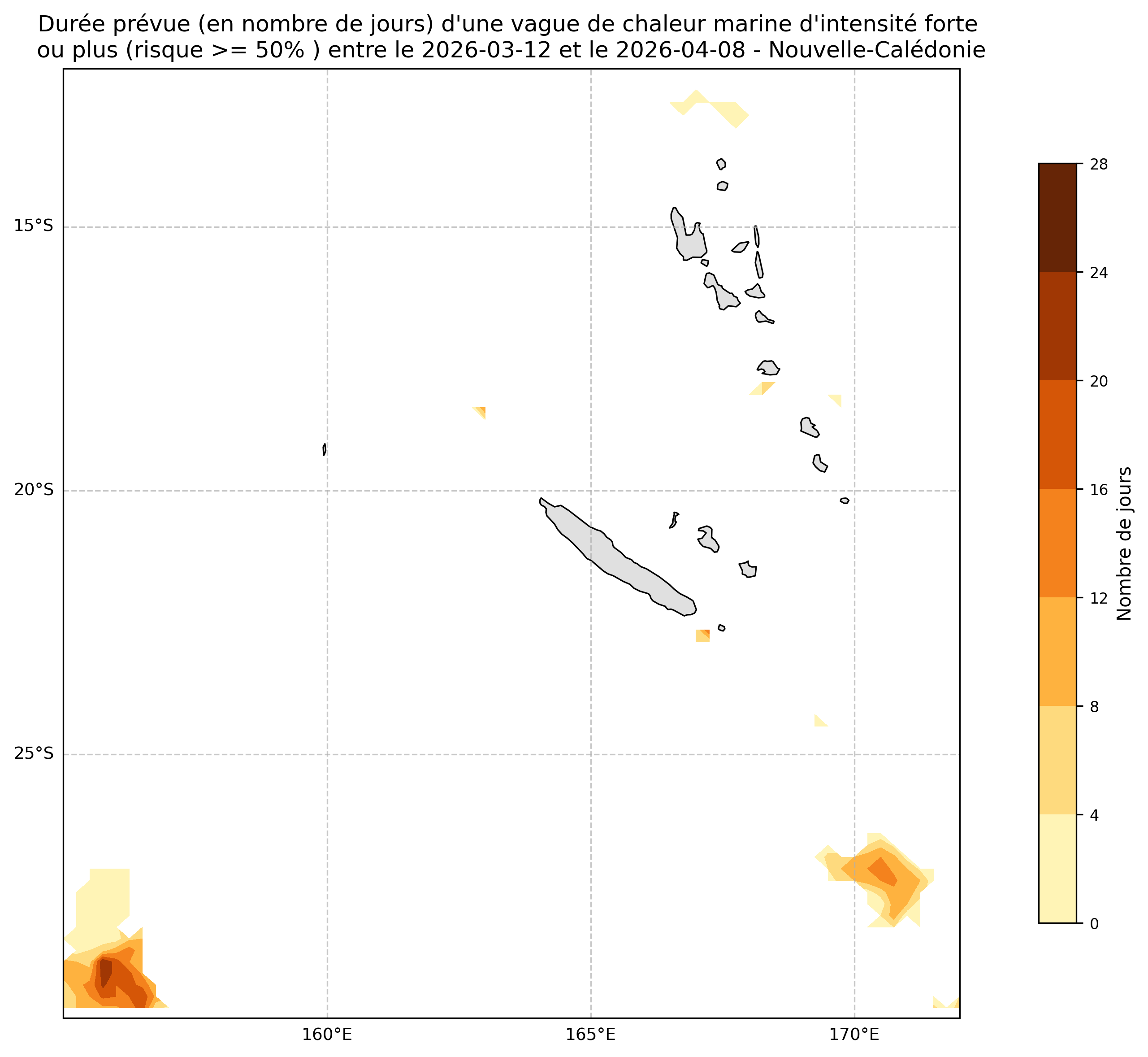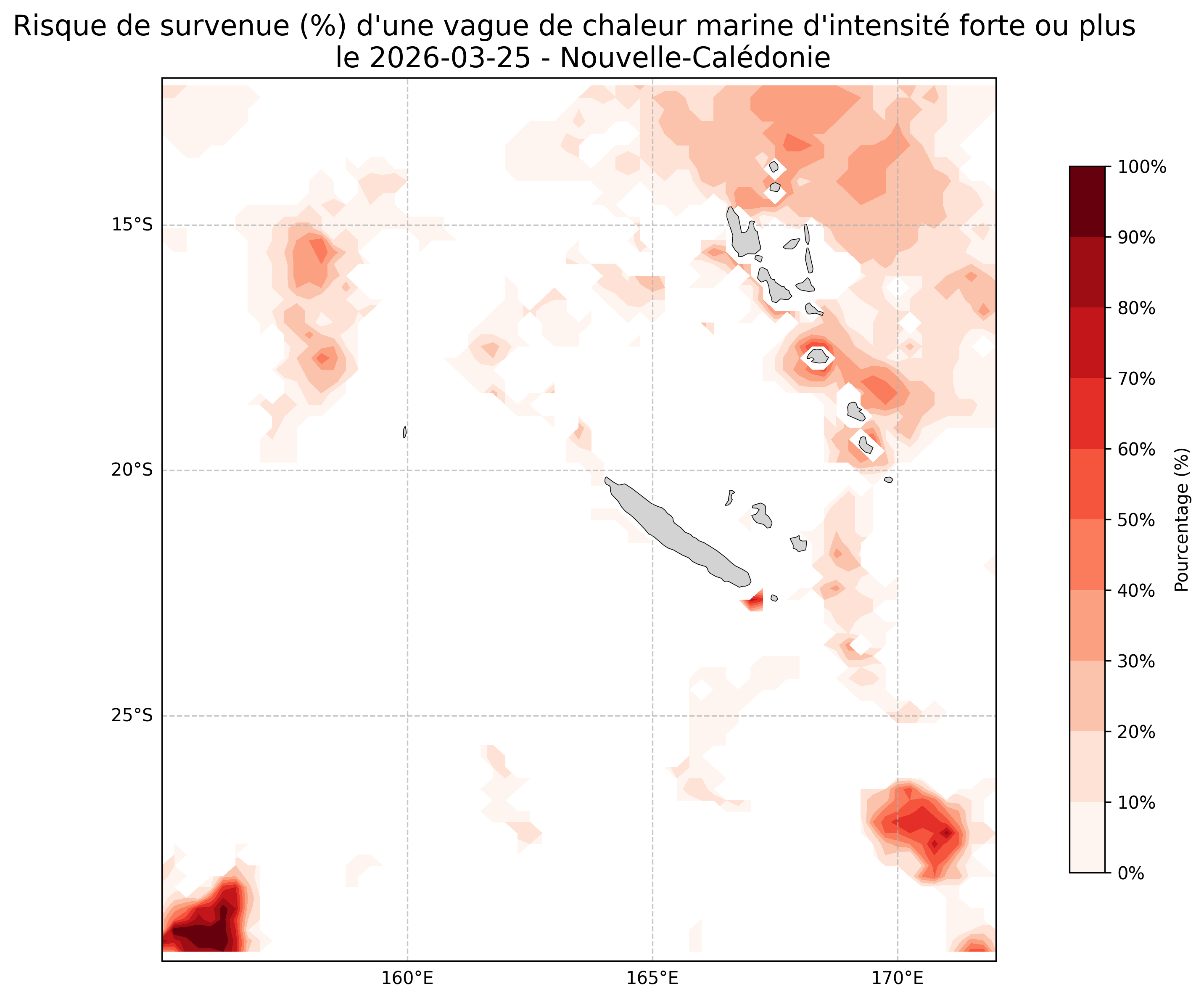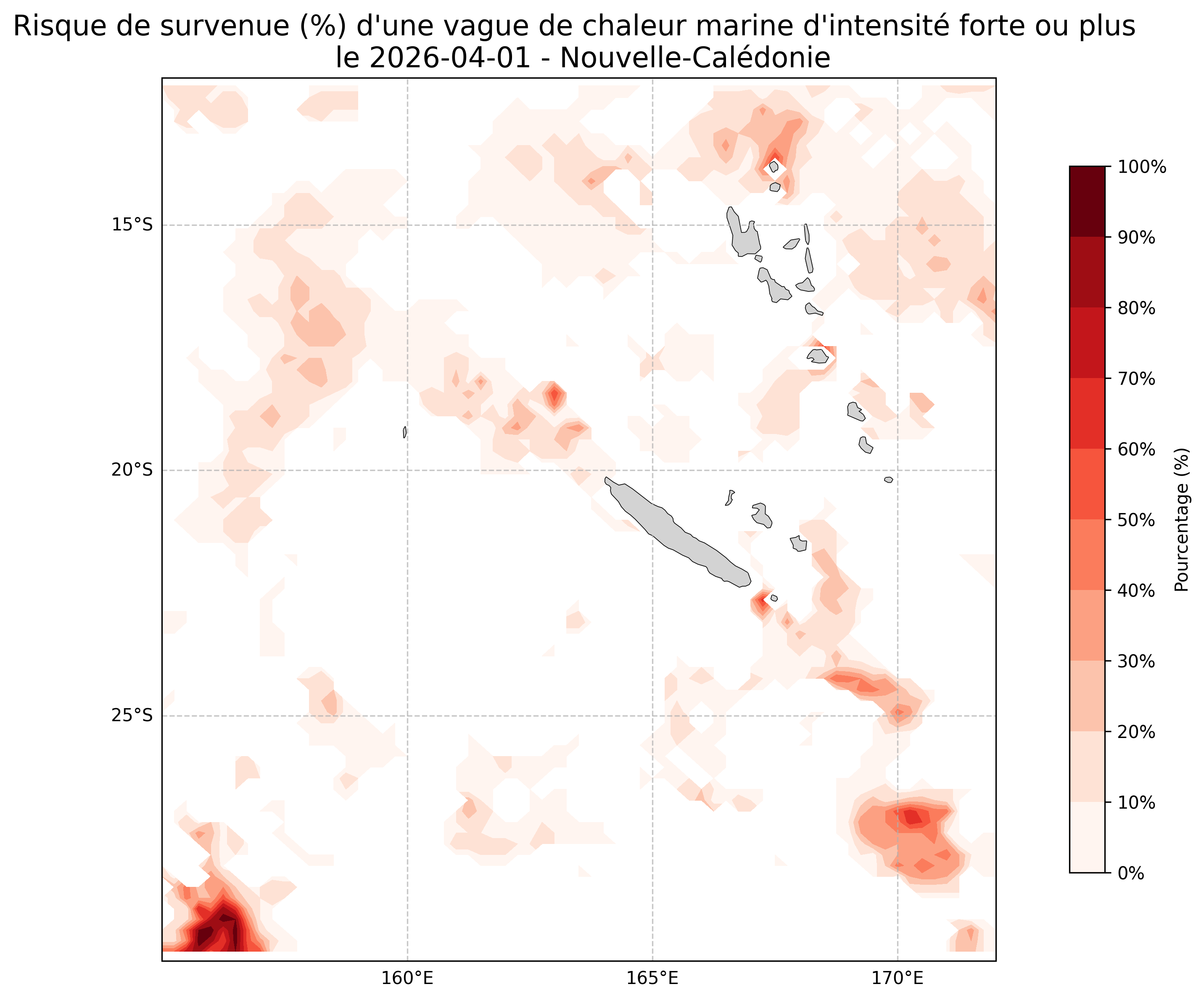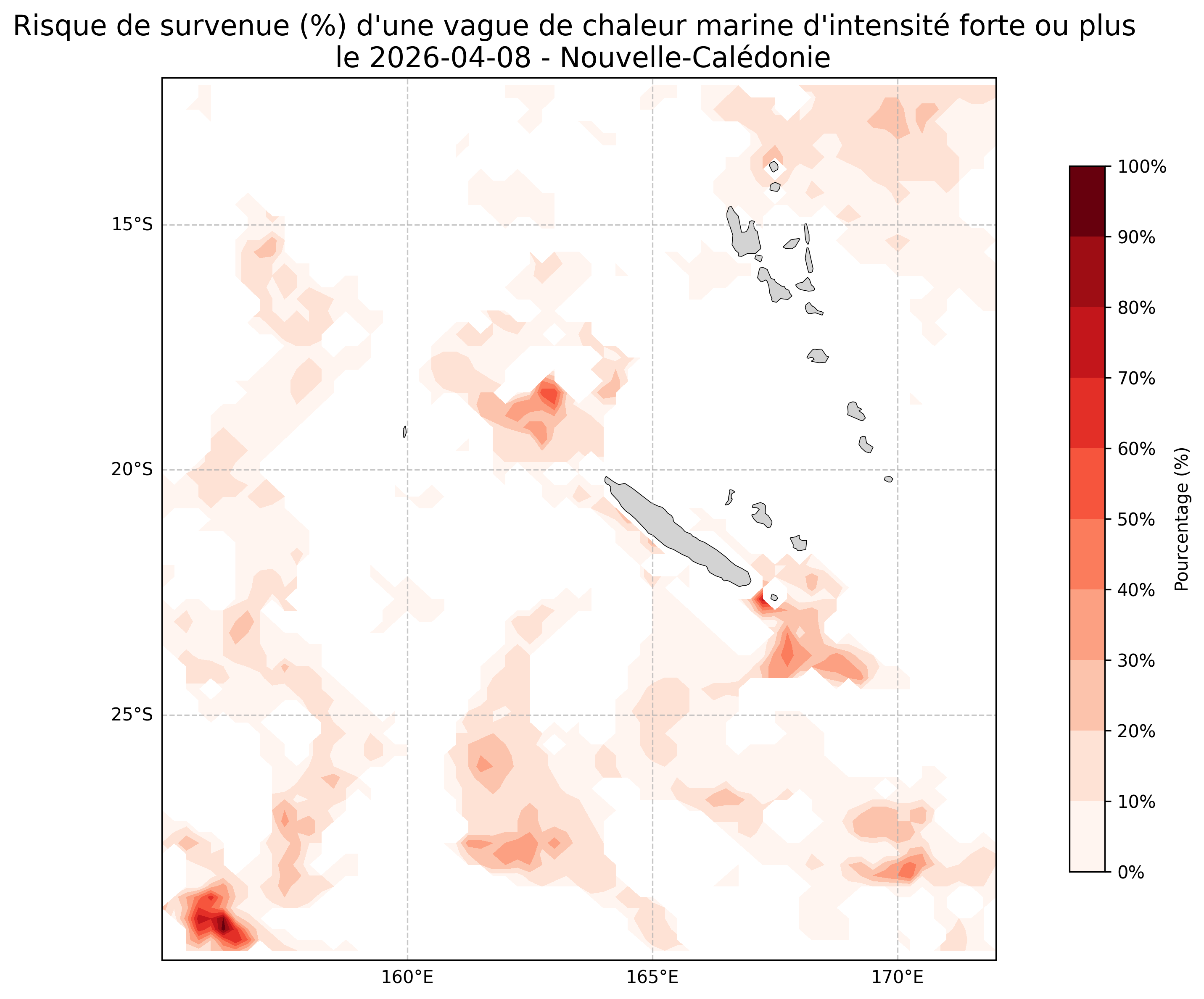 Sur les cartes ci-dessus, les plages de couleurs indiquent la probabilité qu’une vague de chaleur marine d’intensité forte ou plus survienne en chaque point du domaine.