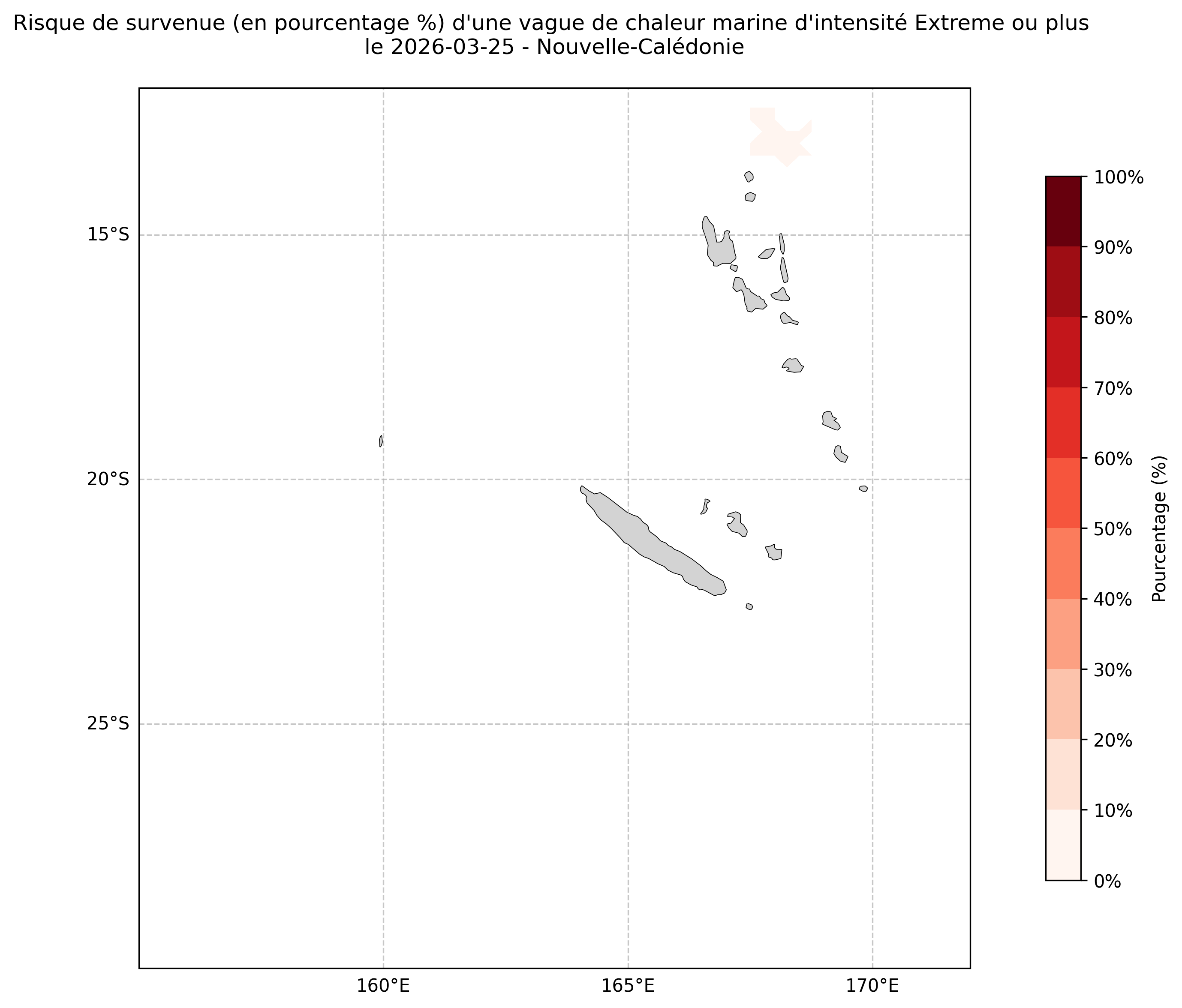 Sur les cartes ci-dessus, les plages de couleurs indiquent la probabilité qu’une vague de chaleur marine d’intensité extrême ou plus survienne en chaque point du domaine.