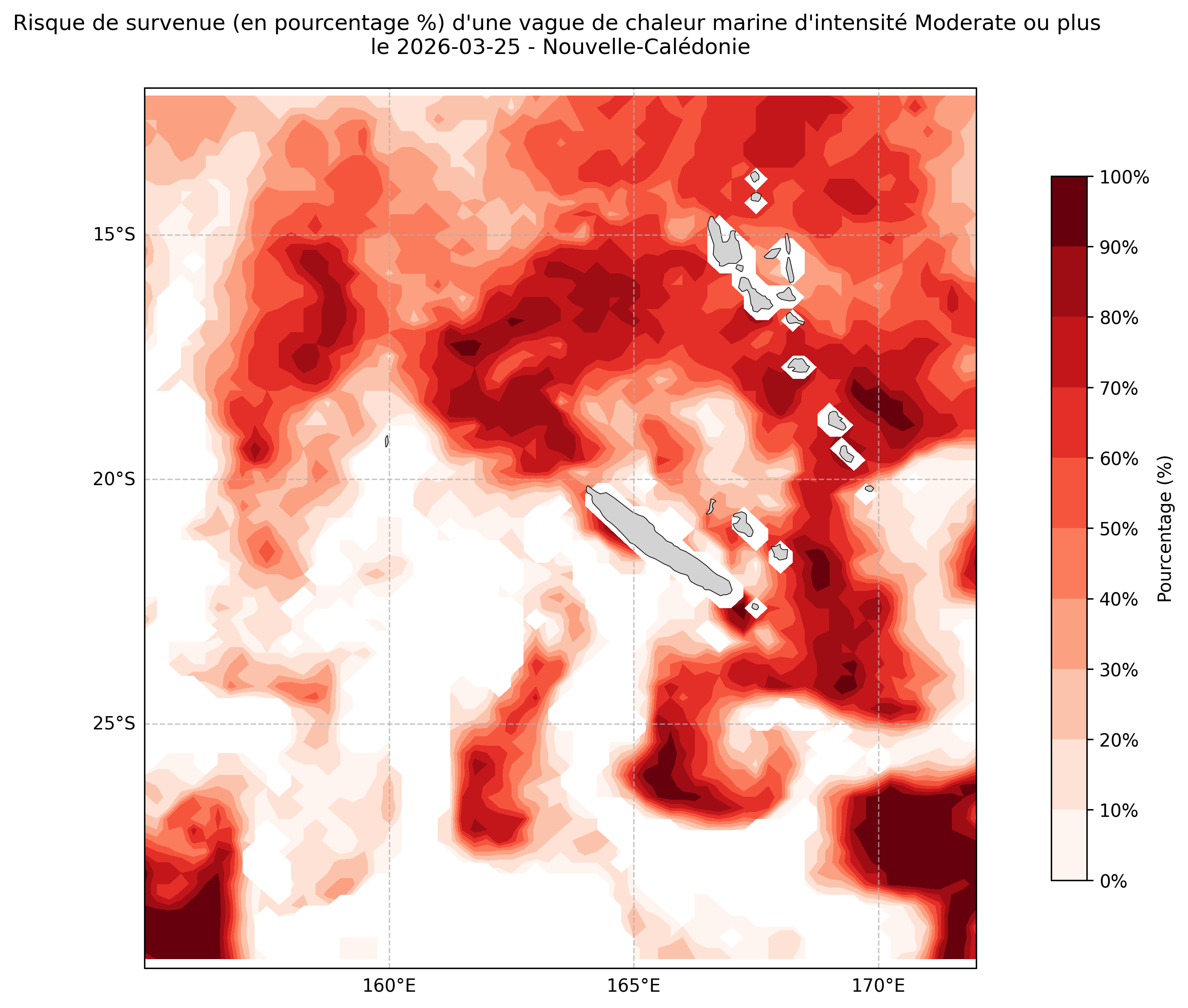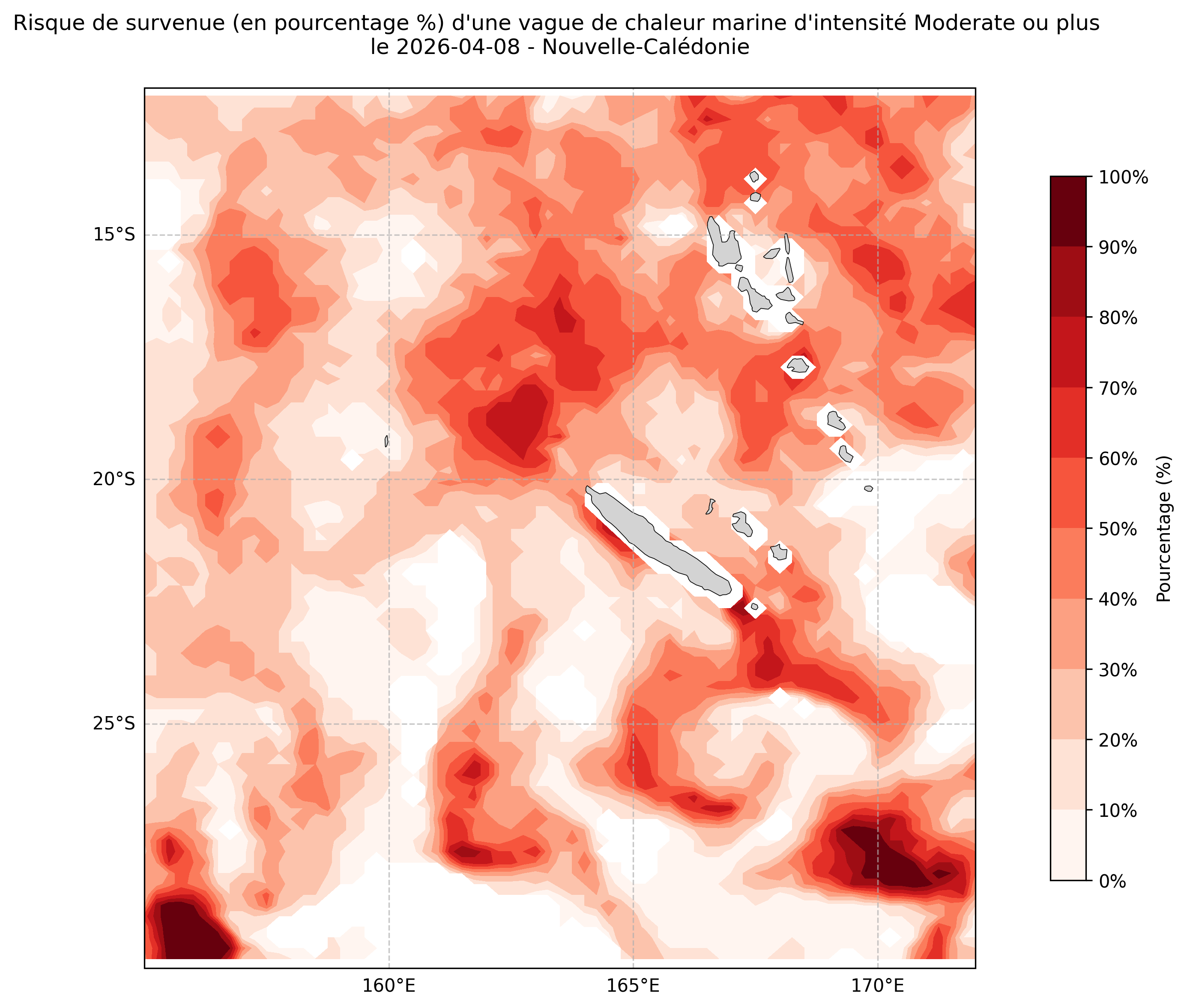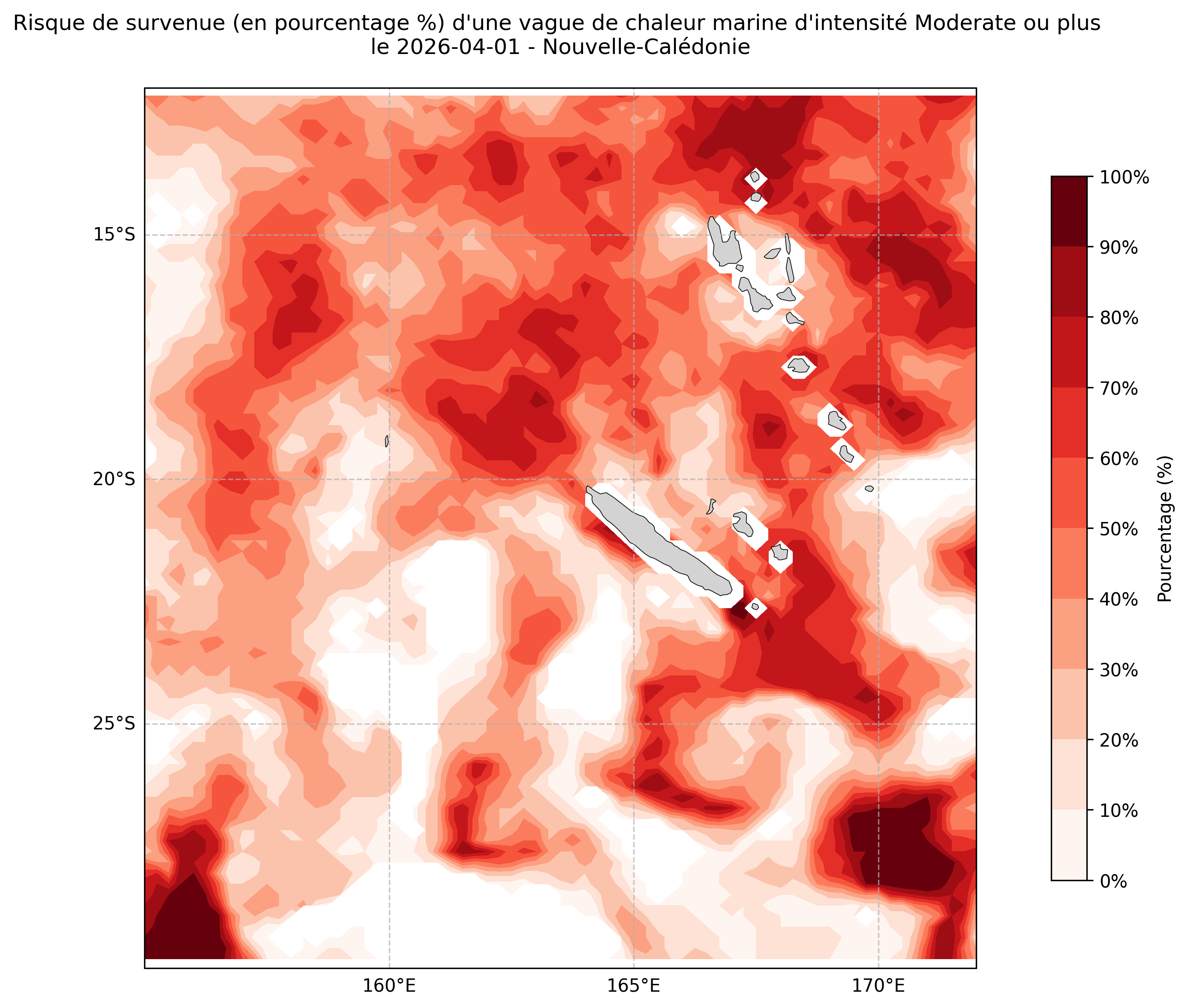 Sur les cartes ci-dessus, les plages de couleurs indiquent la probabilité qu’une vague de chaleur marine d’intensité modérée ou plus survienne en chaque point du domaine.