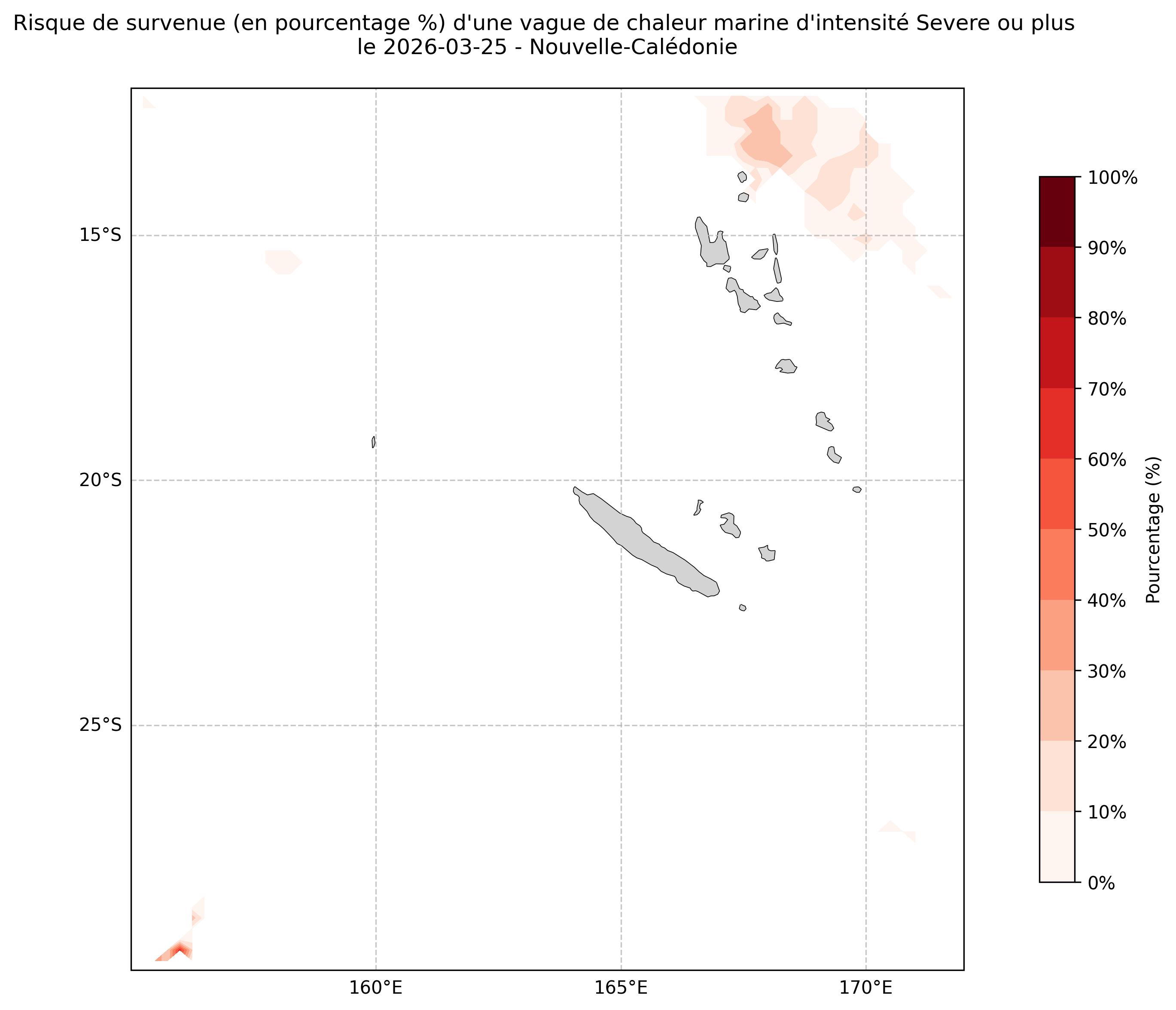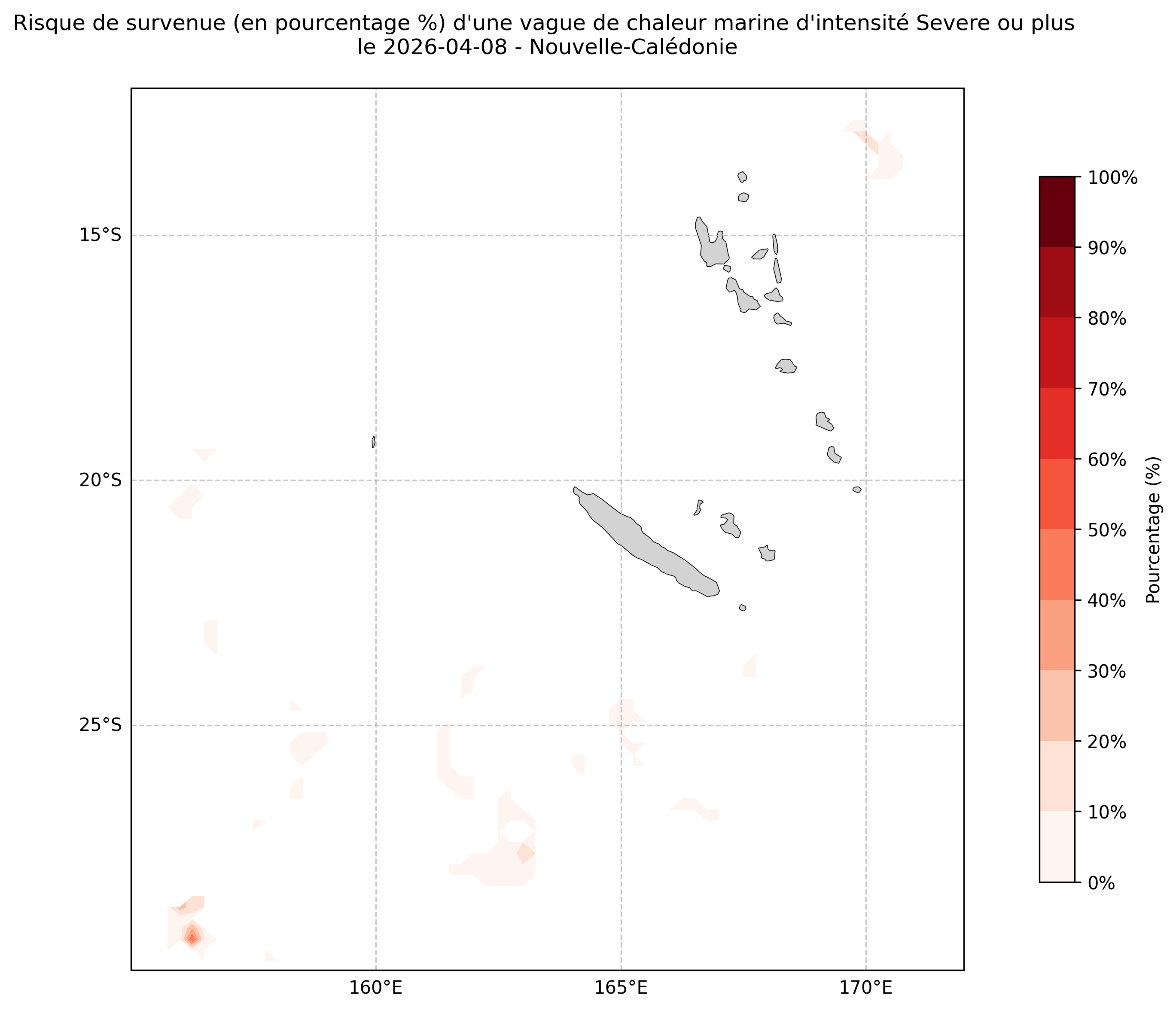 Sur les cartes ci-dessus, les plages de couleurs indiquent la probabilité qu’une vague de chaleur marine d’intensité sévère ou plus survienne en chaque point du domaine.