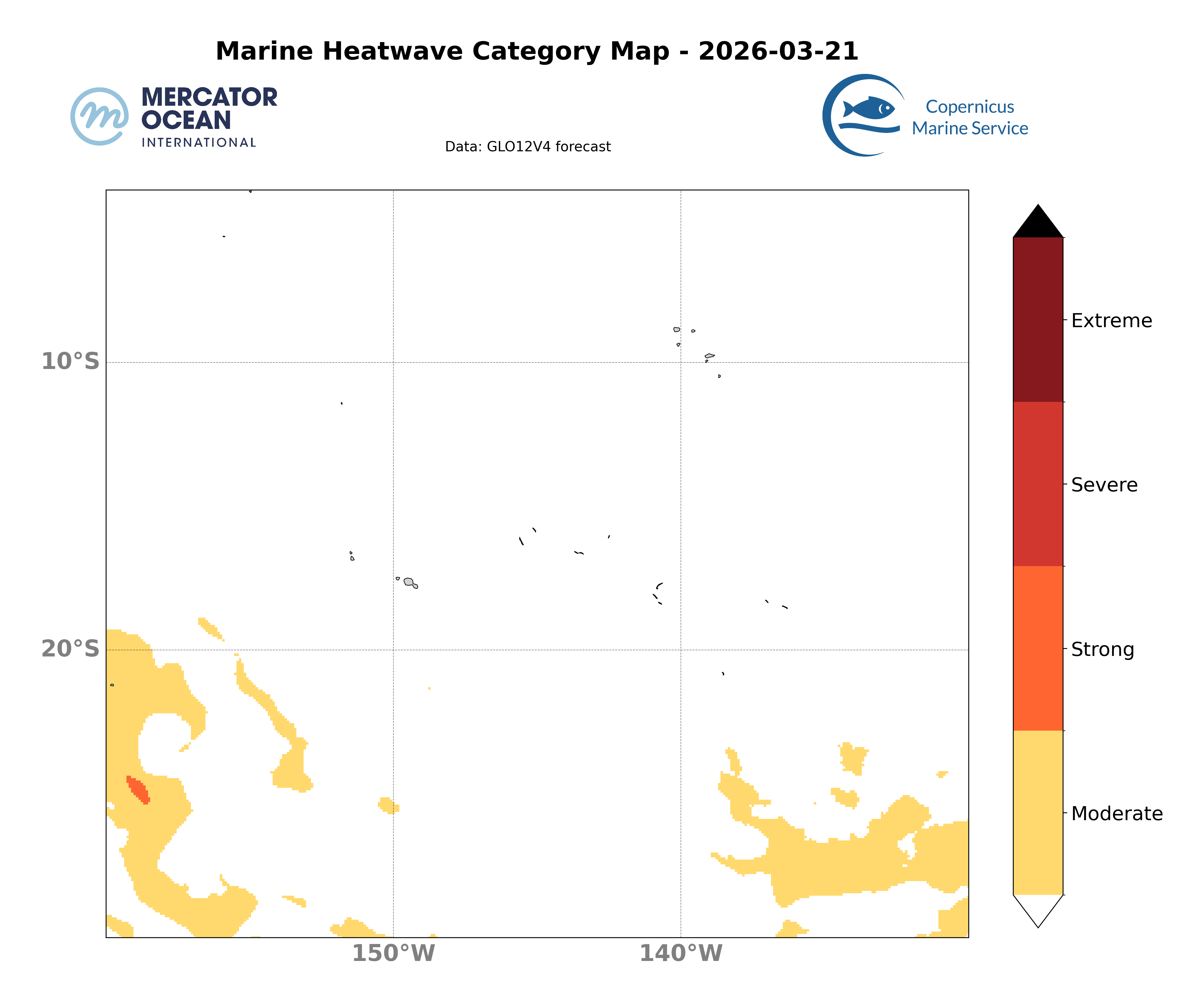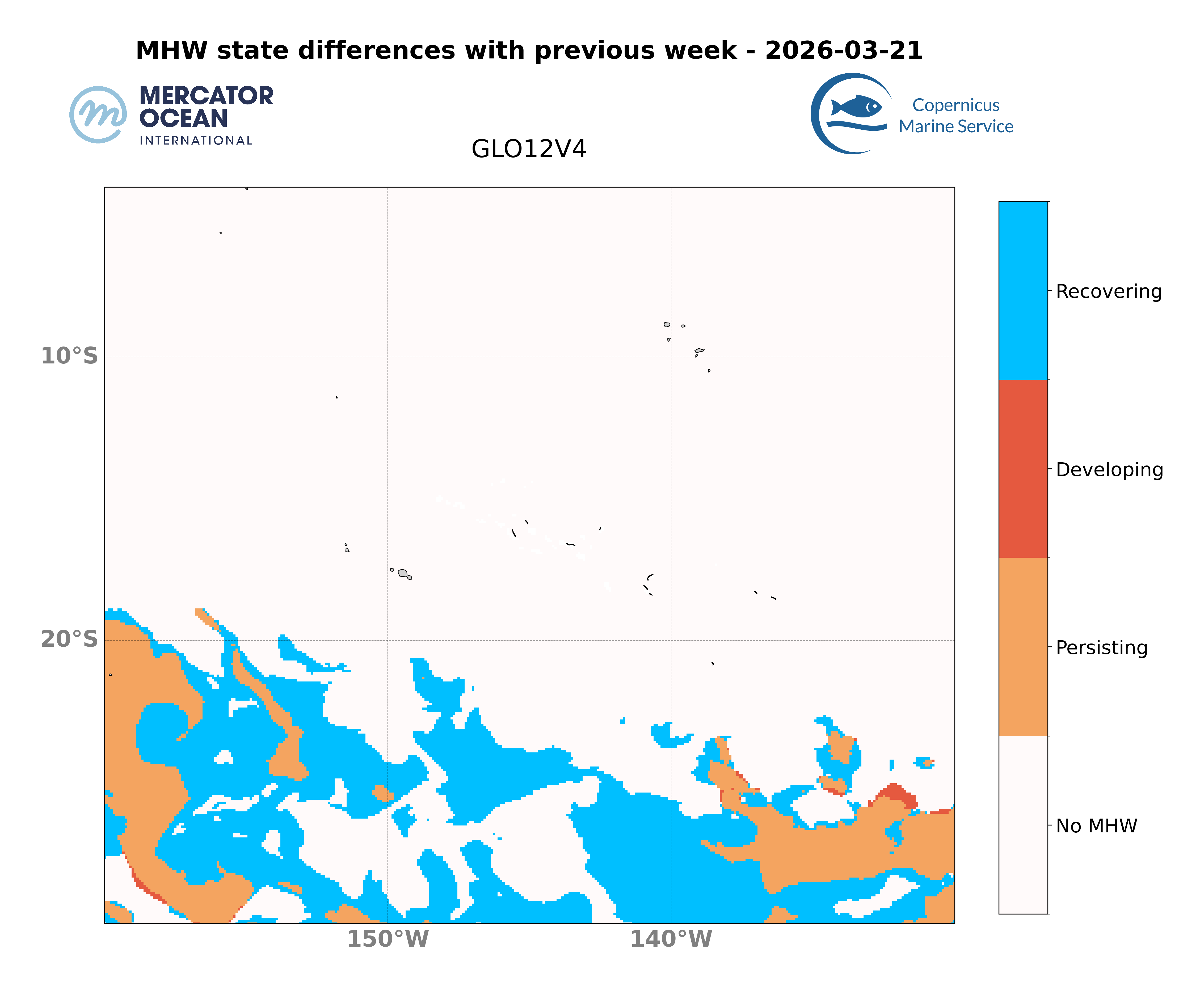 Sur les cartes ci-dessus, la carte de gauche informe sur la probabilité qu’une vague de chaleur marine survienne à échéance J+10 en chaque point du domaine et informe sur la catégorie attendue. La carte de droite permet d’évaluer l’évolution du phénomène par rapport à l’analyse de J-10.