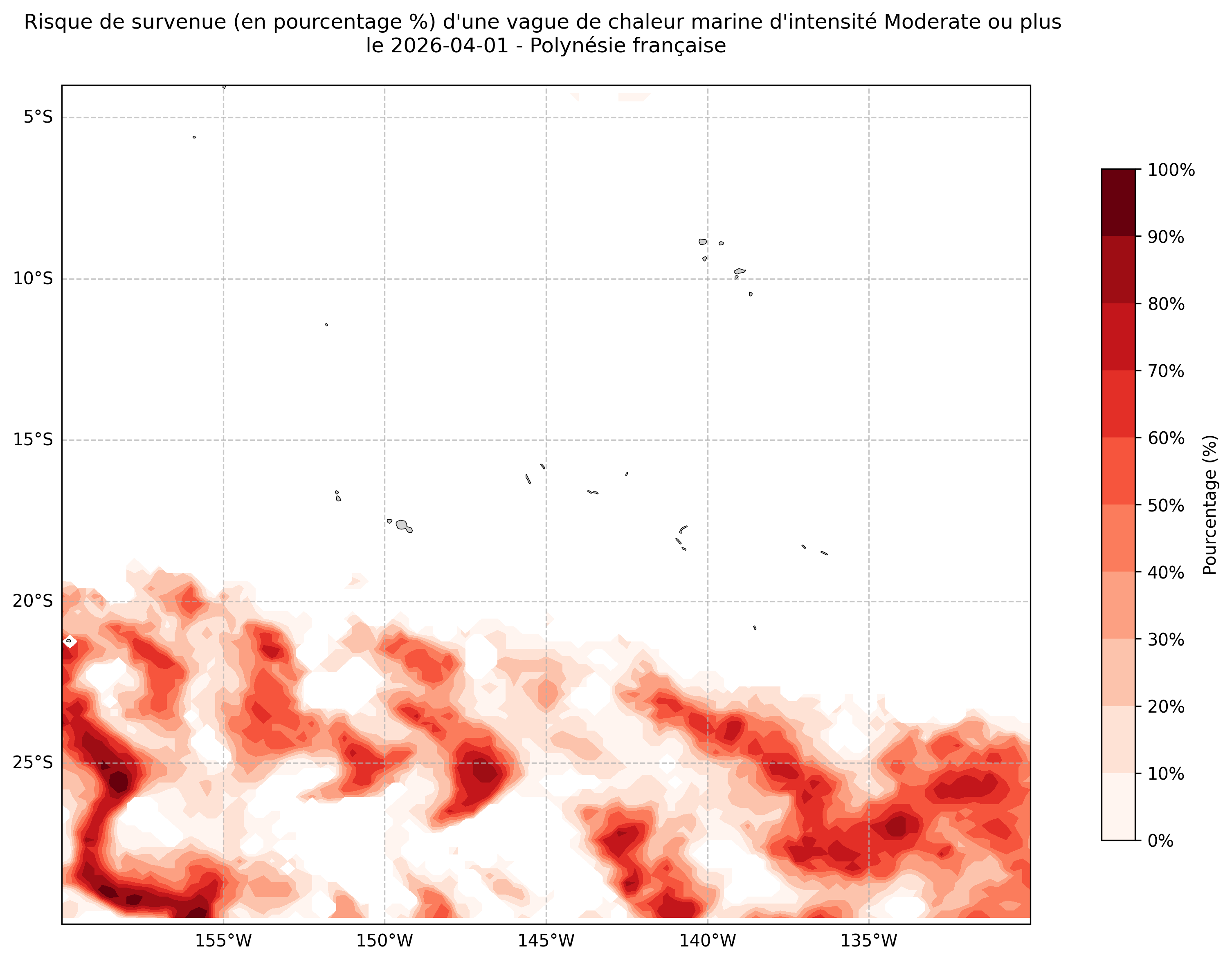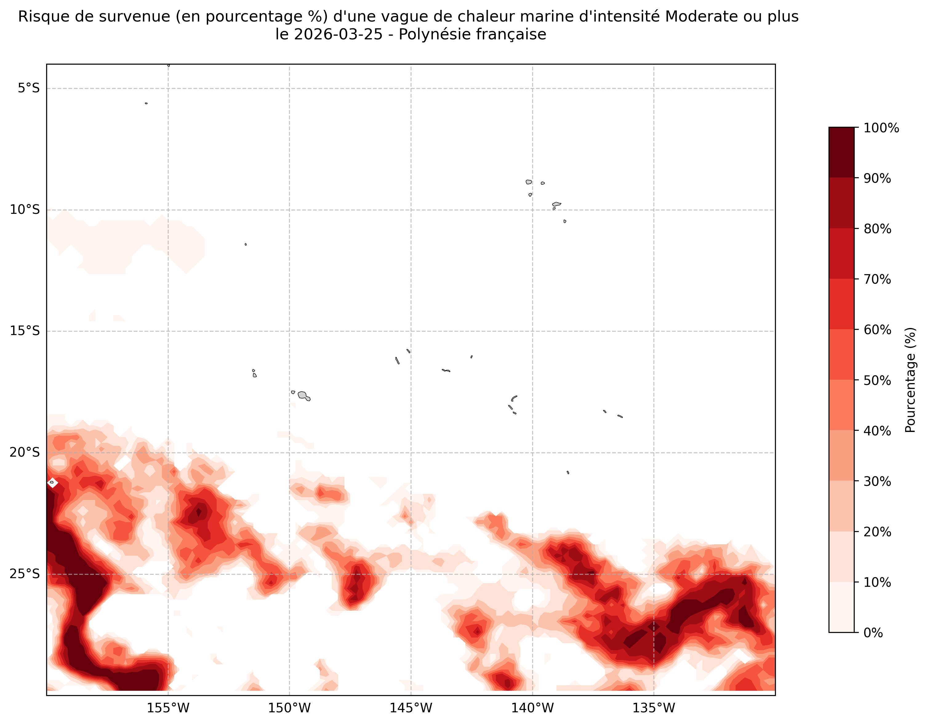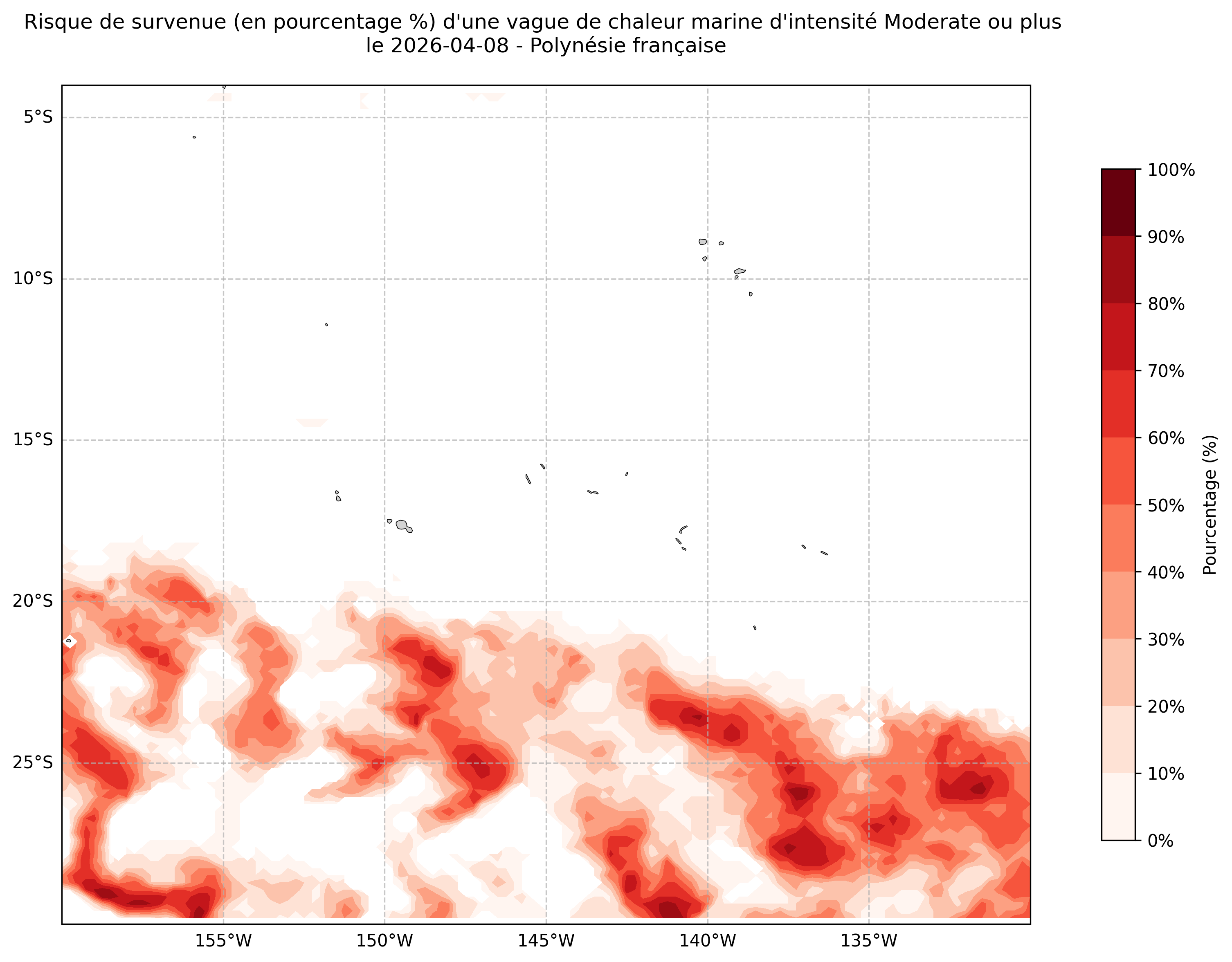 Sur les cartes ci-dessus, les plages de couleurs indiquent la probabilité qu’une vague de chaleur marine d’intensité modérée ou plus survienne en chaque point du domaine.