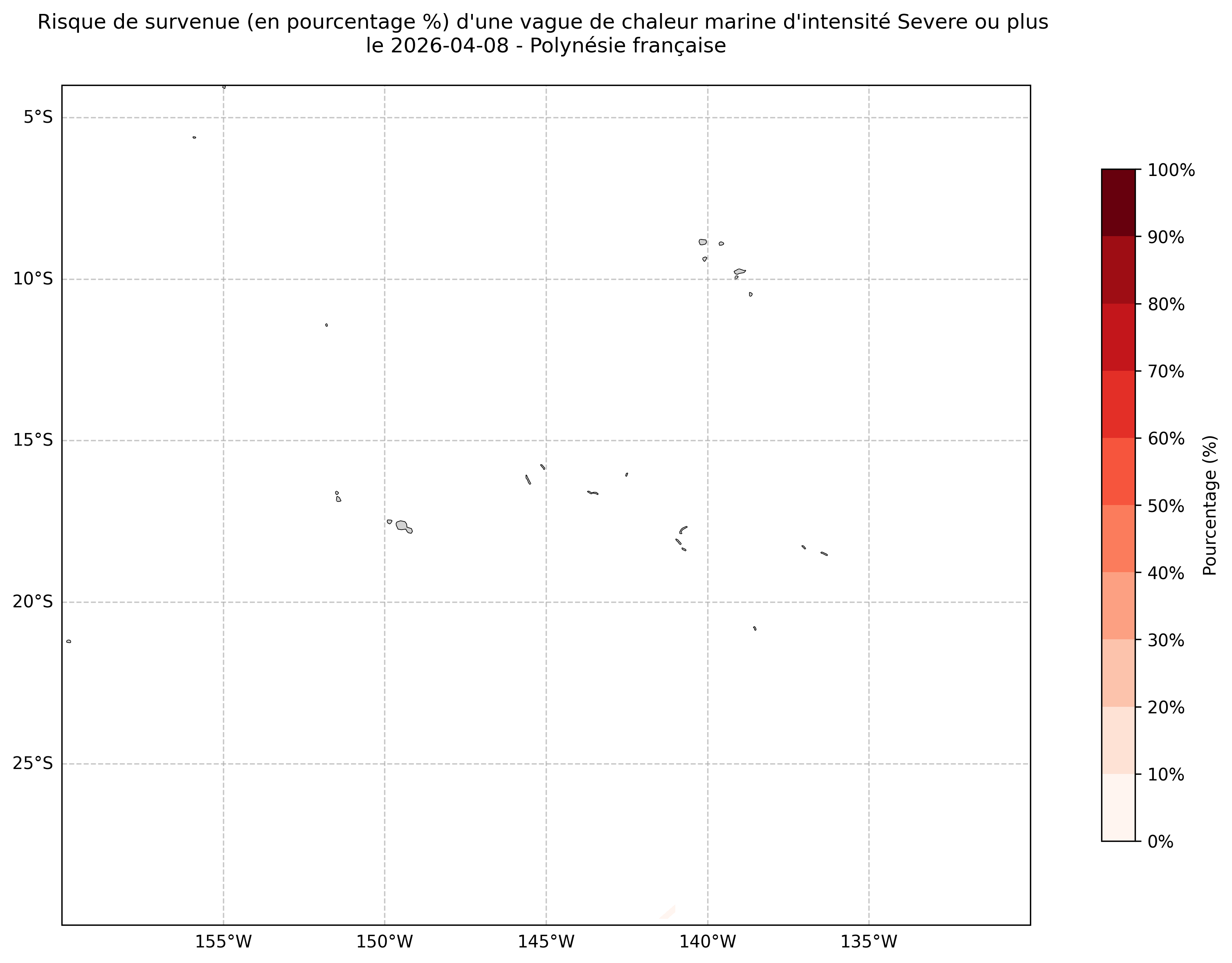Sur les cartes ci-dessus, les plages de couleurs indiquent la probabilité qu’une vague de chaleur marine d’intensité sévère ou plus survienne en chaque point du domaine.