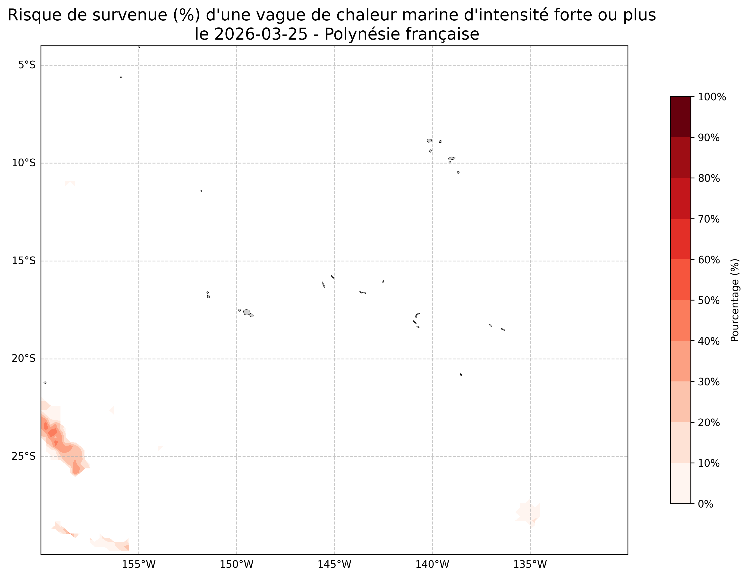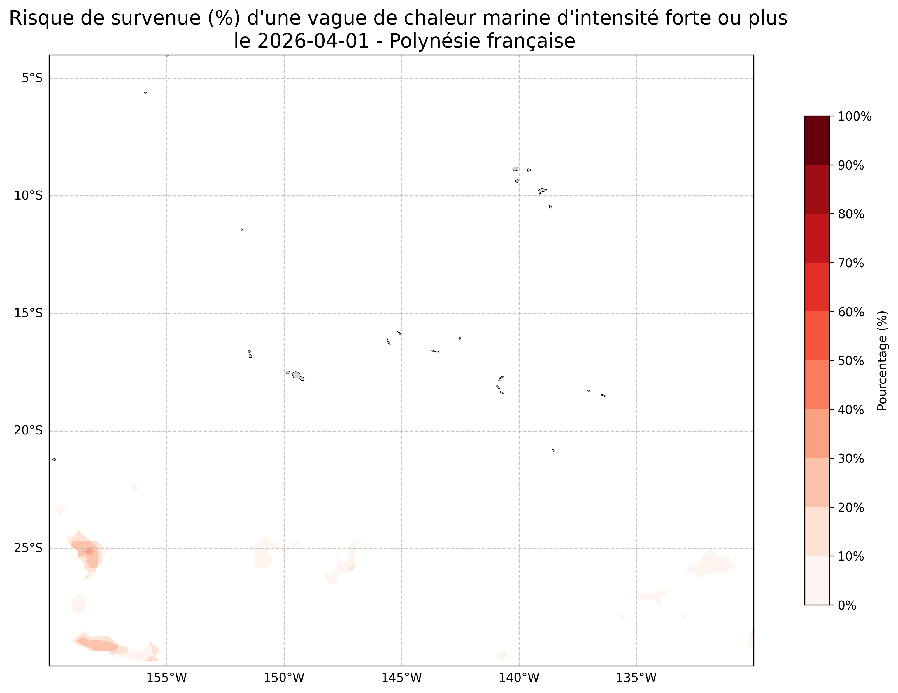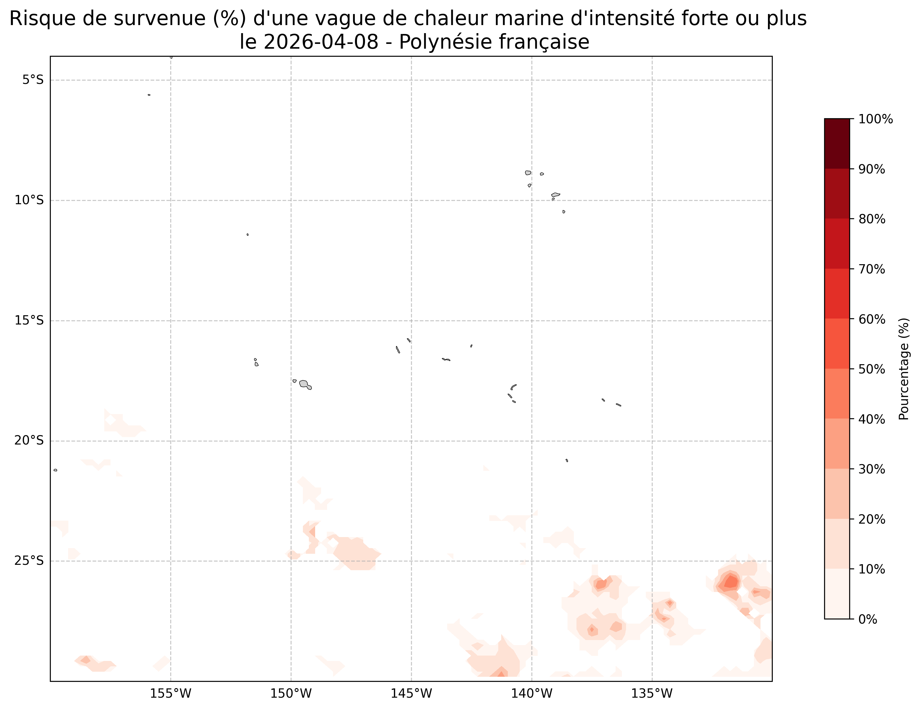 Sur les cartes ci-dessus, les plages de couleurs indiquent la probabilité qu’une vague de chaleur marine d’intensité forte ou plus survienne en chaque point du domaine.