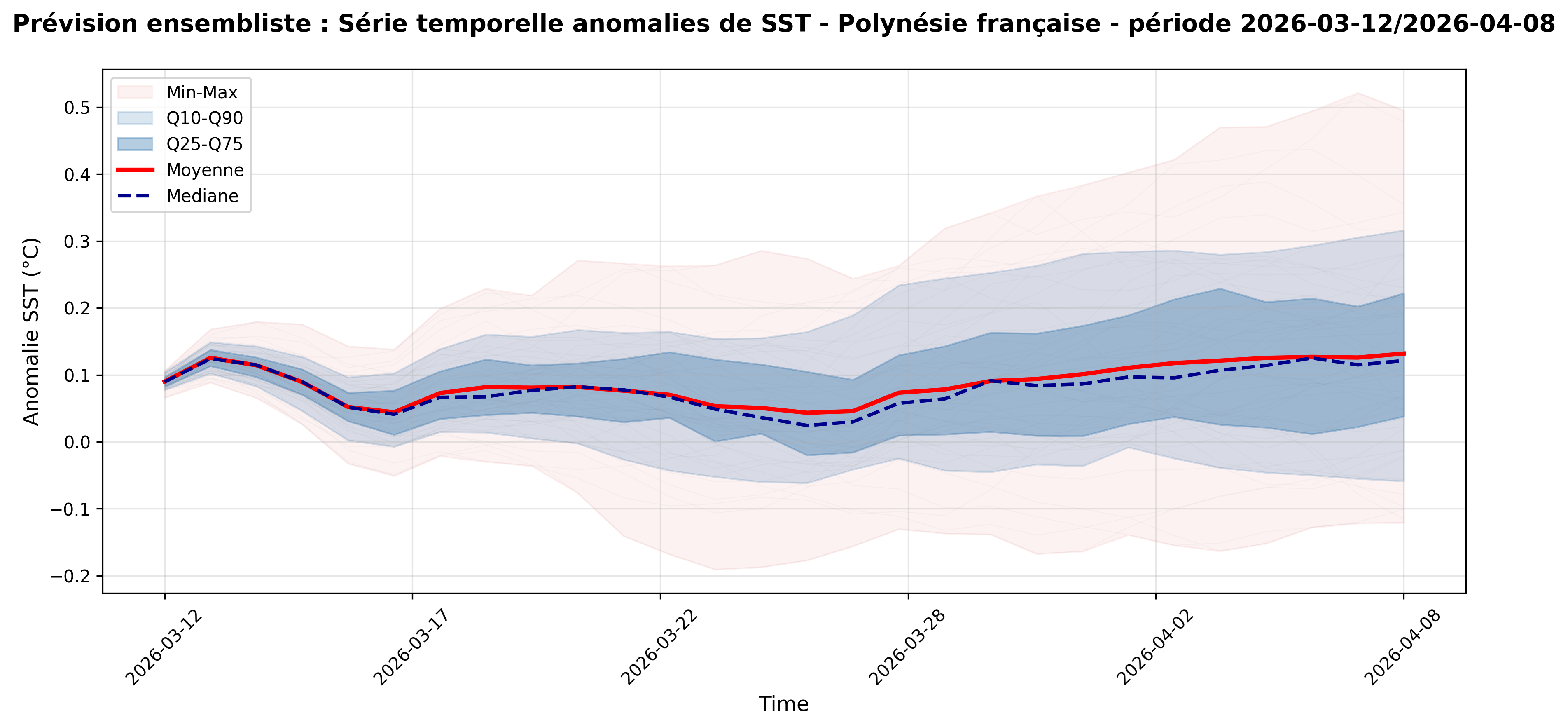 - PF: Légère baisse des anomalies positives, en début de période. Température moyenne proche des normales climatiques. Faible augmentation de l’anomalie moyenne sur les 2 dernières semaines.
