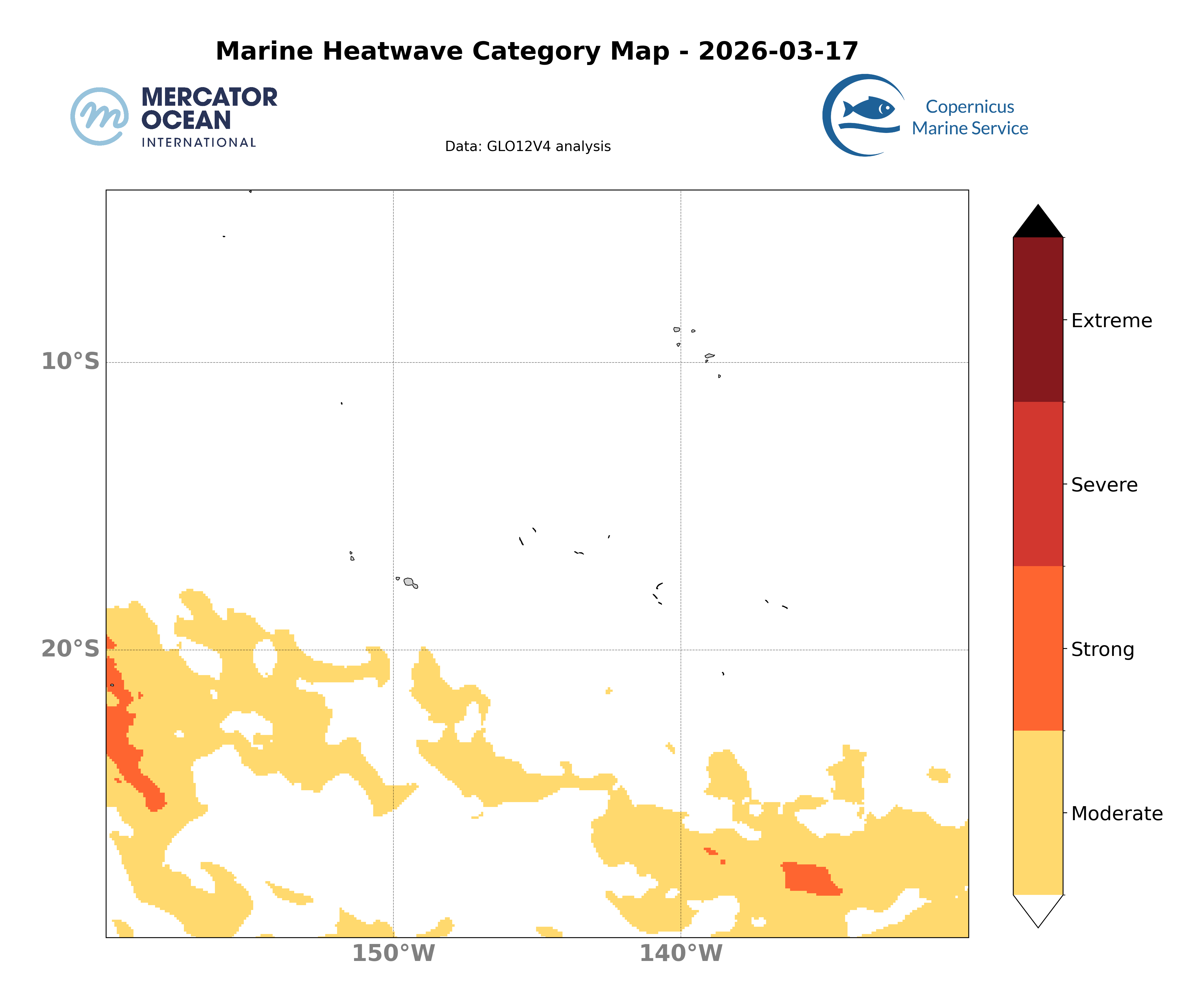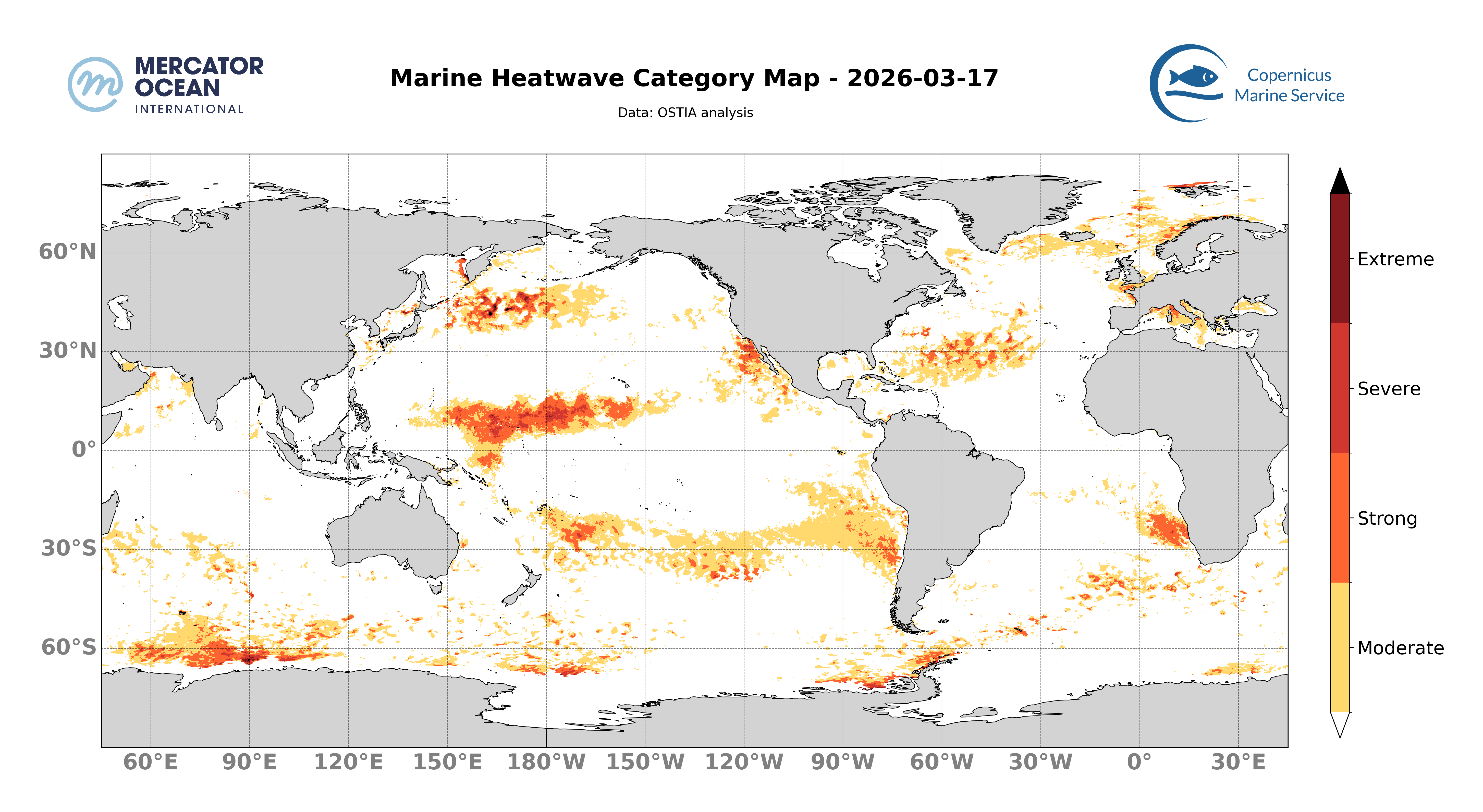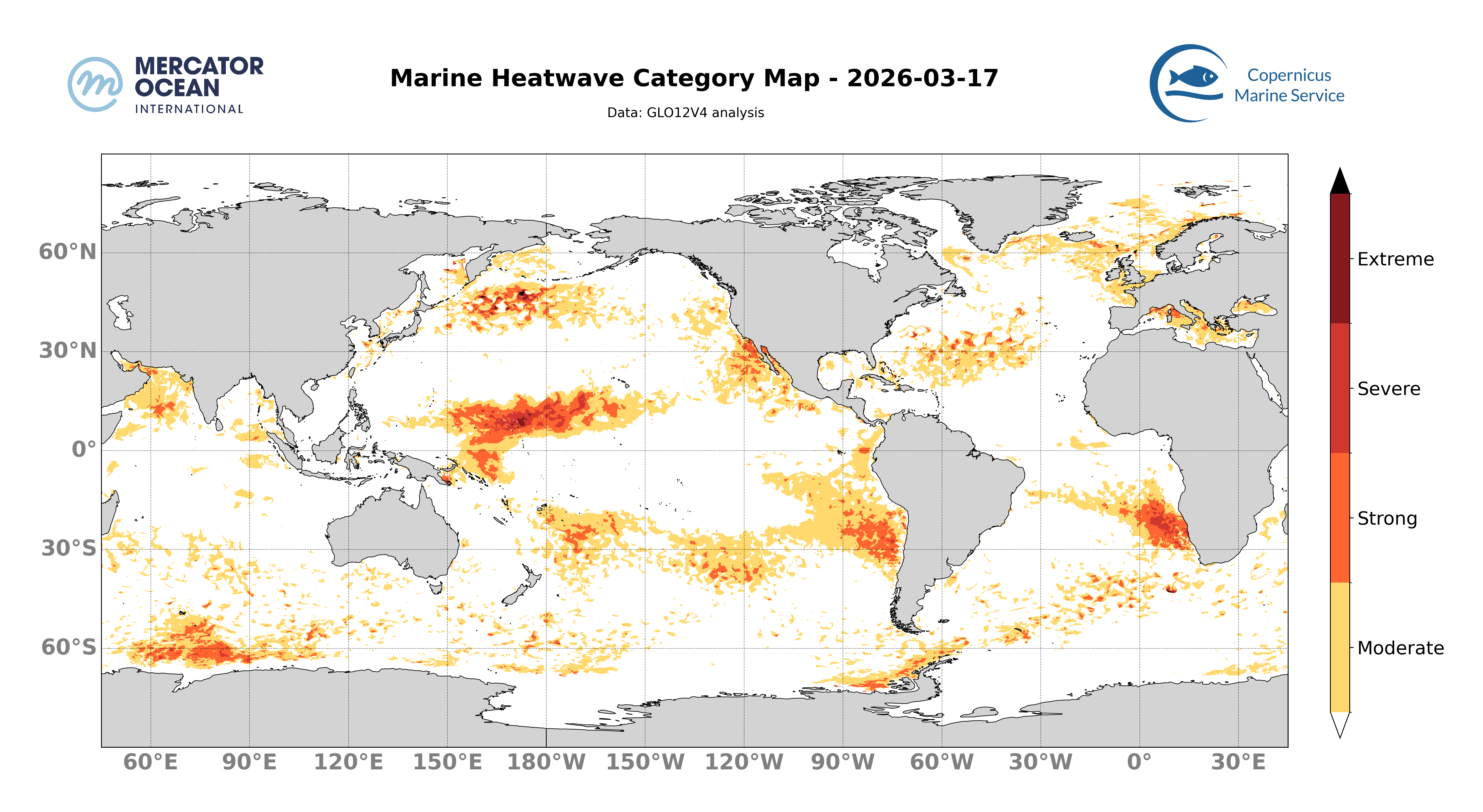 Les cartes ci-dessus montrent les dernières analyses Mercator du système opérationnel (GLO12) concernant la présence spatiale d’un évènement de vague de chaleur ainsi que la catégorie associée à l’échelle d’un domaine.
