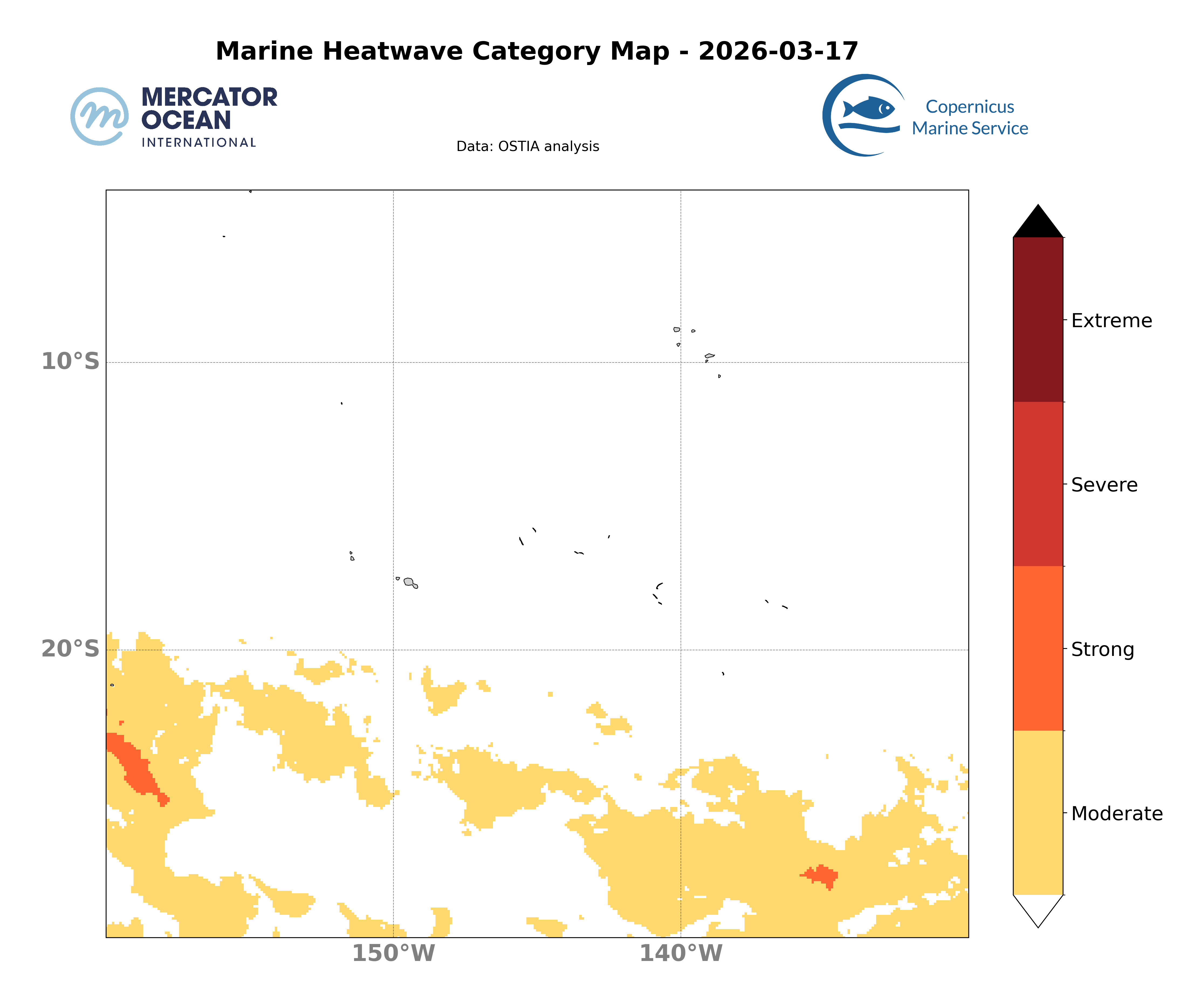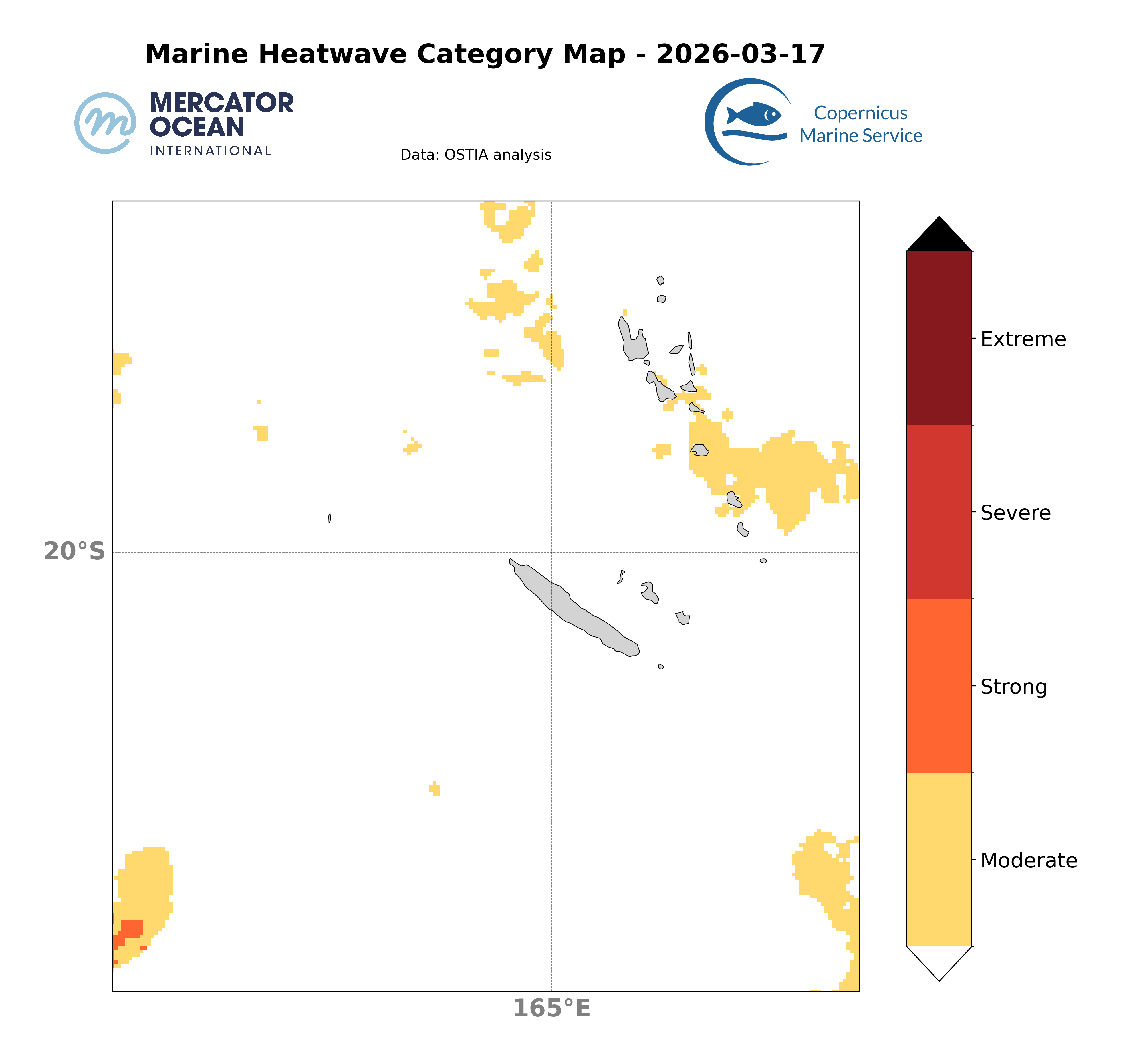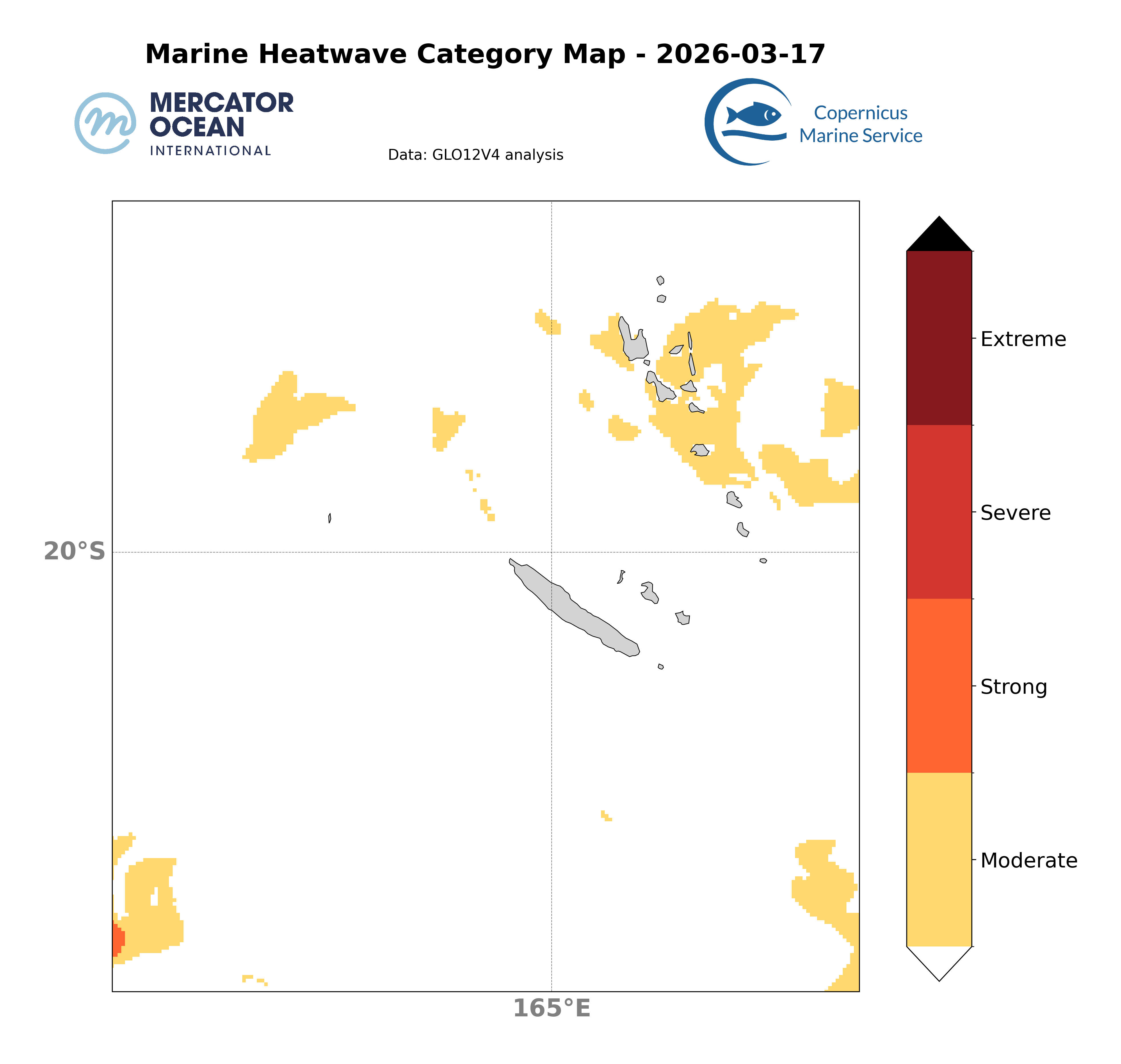 Les cartes ci-dessus montrent les dernières analyses Mercator du système opérationnel (GLO12) concernant la présence spatiale d’un évènement de vague de chaleur ainsi que la catégorie associée à l’échelle d’un domaine.