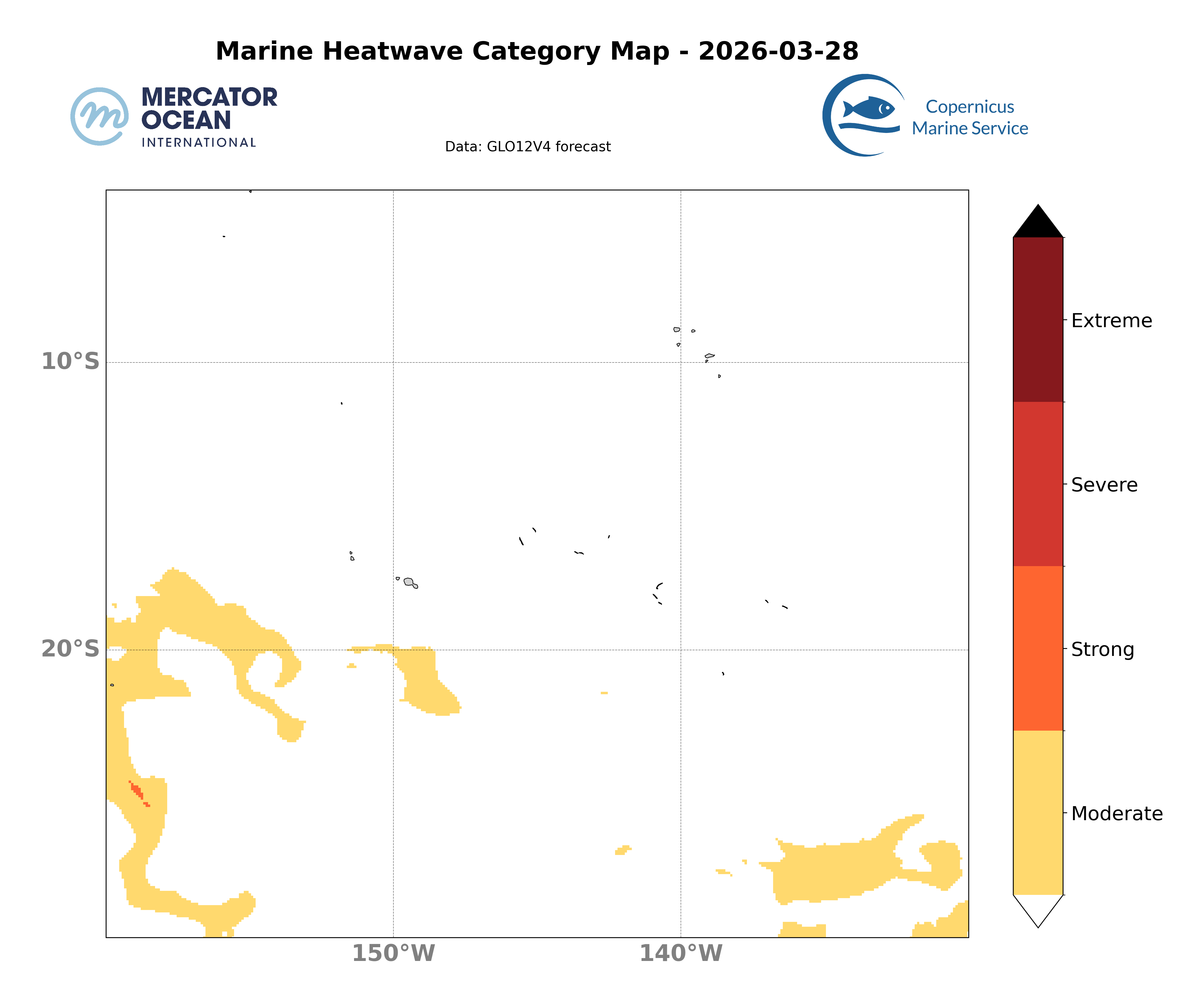 Sur les cartes ci-dessus, la carte de gauche informe sur la prévision des catégories des canicules marines survenant à échéance J+10 en chaque point du domaine. La carte de droite permet d’évaluer l’évolution du phénomène par rapport à l’analyse de J-10.