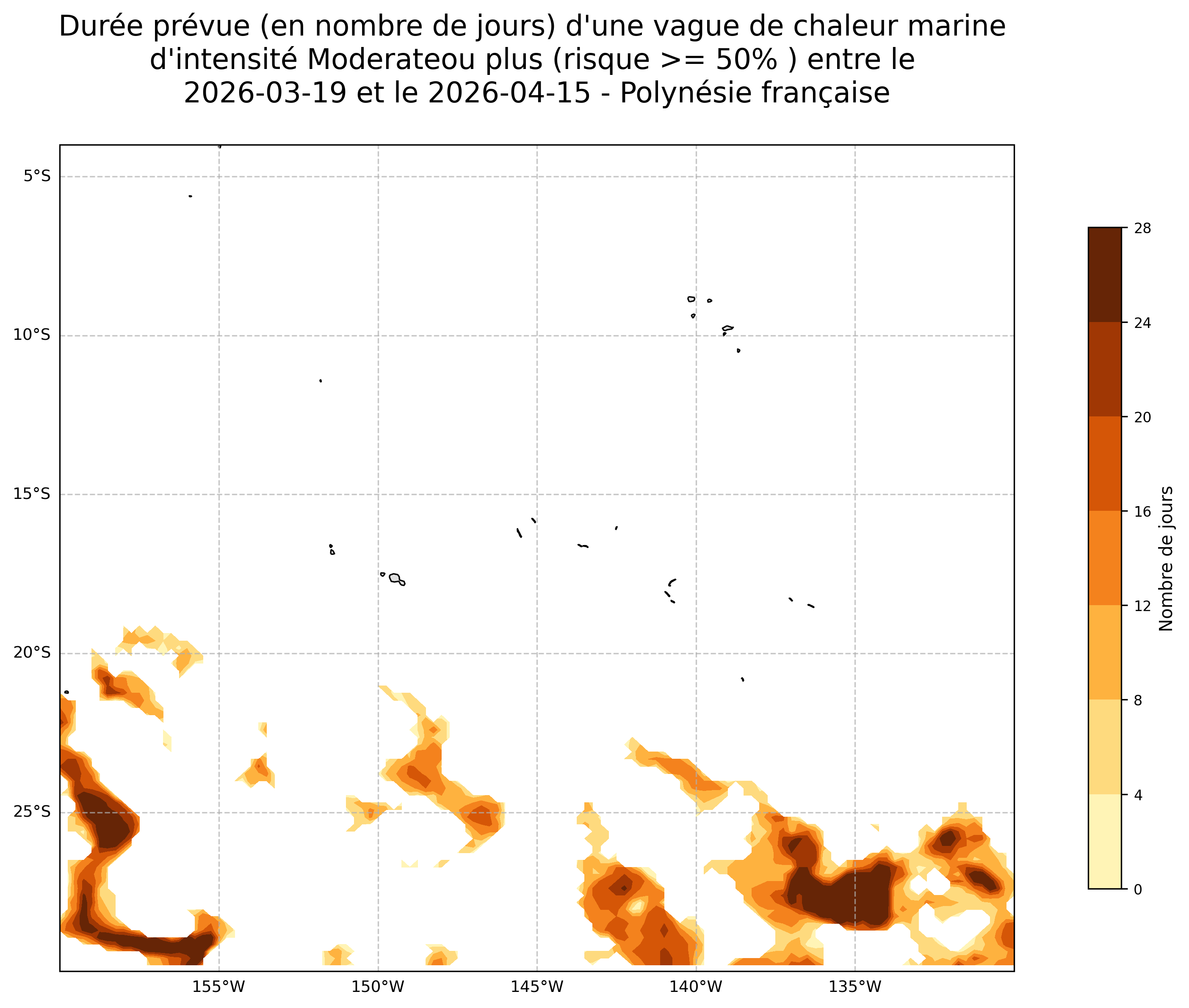 Sur les cartes ci-dessus, les plages de couleurs indiquent la durée potentielle en jours qu’une vague de chaleur marine d’intensité modérée, forte, sévère, extrême ou plus surviennent en chaque point du domaine.