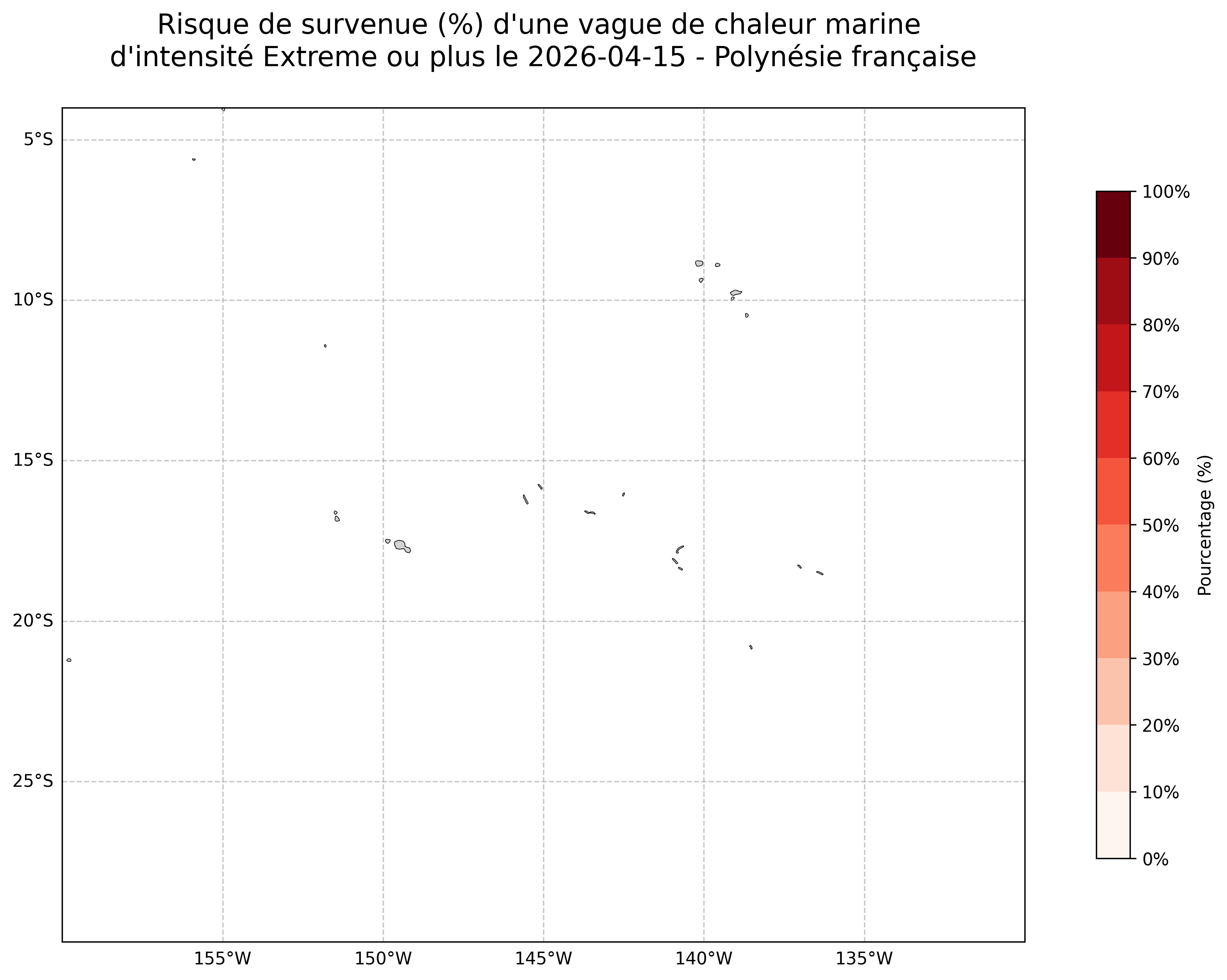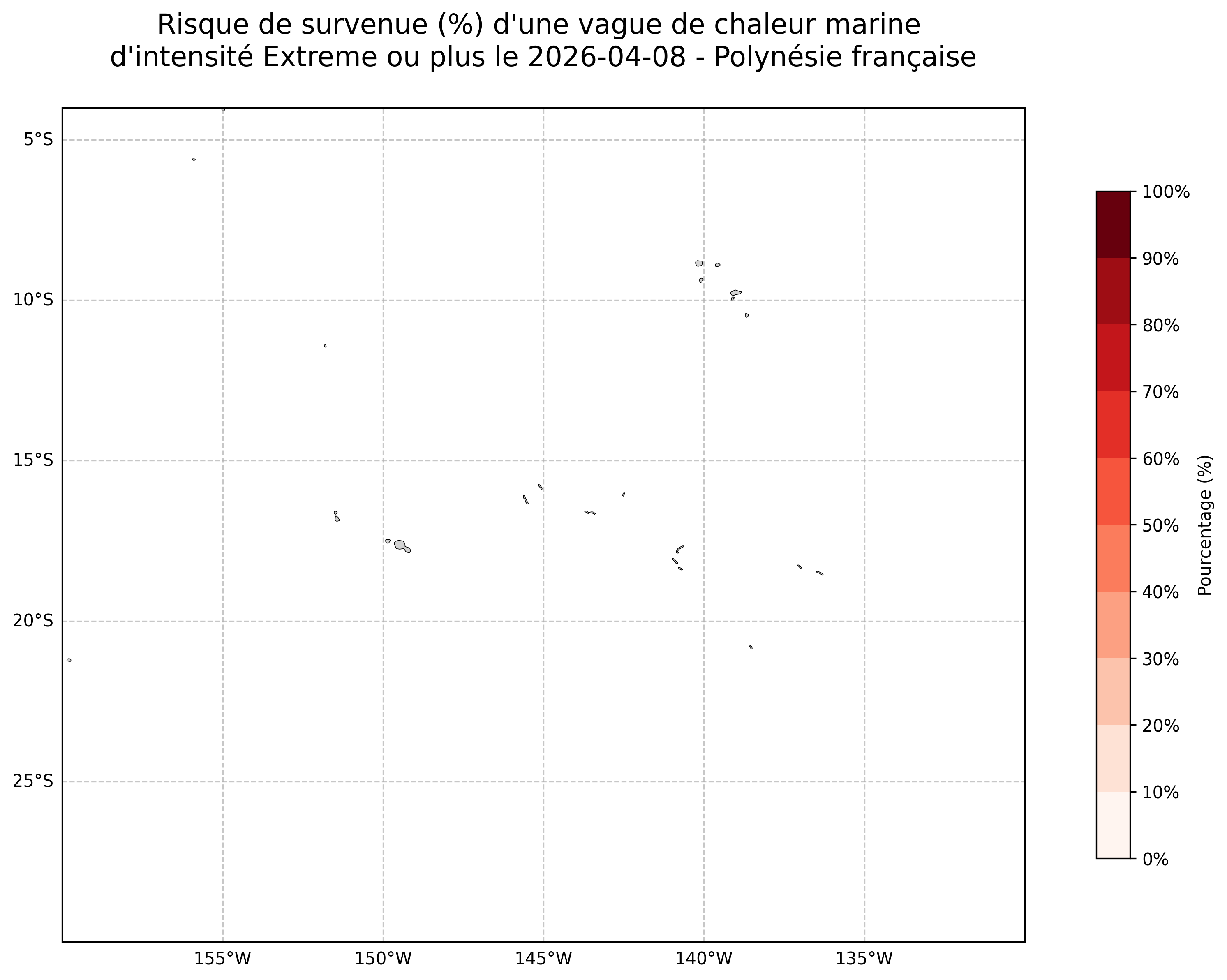 Sur les cartes ci-dessus, les plages de couleurs indiquent la probabilité qu’une vague de chaleur marine d’intensité extrême ou plus survienne en chaque point du domaine.