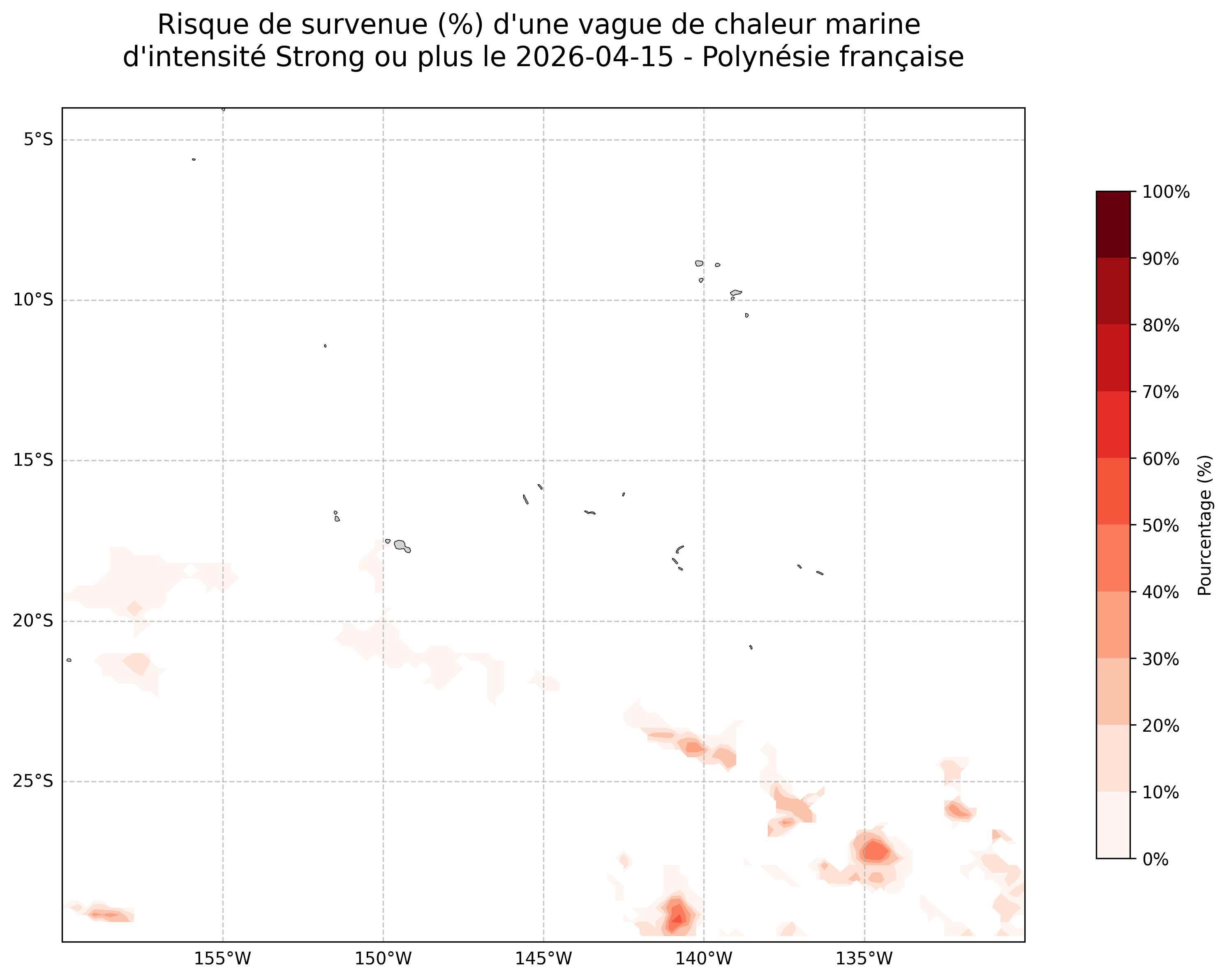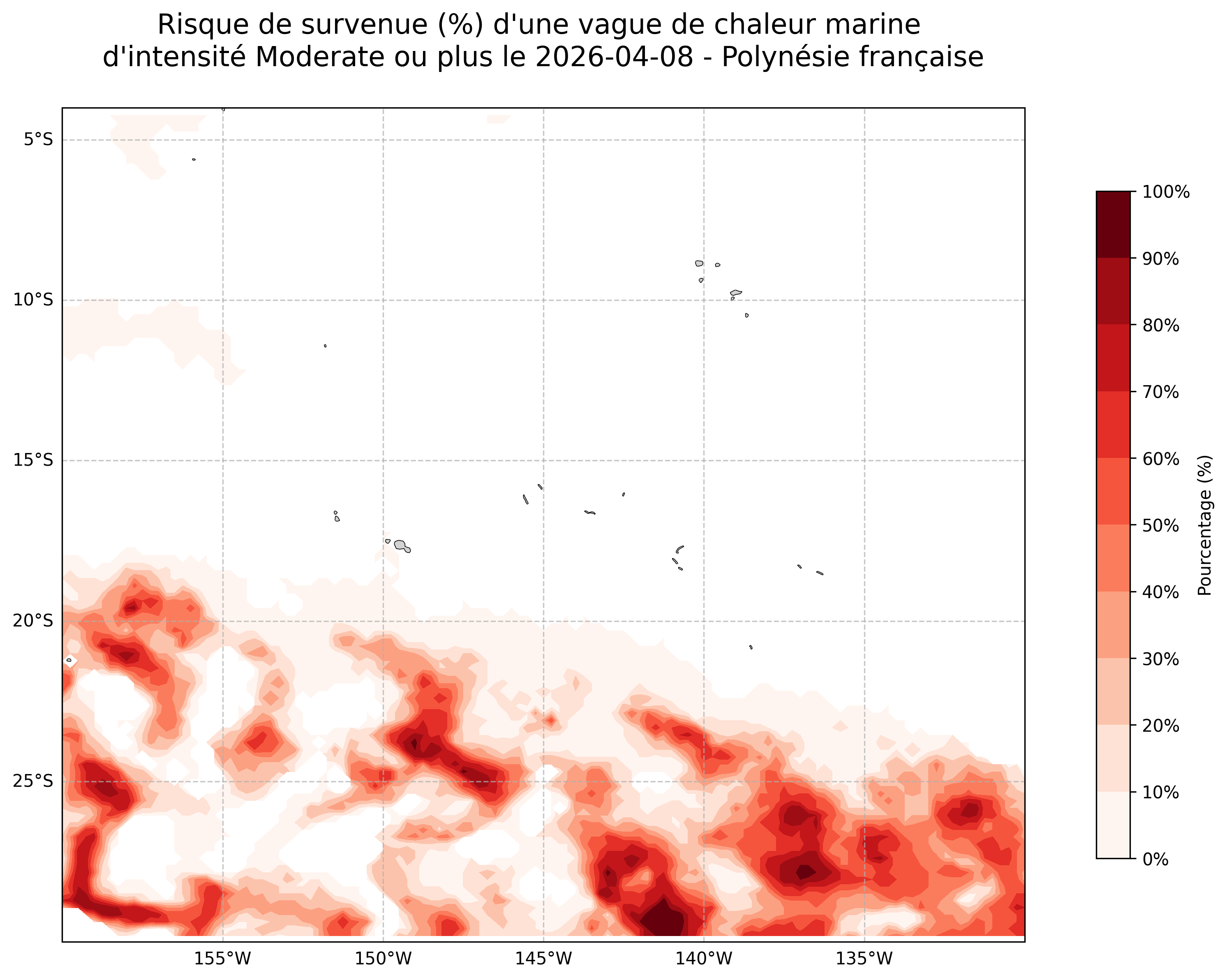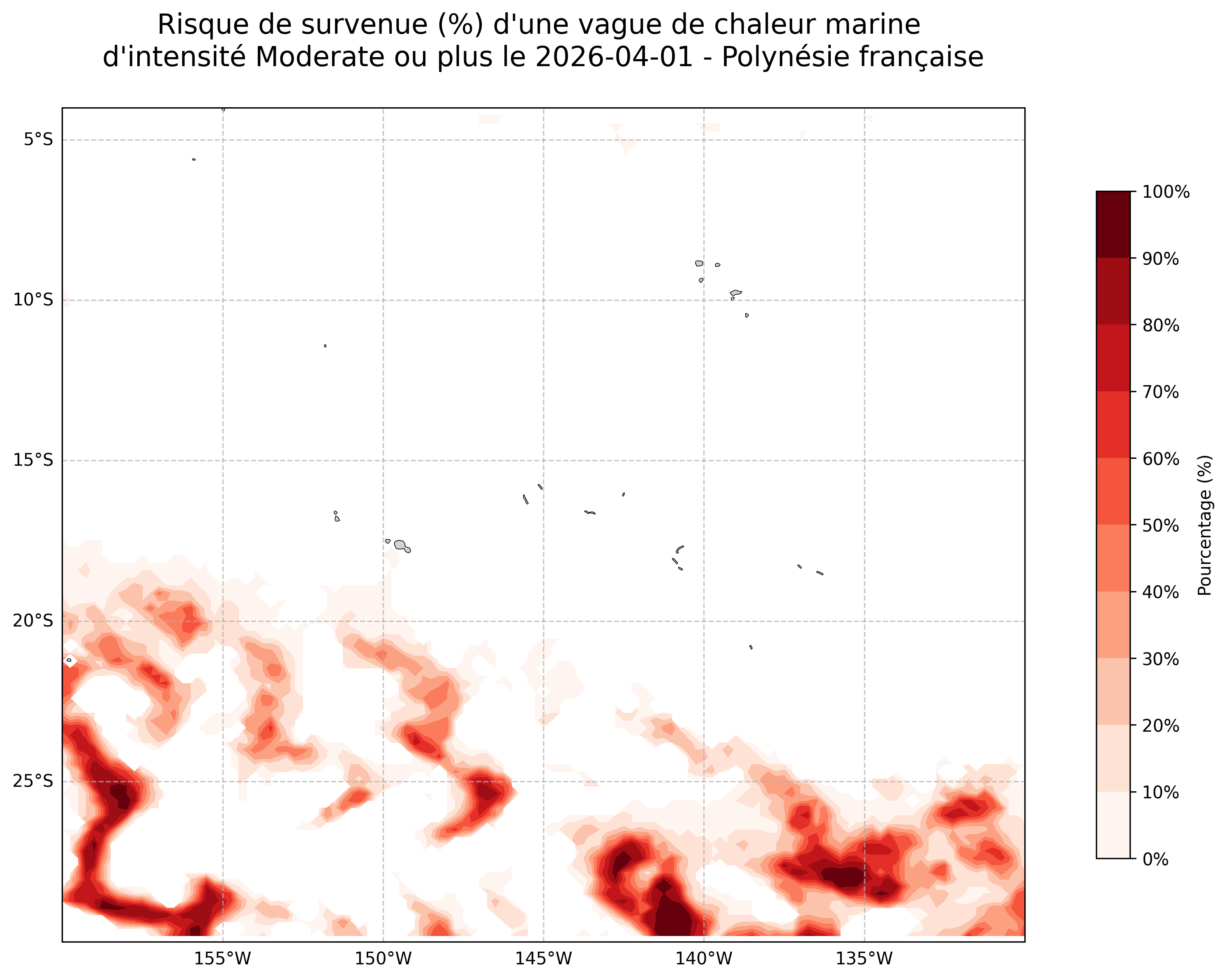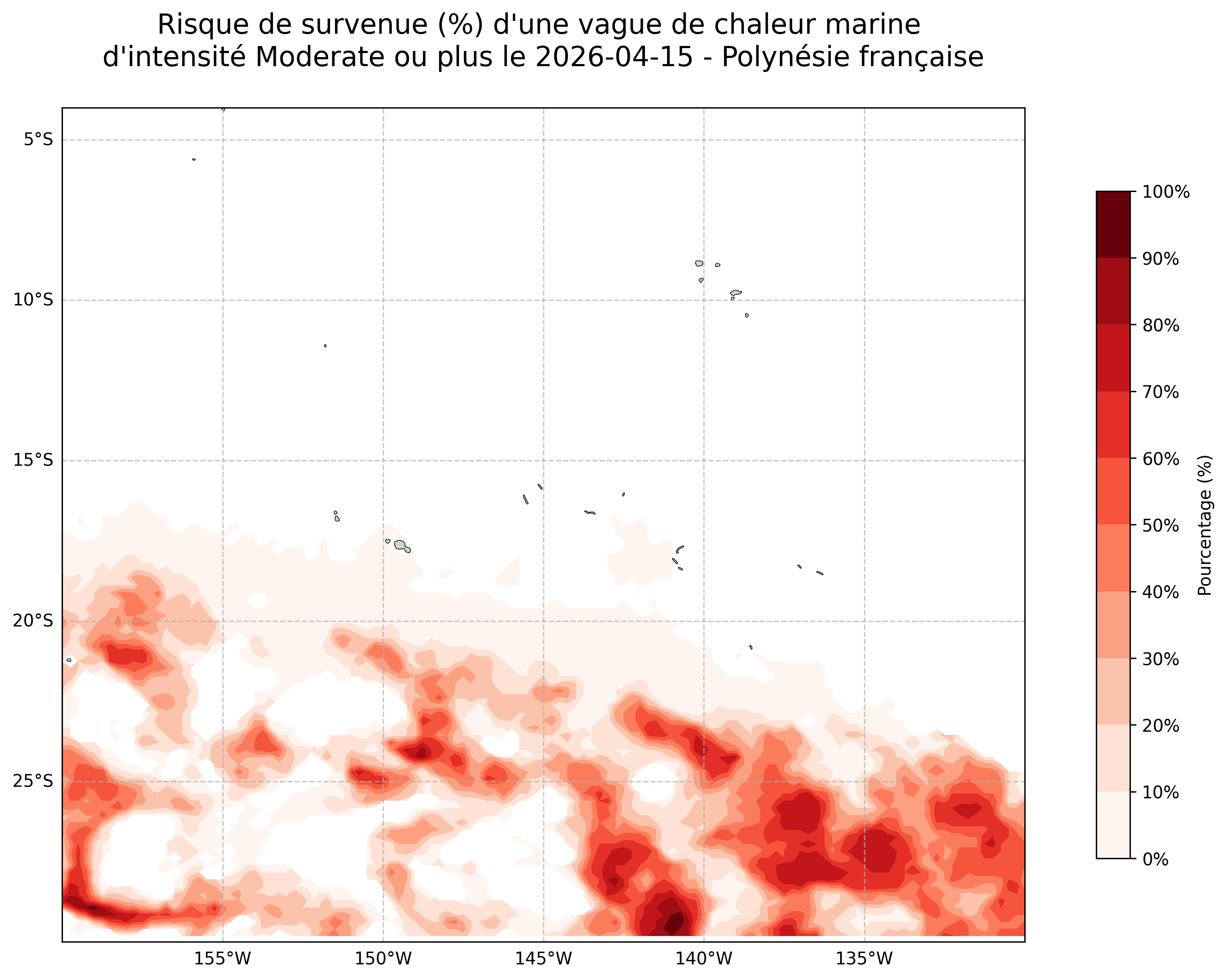 Sur les cartes ci-dessus, les plages de couleurs indiquent la probabilité qu’une vague de chaleur marine d’intensité modérée ou plus survienne en chaque point du domaine.