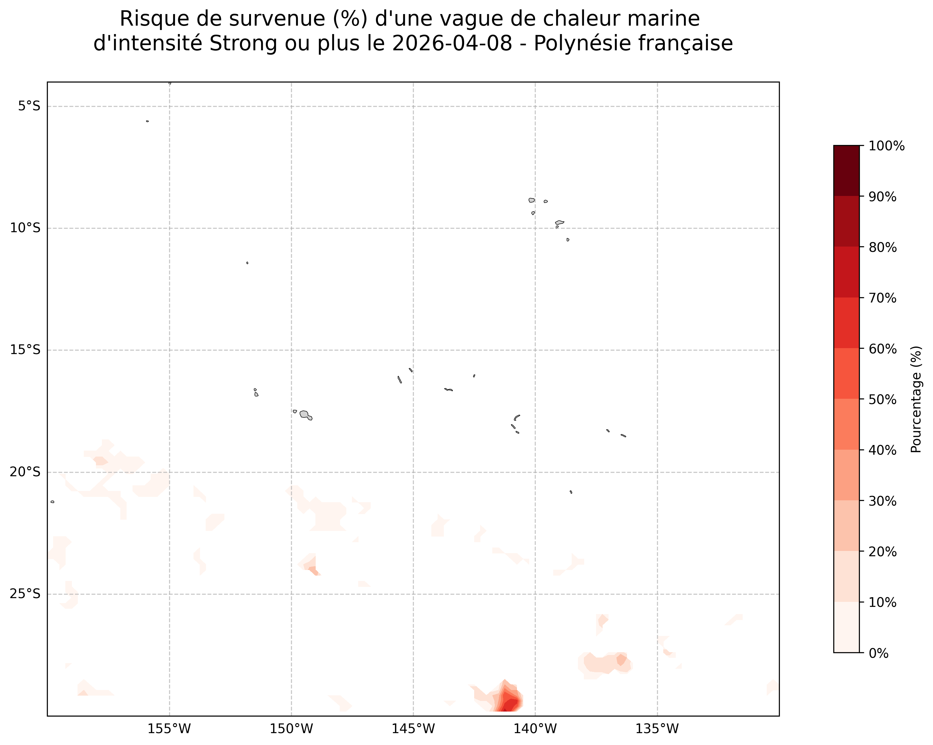 Sur les cartes ci-dessus, les plages de couleurs indiquent la probabilité qu’une vague de chaleur marine d’intensité forte ou plus survienne en chaque point du domaine.