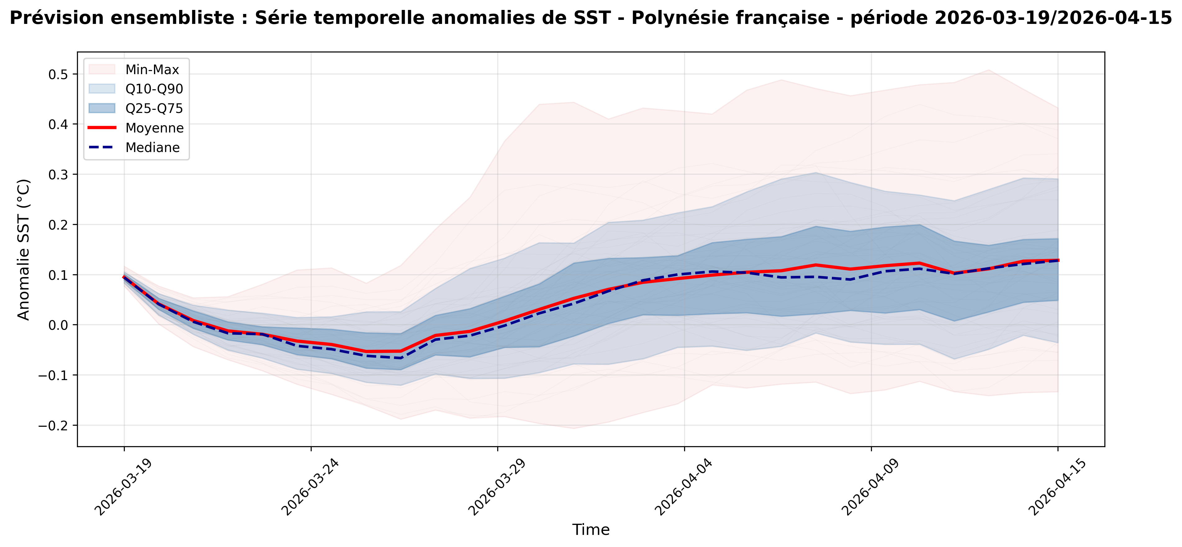 Ces figures représentent l’évolution des anomalies de températures de surface, moyennées sur la région d’étude. On y voit donc l’ensemble de la distribution des membres de GLOENS, en plus de la moyenne et des principaux quantiles d’ensemble.