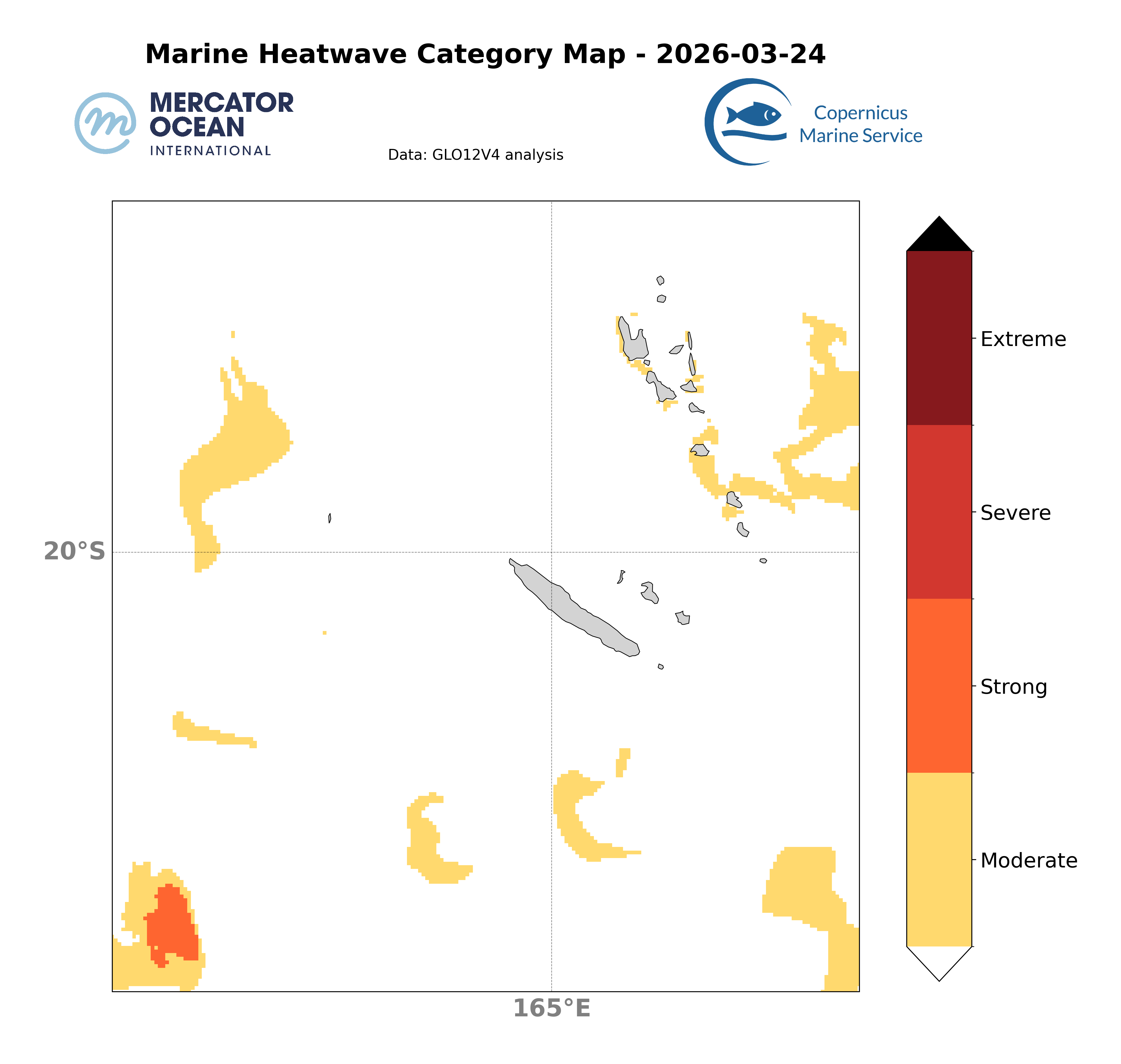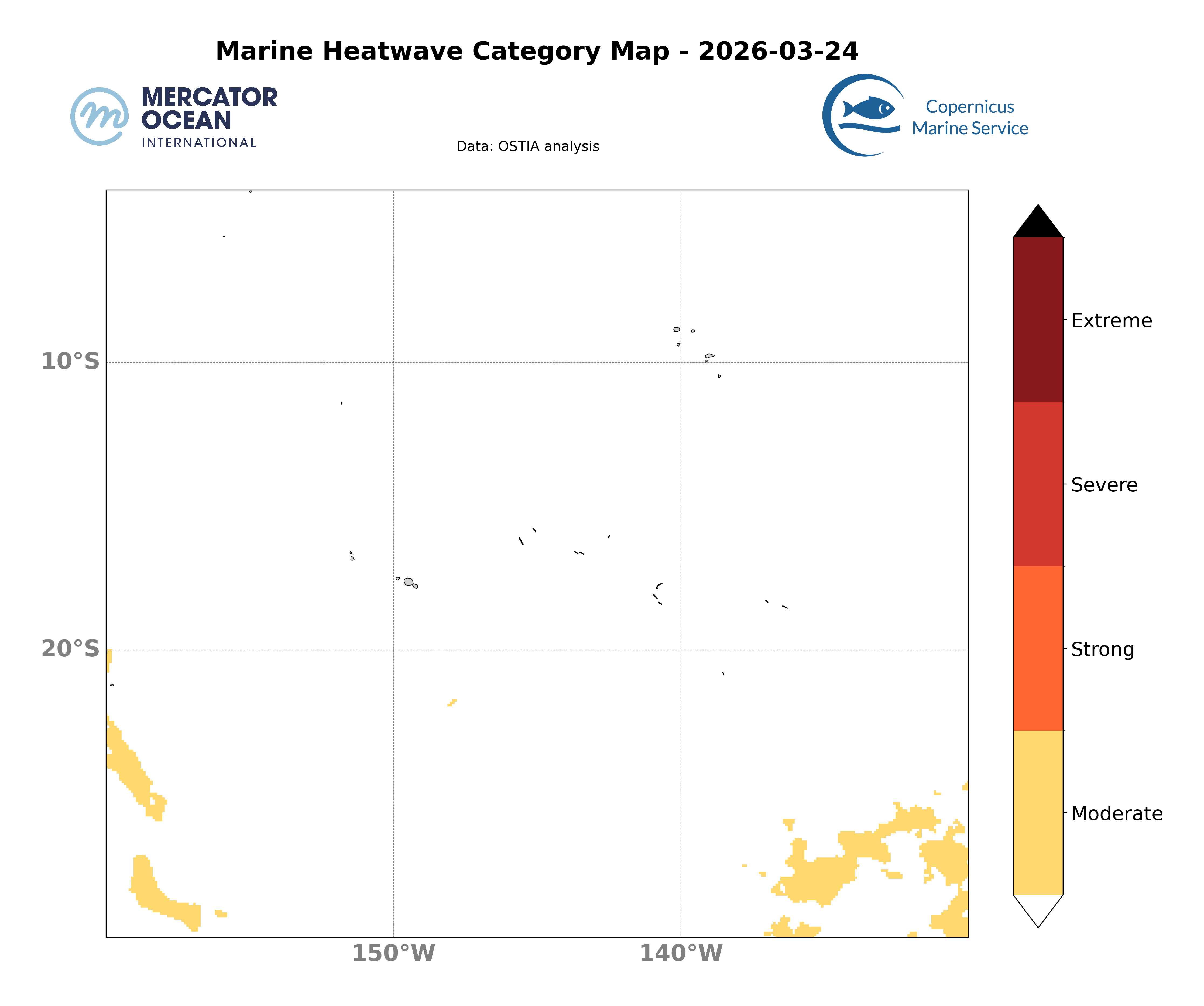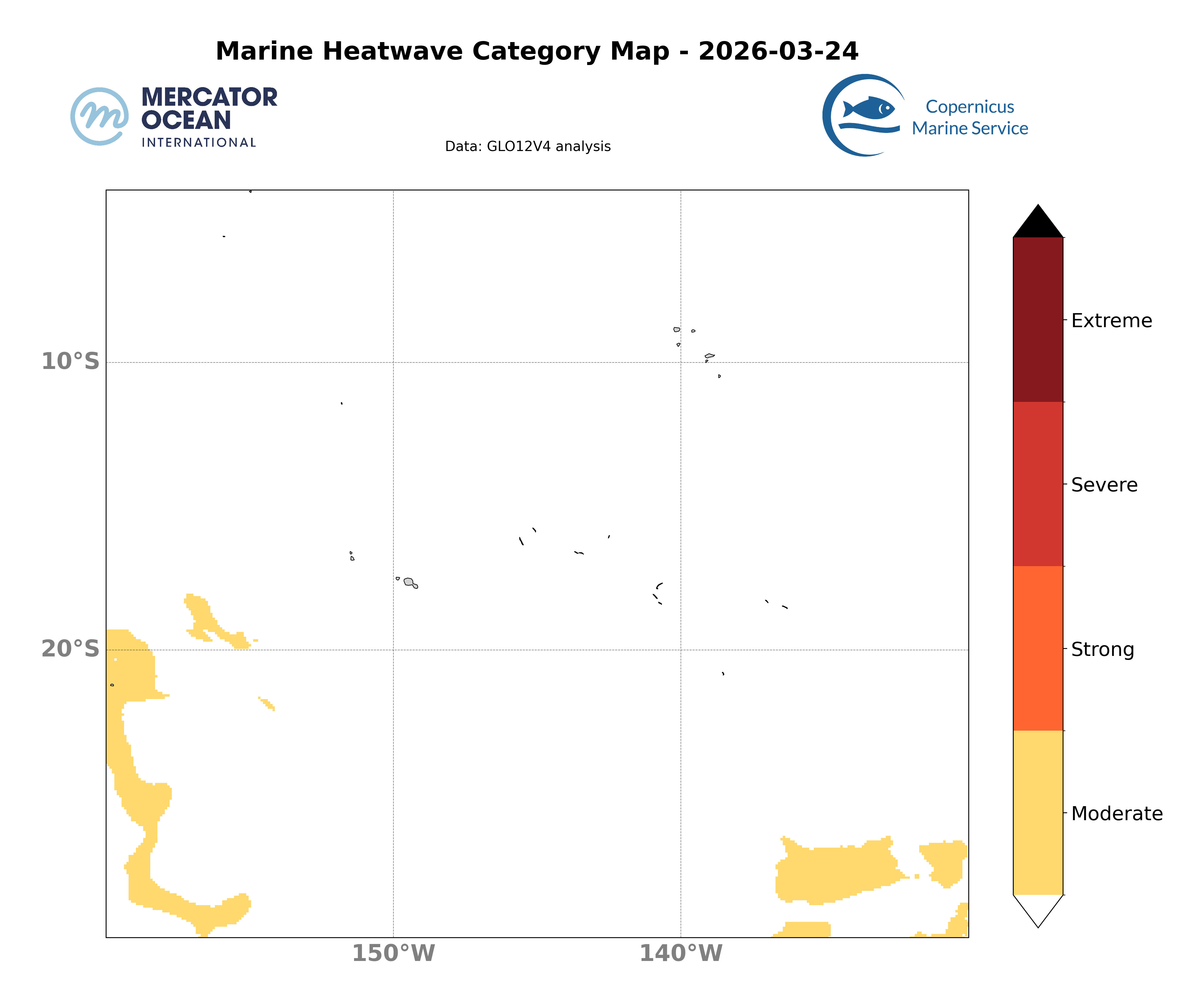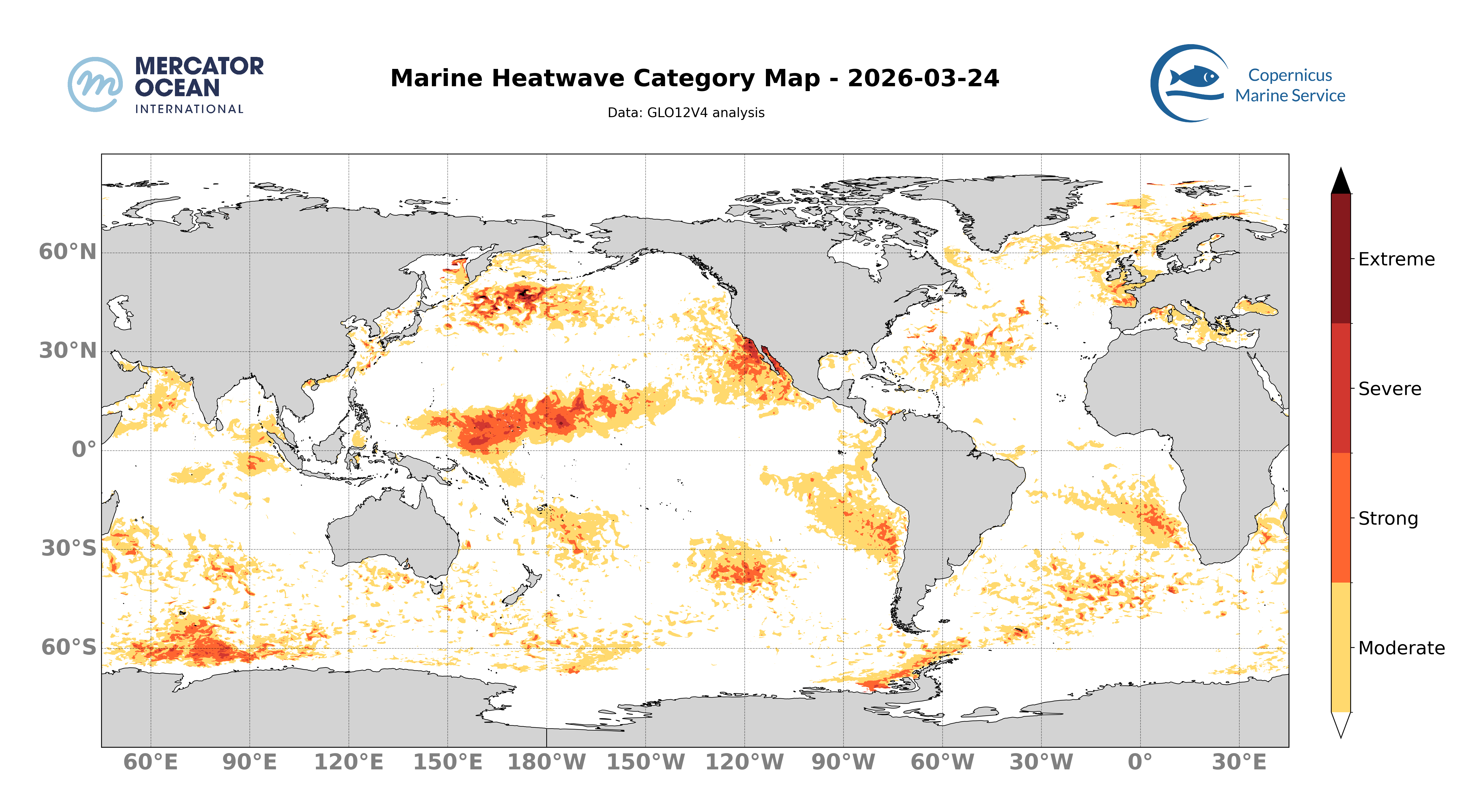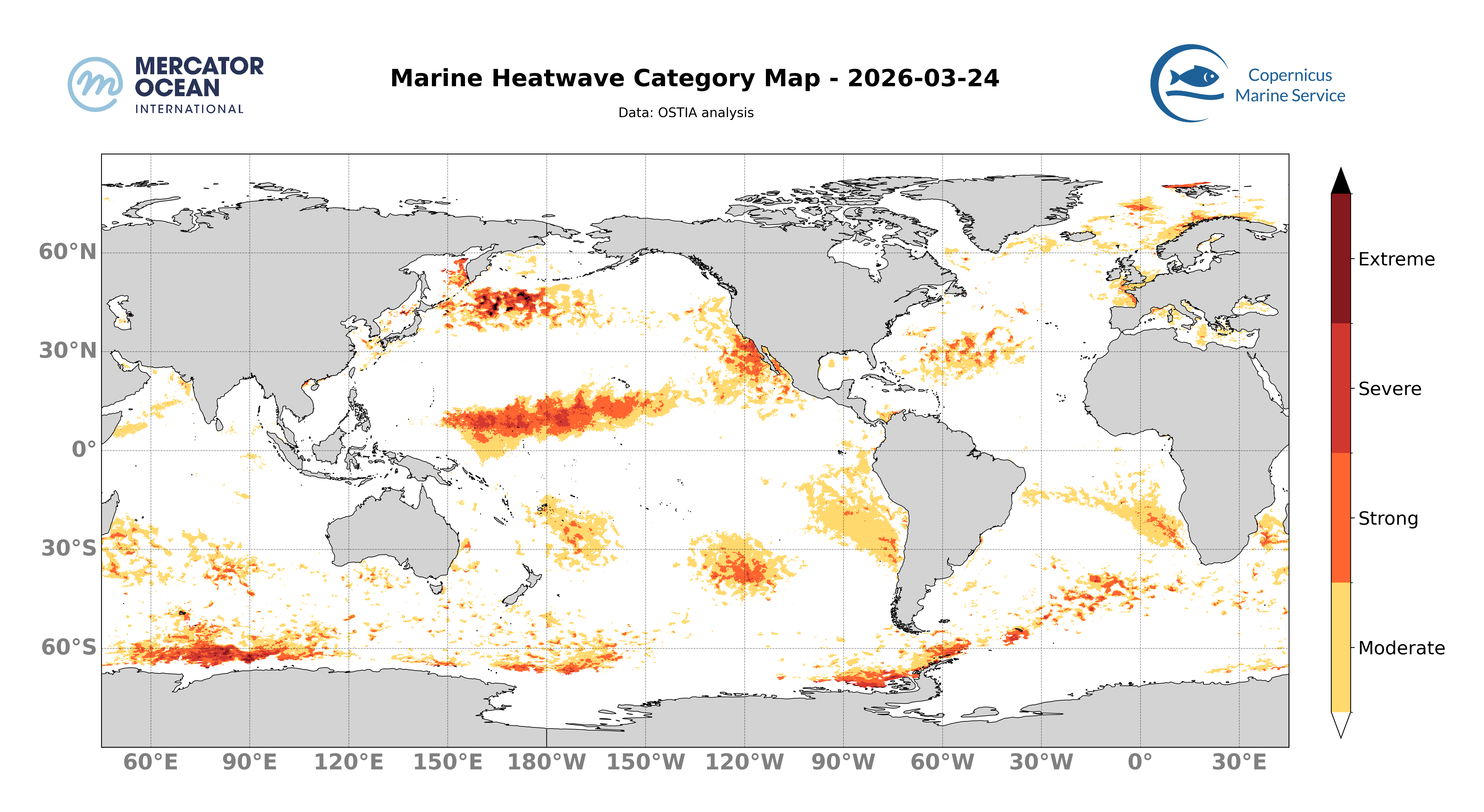 Les cartes ci-dessus montrent les dernières analyses Mercator du système opérationnel (GLO12) concernant la présence spatiale d’un évènement de vague de chaleur ainsi que la catégorie associée à l’échelle d’un domaine.