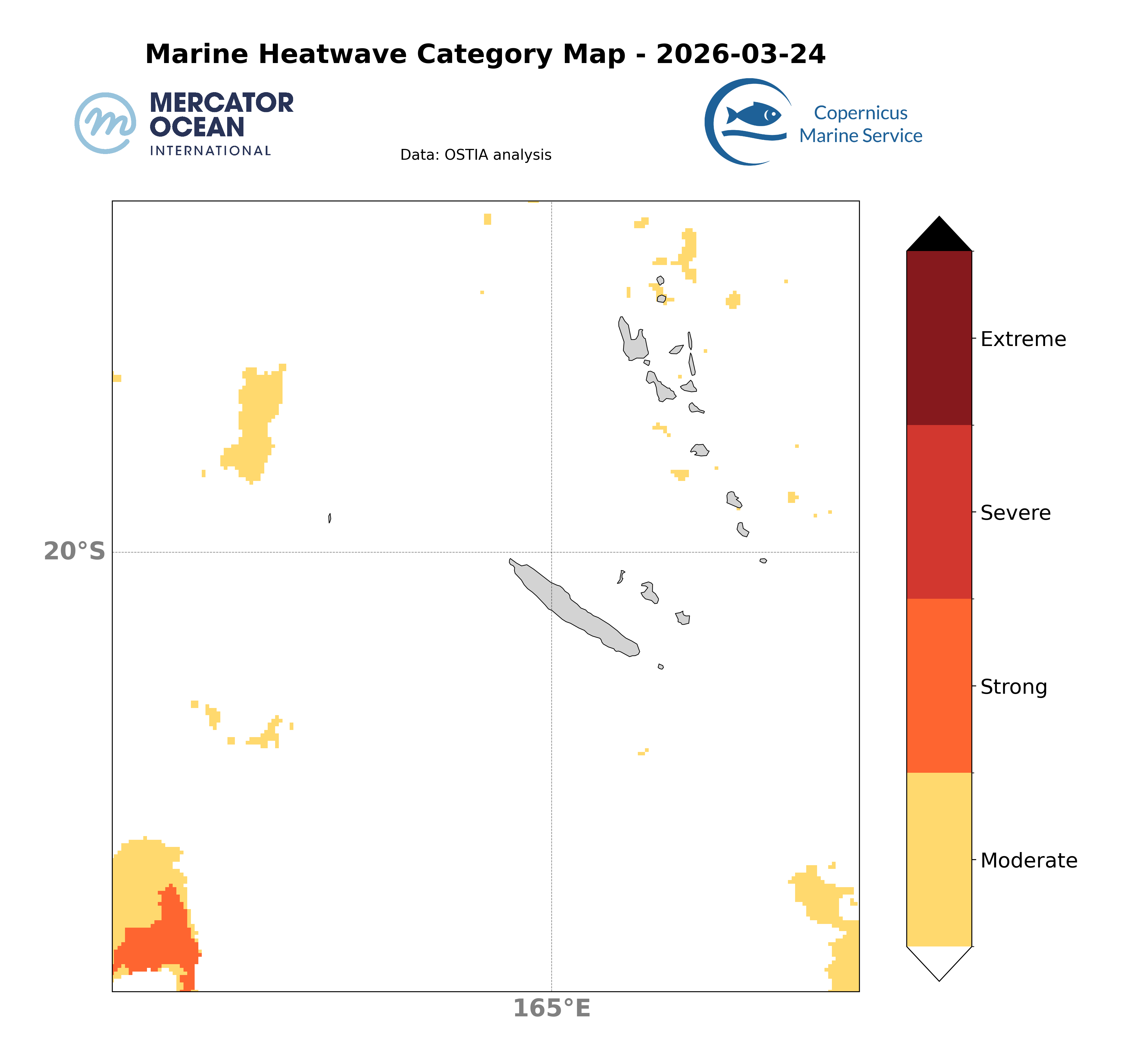 Les cartes ci-dessus montrent les dernières observations du satellite OSTIA concernant la présence spatiale d’un évènement de vague de chaleur ainsi que la catégorie associée à l’échelle d’un domaine.