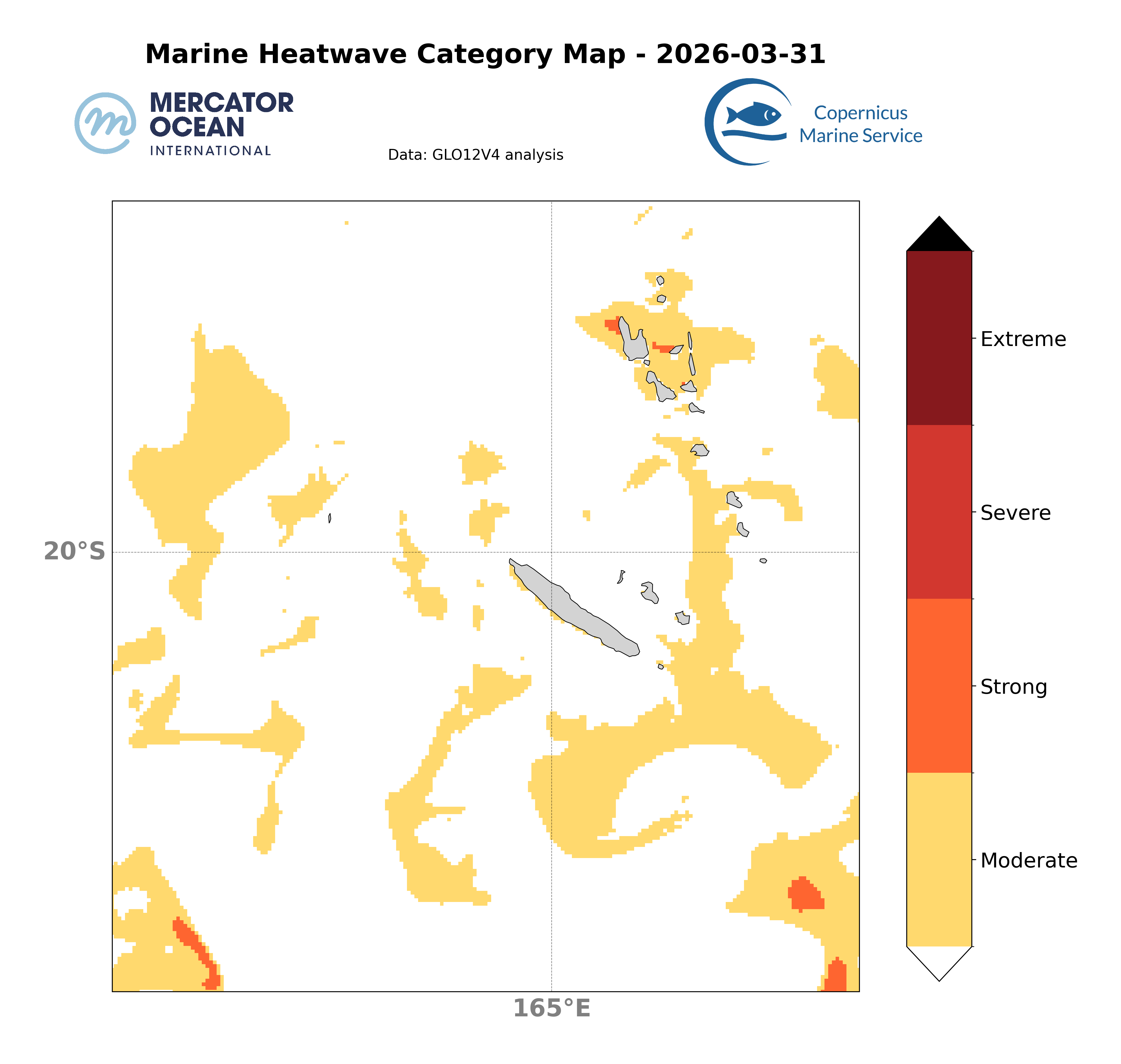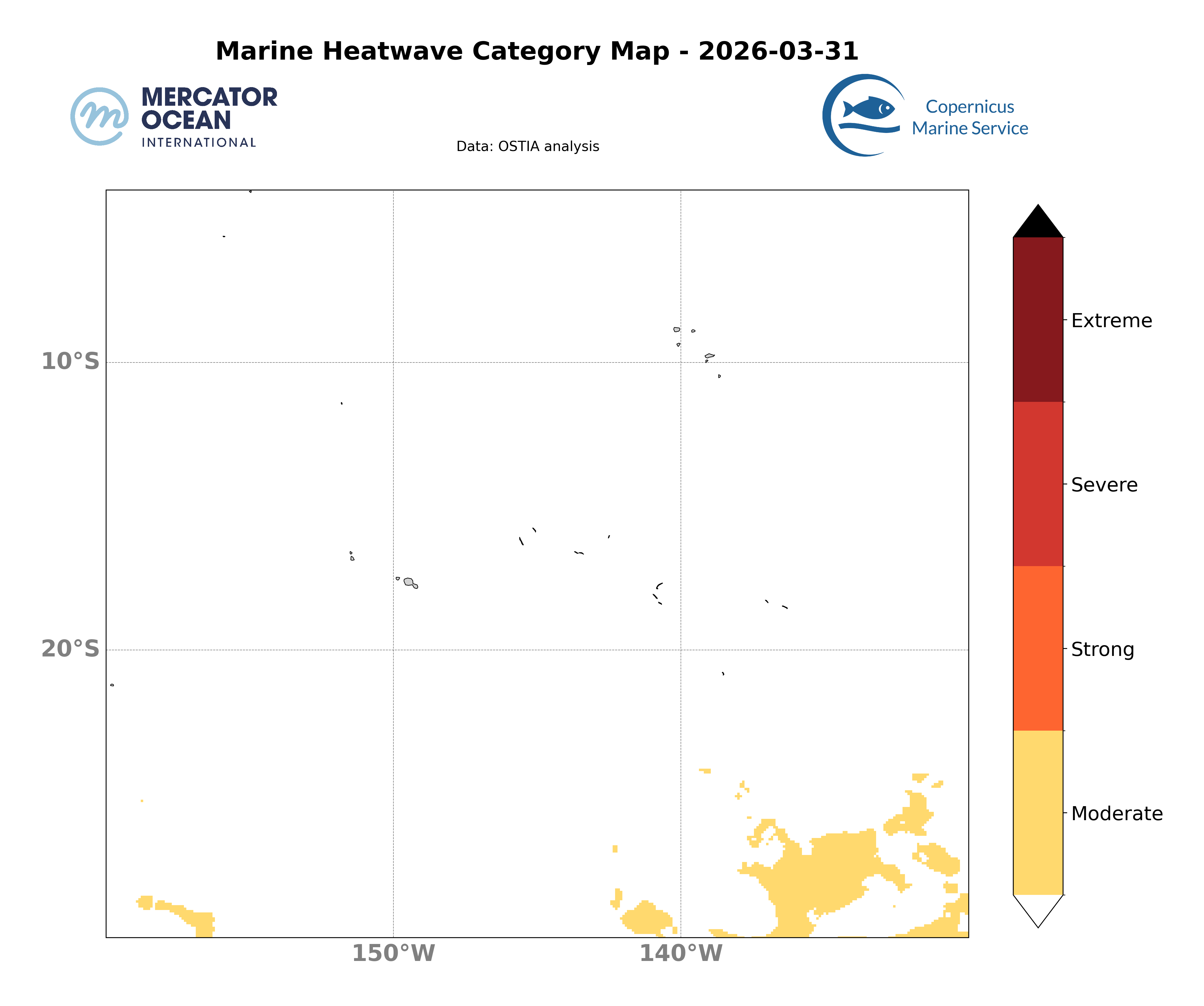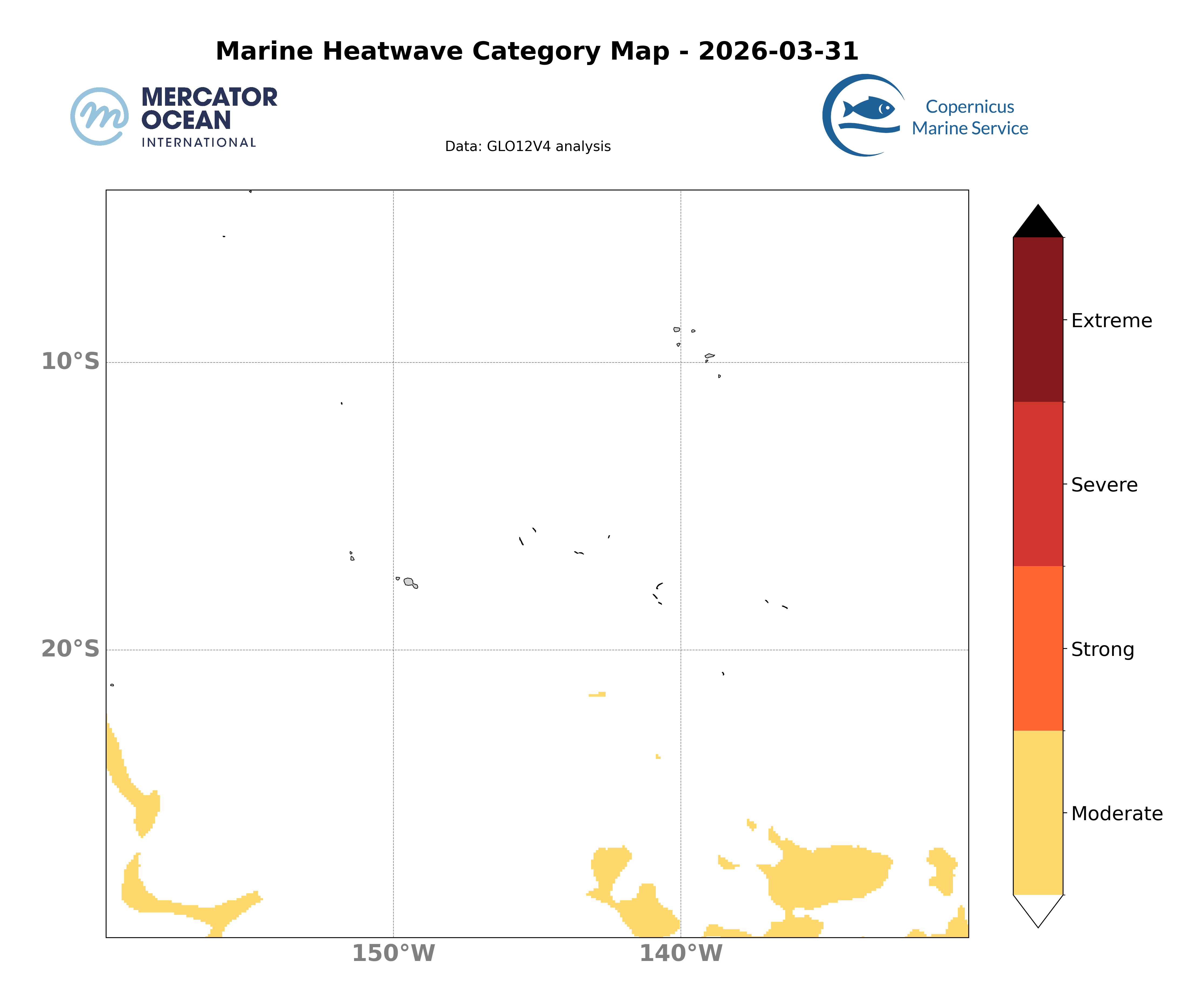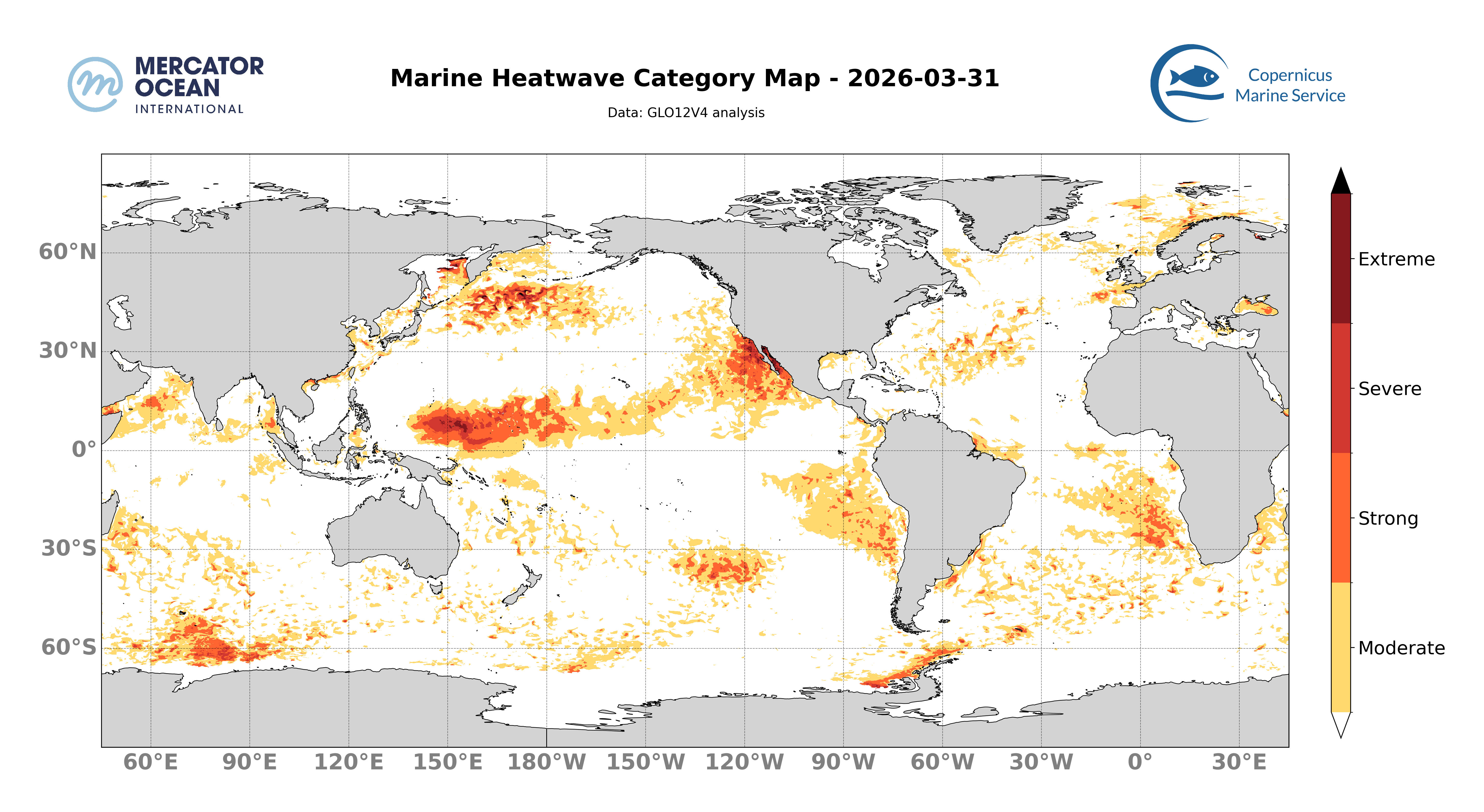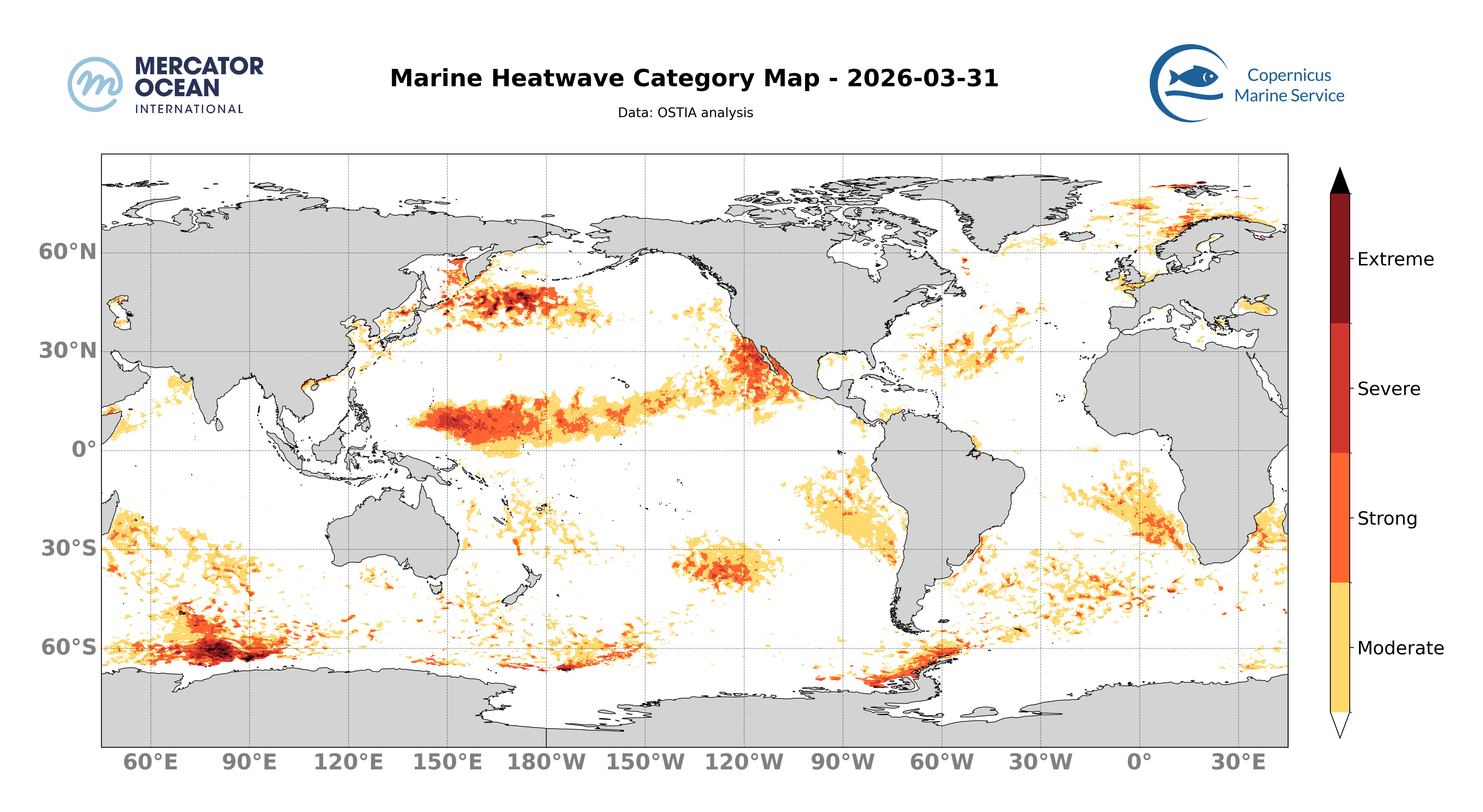 Les cartes ci-dessus montrent les dernières analyses Mercator du système opérationnel (GLO12) concernant la présence spatiale d’un évènement de vague de chaleur ainsi que la catégorie associée à l’échelle d’un domaine.