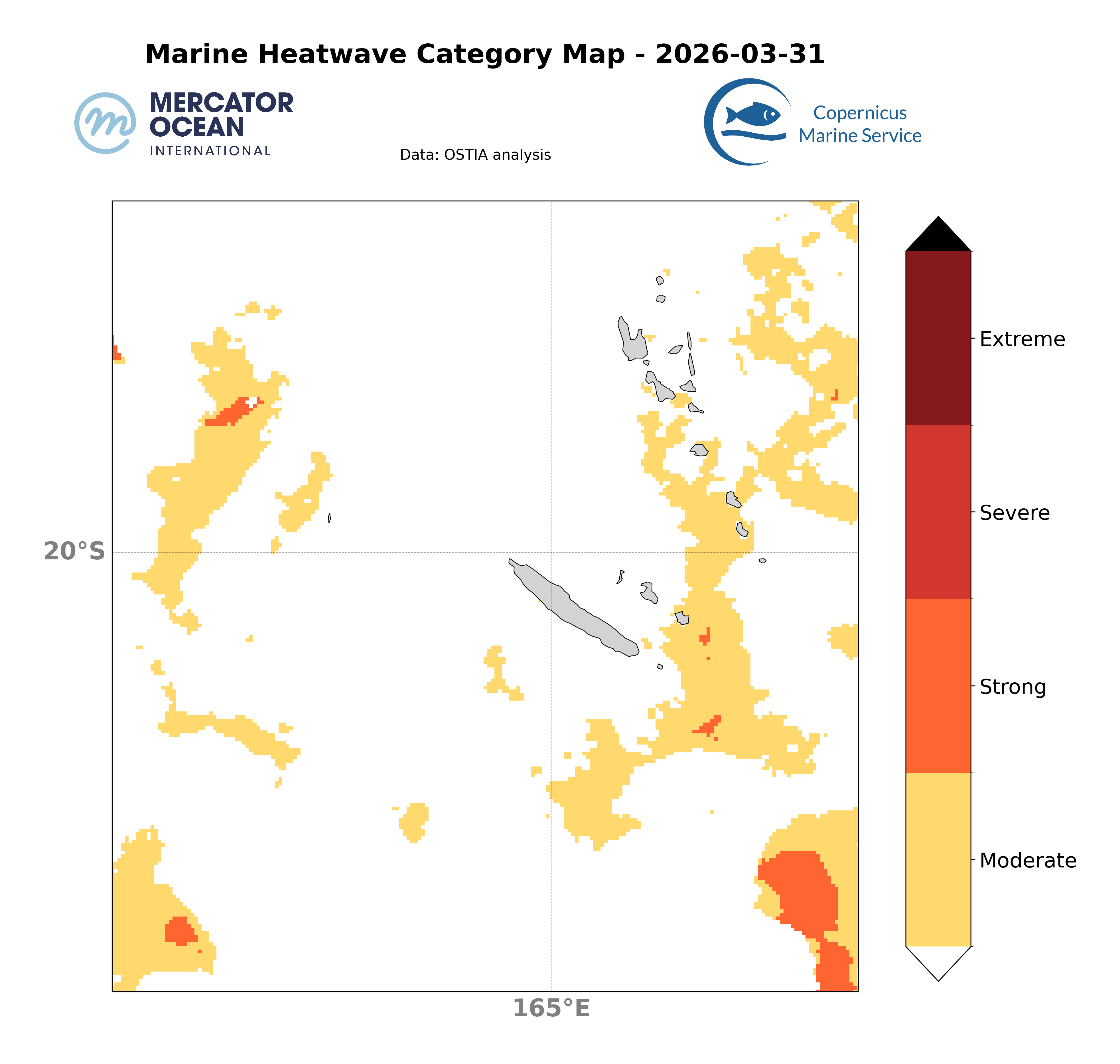 Les cartes ci-dessus montrent les dernières observations du satellite OSTIA concernant la présence spatiale d’un évènement de vague de chaleur ainsi que la catégorie associée à l’échelle d’un domaine.
