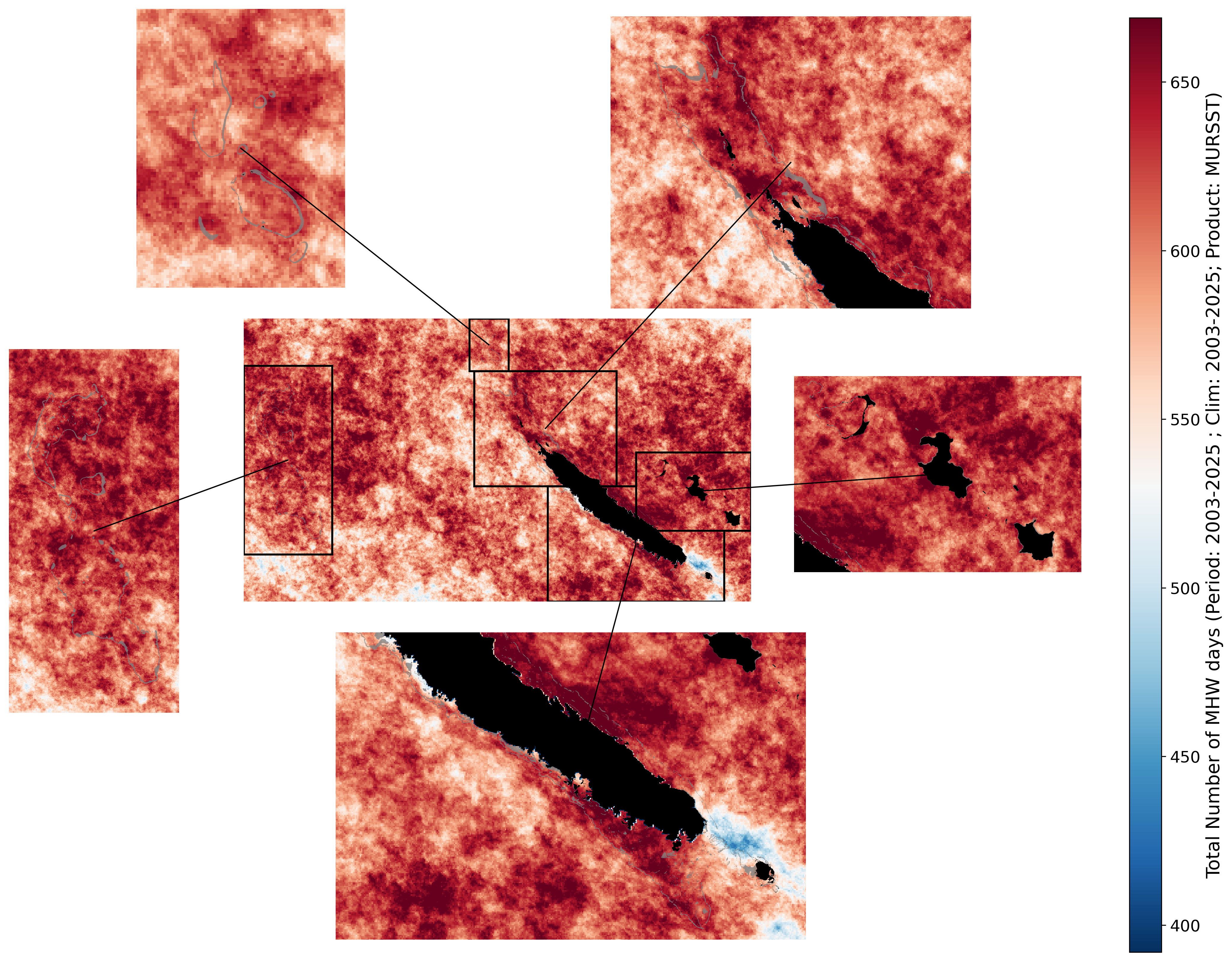 - La Figure de gauche informe sur le nombre total de jours défini en canicule marine durant la période 2003 - 2025 en chaque point de pixel.
