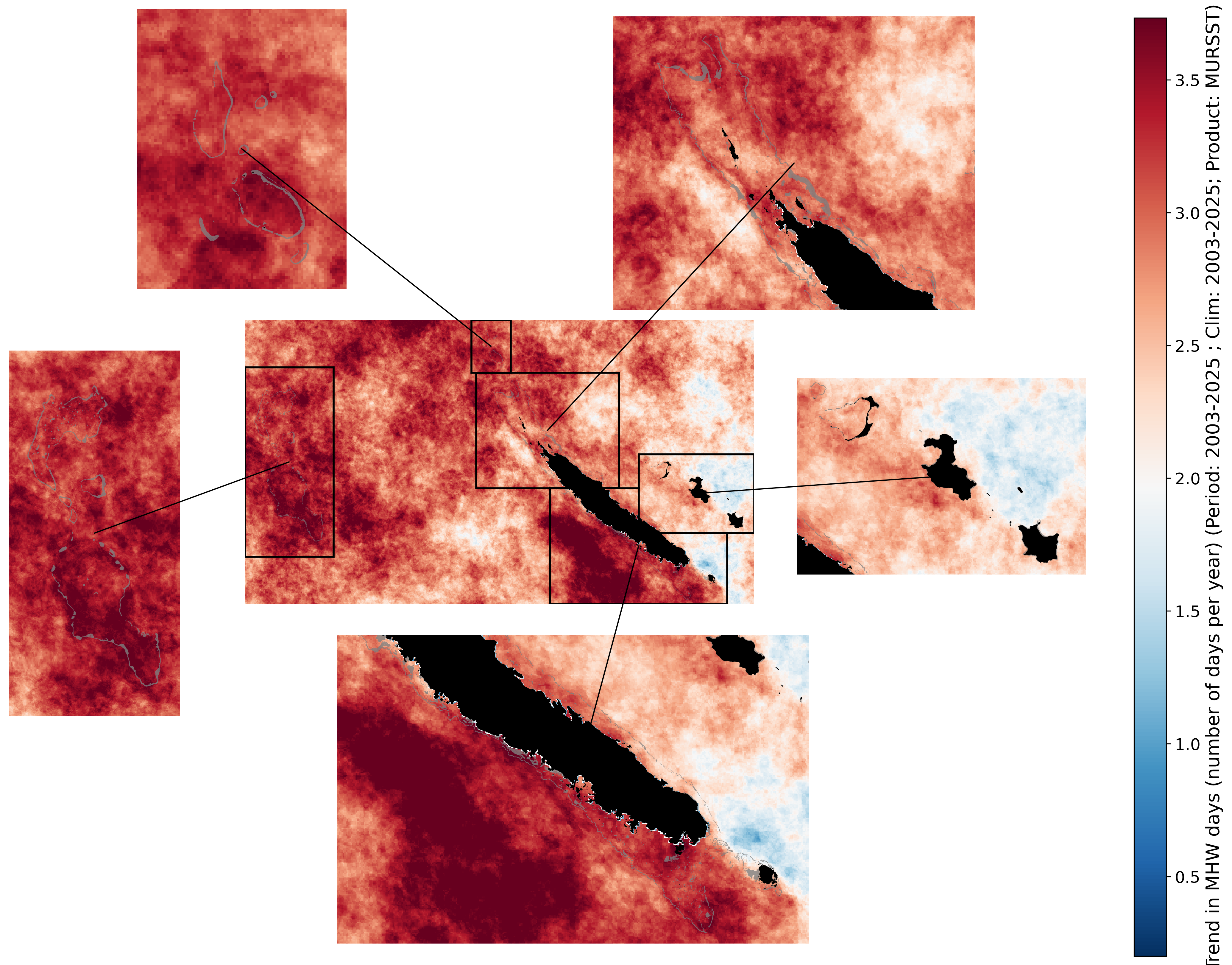 - La Figure de droite informe sur la tendance moyenne du nombre de jours de canicule marine sur la période 2003 - 2025 en chaque point de pixel.