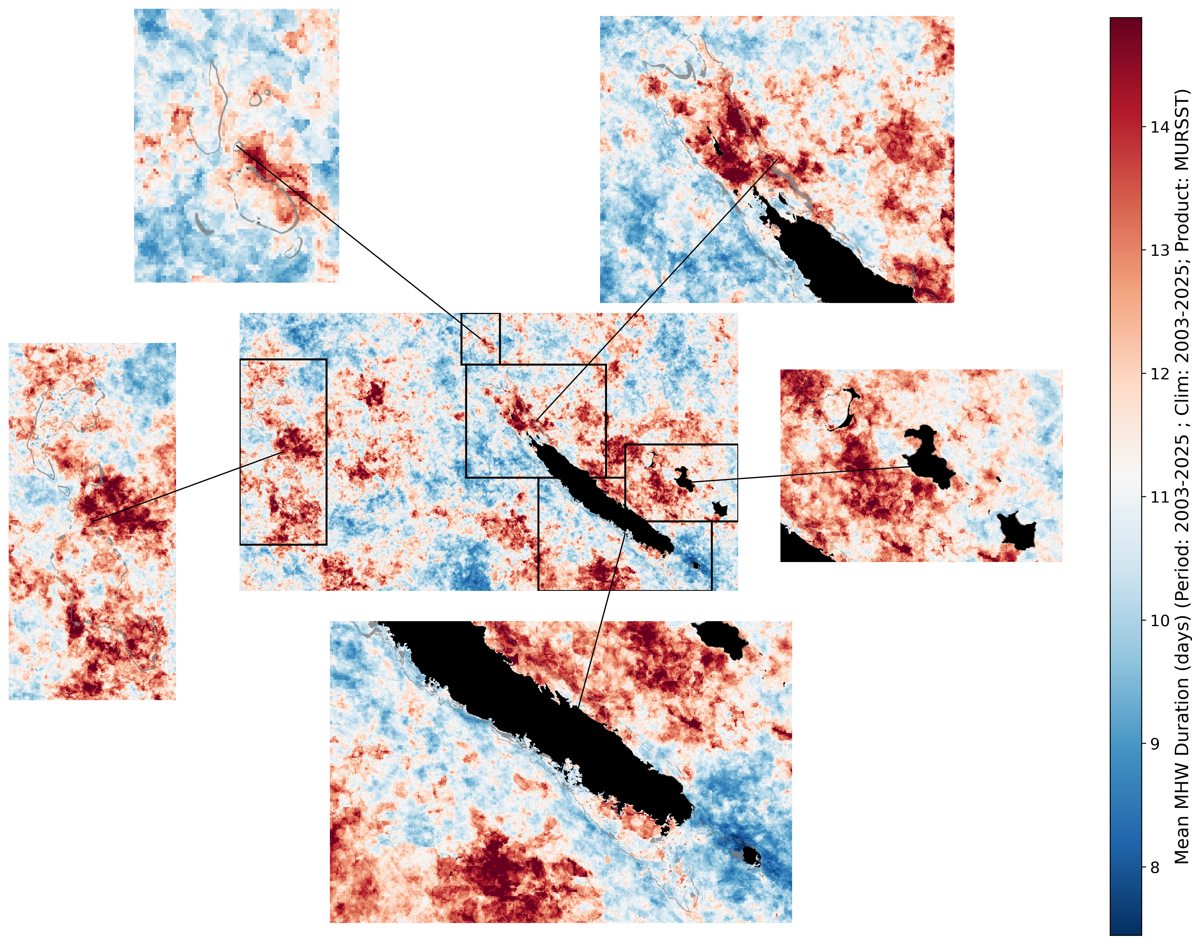 - La Figure de gauche informe sur la durée moyenne en jours des canicule marine durant la période 2003 - 2025 en chaque point de pixel.