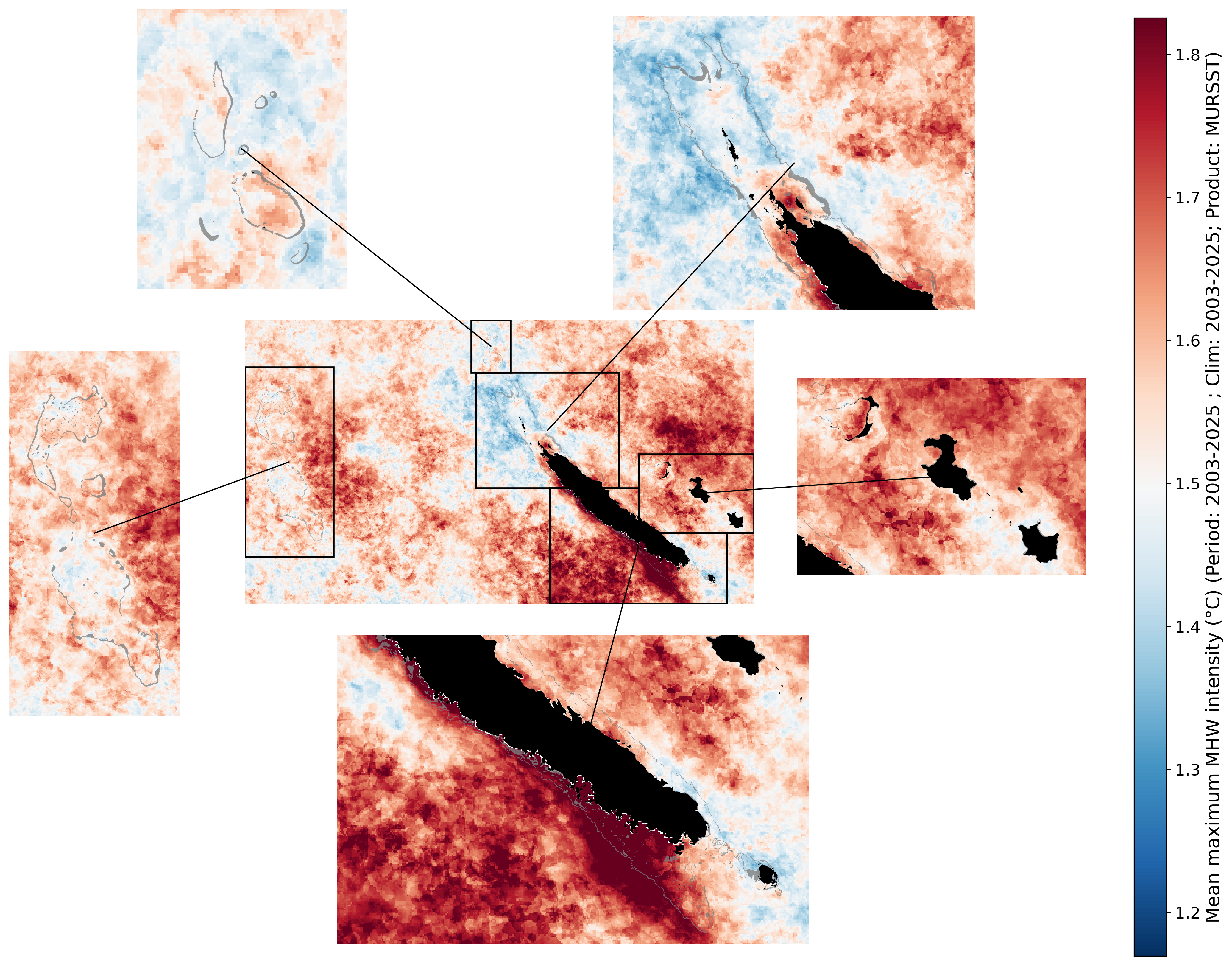 - La Figure de droite informe sur l’intensité (°C) maximum moyenne sur la période 2003 - 2025 en chaque point de pixel.